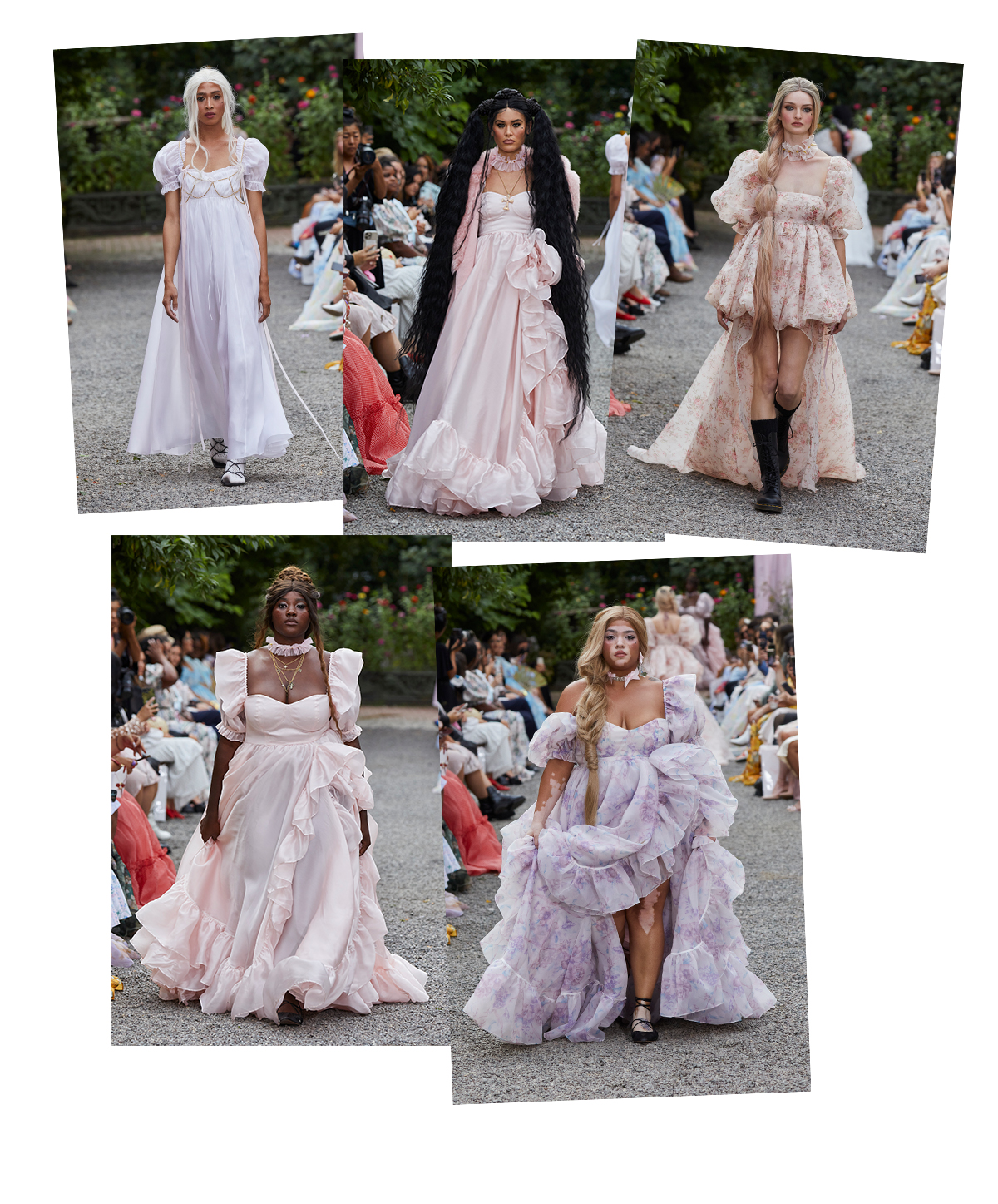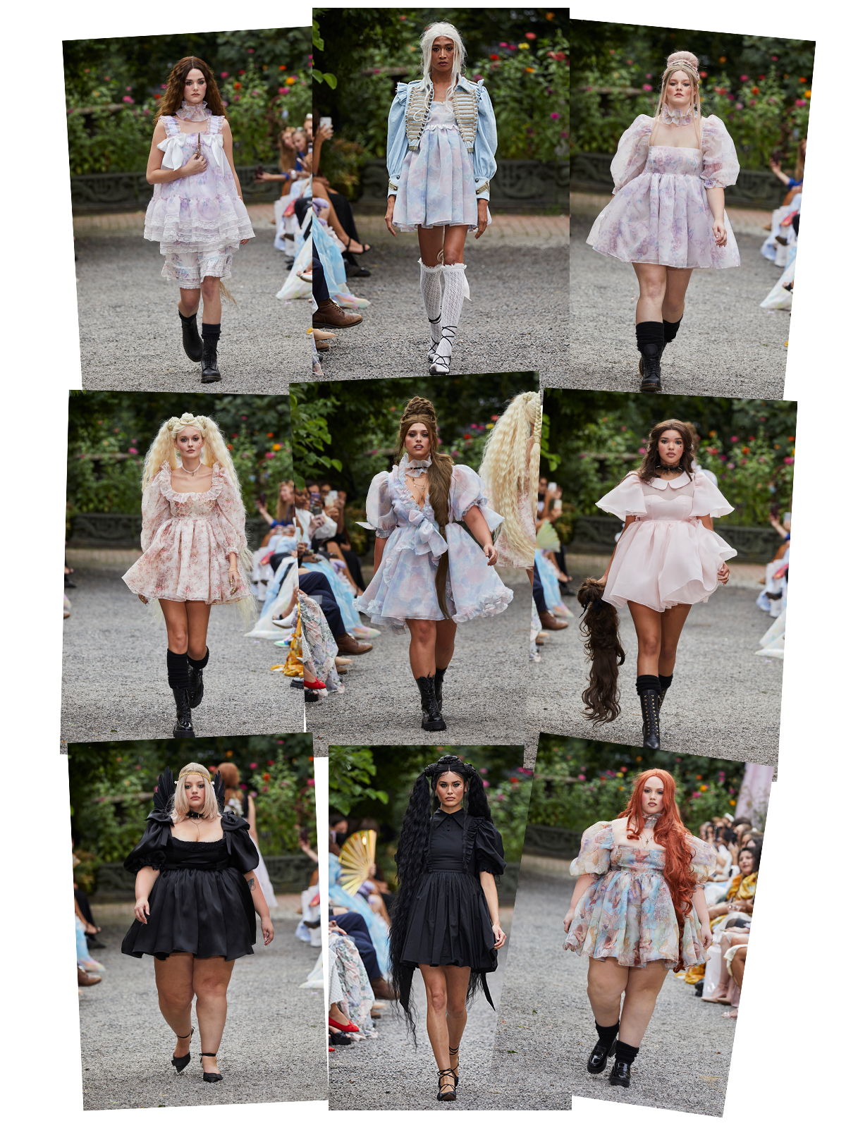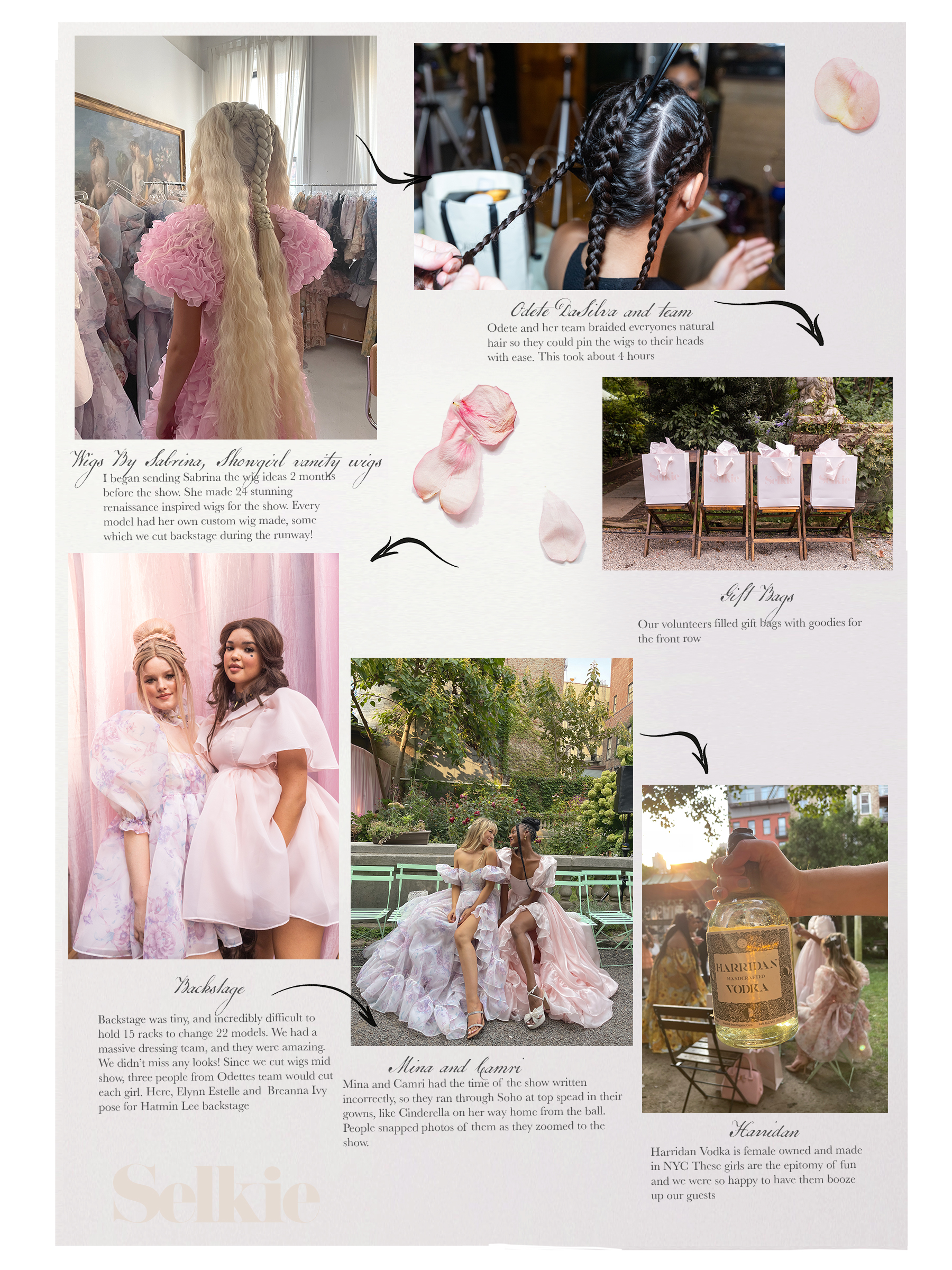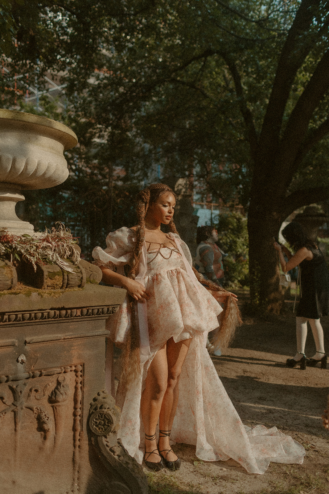 Selkie at fashion week could only be described in one word- surreal, for a multitude of reasons! Watching your brand grow from concept to reality is an indescribable experience, full of twists and unknown outcomes- good, bad, and sometimes devastating. But you find ways to survive. Selkie has in fact survived (dare we say thrived?) and as we approach the light at the end of a covid tunnel (Get Vaccinated!!) hosting a runway show felt like the perfect first step- a Doc Marten step- out of the internet and into real life. Literally! To see the work exploding into real time, stepping through a stunning park in the middle of New York city (please explore how you can help save Elizabeth St Gardens https://www.elizabethstreetgarden.com) surrounded by beautiful, powerful wxmen feels like a fairytale. You may have noticed by now that fairytales are an important way in which Selkie tells stories. Folklore is at the very core of its inception, a Selkie itself a creature of great myth. So it only felt right that it was Rapunzel who came from the darkness in our “Out of the Tower” Spring collection, as she does in her traditional story, trapped in her tower and waiting for life to begin. Not only does she seem to represent our lives in 2020/21, as covid ravaged our world and violently stole our loved ones, our jobs and our economy, but Rapunzel also represents change in that in the end she is freed. We would come out as a brand at fashion week stomping our feet for this freedom, for change minus the "prince" rescue, (thank you very much!) I also wanted this show to represent the change I’ve personally experienced. After the loss of my first brand, to be able to build back something that was taken from me has been life affirming and explosively powerful! Utilizing the joyful, delicate, happy colours of my past and present, all pastels, florals, soft beiges, frothy pinks and of course black, the collection came to be told through giant ruffles, floating gowns, vintage bloomers, baggy T shirts, cotton renaissance dresses and mini fairytale puffs. A dreamy, passionate story so feminine it transverses into punk- “Yep. I’m wearing a ball gown out tonight, so what?” We flew in Arianna Davis, a dancer and my muse, she invokes frisson and tears with her dynamic choreography, her dance transitions us on the runway from the tower to our freedom, cutting her hair live on the runway to tell this story of change. We cut our hair in times of change in a move to regain our power. This spiritual disruption bravely invites the new, and even though we are terrified for what may come, we know our lives will and must change! The collection is a salute to female freedom! It is a walking pastel pink flag crying out “Change is coming!”