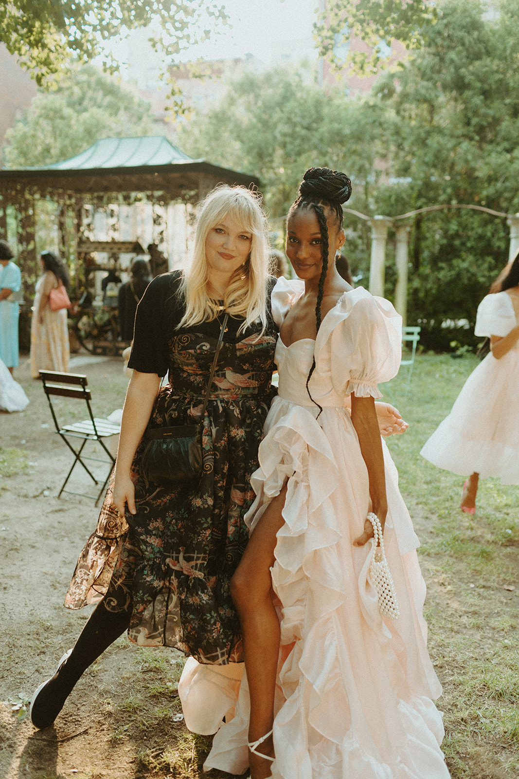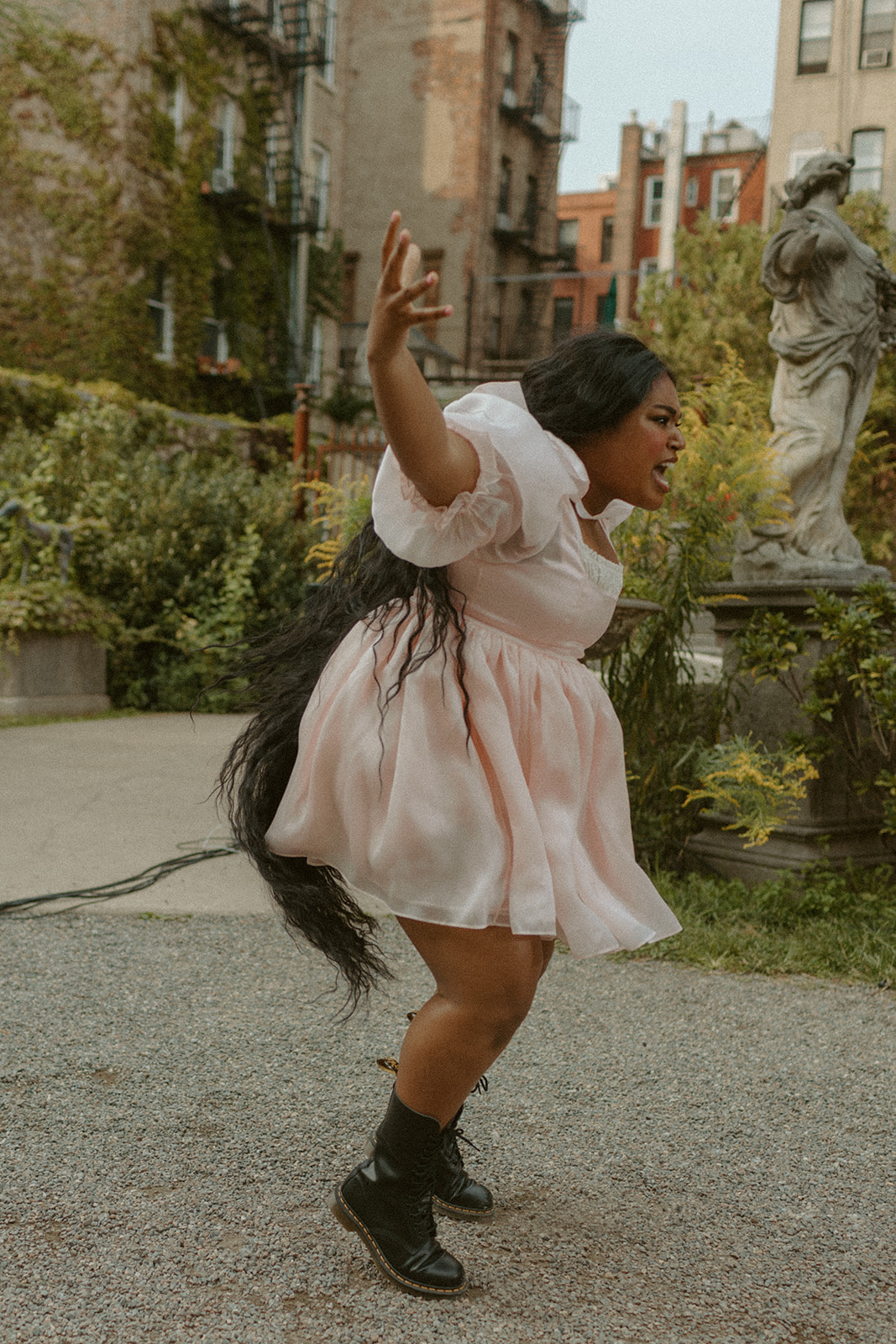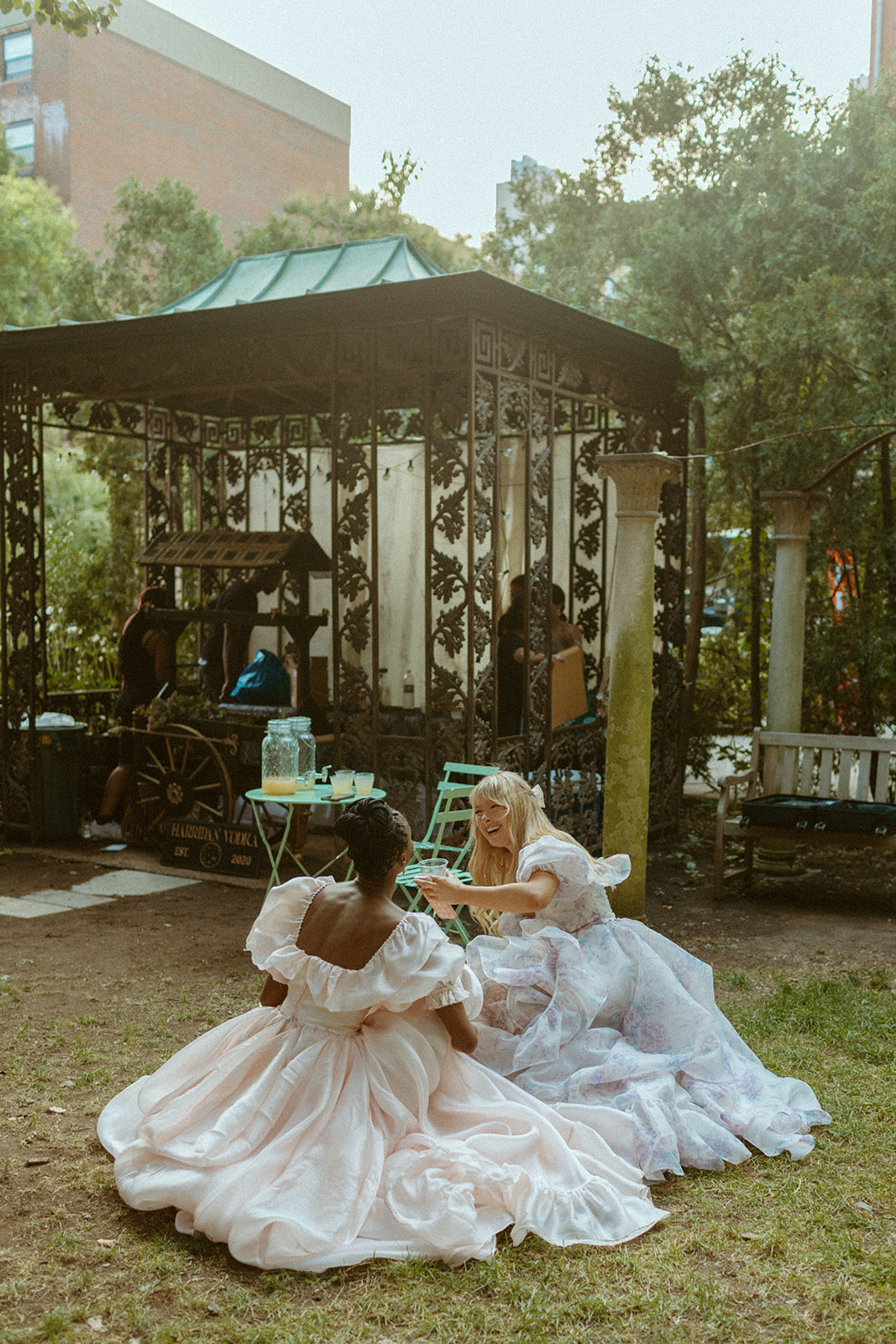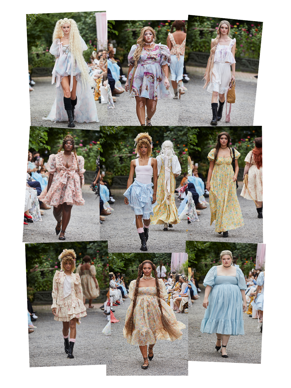 Selkie at fashion week could only be described in one word- surreal, for a multitude of reasons! Watching your brand grow from concept to reality is an indescribable experience, full of twists and unknown outcomes- good, bad, and sometimes devastating. But you find ways to survive. Selkie has in fact survived (dare we say thrived?) and as we approach the light at the end of a covid tunnel (Get Vaccinated!!) hosting a runway show felt like the perfect first step- a Doc Marten step- out of the internet and into real life. Literally! To see the work exploding into real time, stepping through a stunning park in the middle of New York city (please explore how you can help save Elizabeth St Gardens https://www.elizabethstreetgarden.com) surrounded by beautiful, powerful wxmen feels like a fairytale. You may have noticed by now that fairytales are an important way in which Selkie tells stories. Folklore is at the very core of its inception, a Selkie itself a creature of great myth. So it only felt right that it was Rapunzel who came from the darkness in our “Out of the Tower” Spring collection, as she does in her traditional story, trapped in her tower and waiting for life to begin. Not only does she seem to represent our lives in 2020/21, as covid ravaged our world and violently stole our loved ones, our jobs and our economy, but Rapunzel also represents change in that in the end she is freed. We would come out as a brand at fashion week stomping our feet for this freedom, for change minus the "prince" rescue, (thank you very much!) I also wanted this show to represent the change I’ve personally experienced. After the loss of my first brand, to be able to build back something that was taken from me has been life affirming and explosively powerful! Utilizing the joyful, delicate, happy colours of my past and present, all pastels, florals, soft beiges, frothy pinks and of course black, the collection came to be told through giant ruffles, floating gowns, vintage bloomers, baggy T shirts, cotton renaissance dresses and mini fairytale puffs. A dreamy, passionate story so feminine it transverses into punk- “Yep. I’m wearing a ball gown out tonight, so what?” We flew in Arianna Davis, a dancer and my muse, she invokes frisson and tears with her dynamic choreography, her dance transitions us on the runway from the tower to our freedom, cutting her hair live on the runway to tell this story of change. We cut our hair in times of change in a move to regain our power. This spiritual disruption bravely invites the new, and even though we are terrified for what may come, we know our lives will and must change! The collection is a salute to female freedom! It is a walking pastel pink flag crying out “Change is coming!”