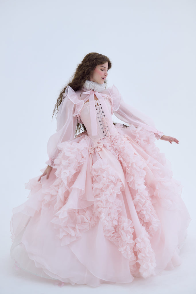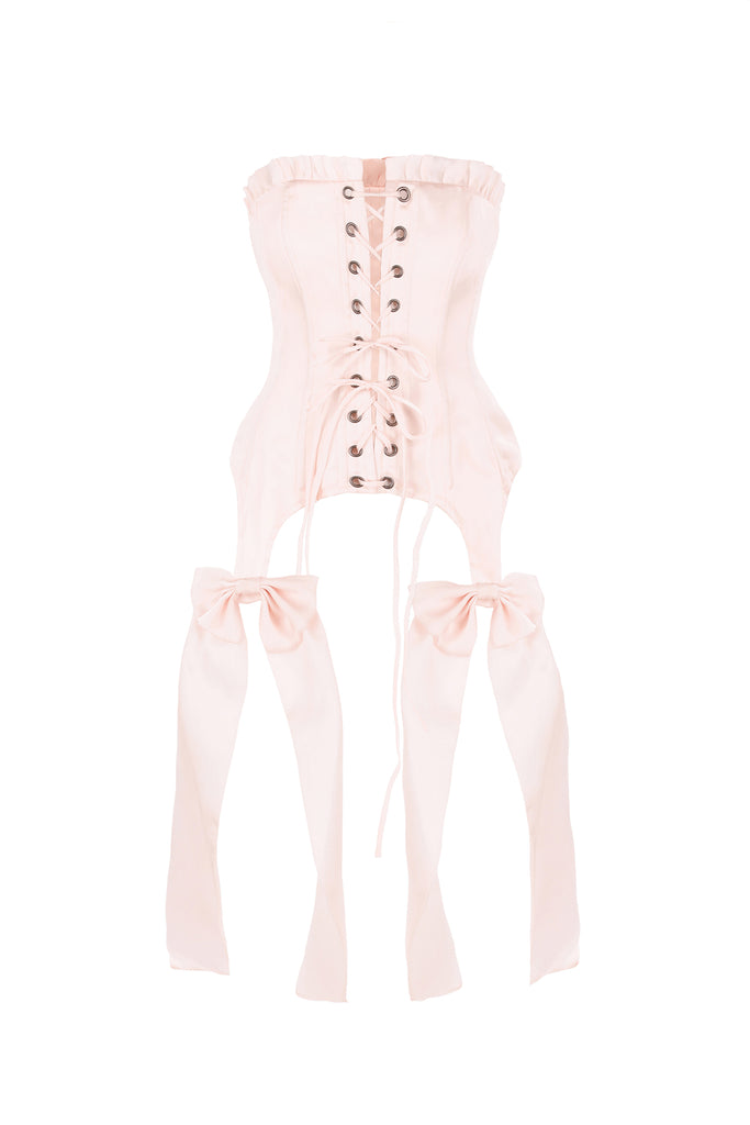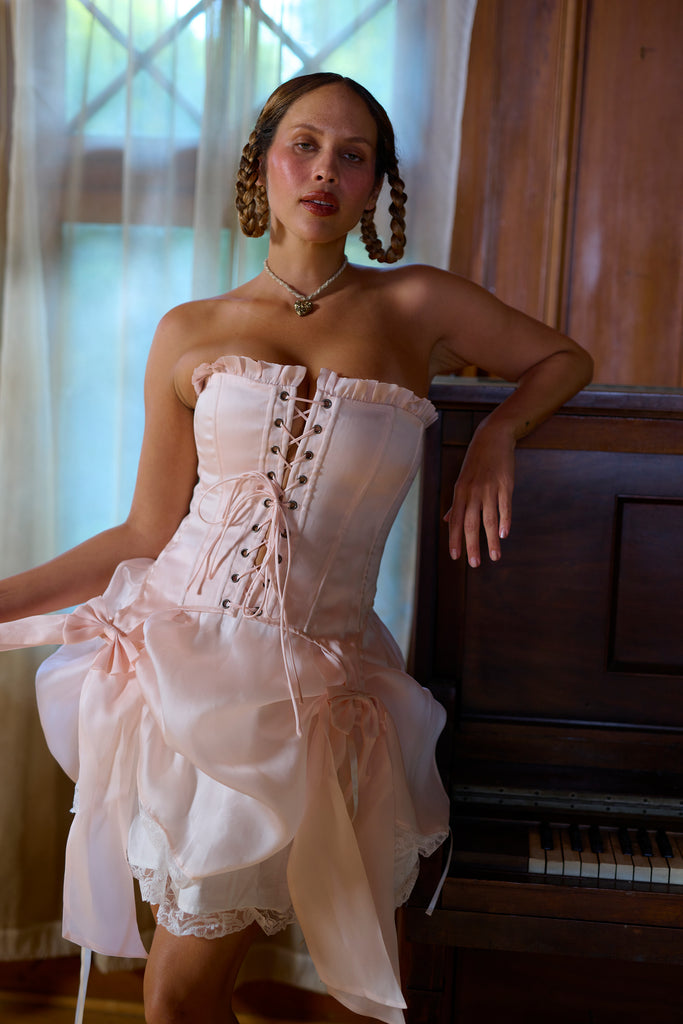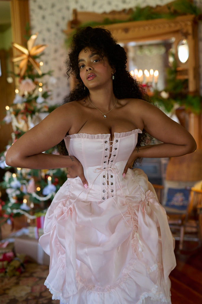 Strapless and fully-boned, the A La Mode Corset is designed to make you feel ravishingly beautiful—two fully adjustable draw cords lace up the center, so you may cinch it as you please. Tiny ruffle details at the bust add additional femininity, and garter bows descend below the waist. Savor the visual decadence of Confection, where this delicate, airy pastel looks sweeter than a cream puff dusted with snow powdered sugar.