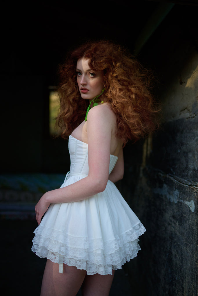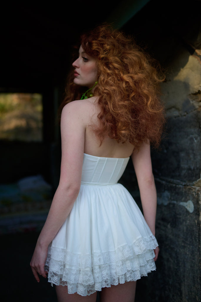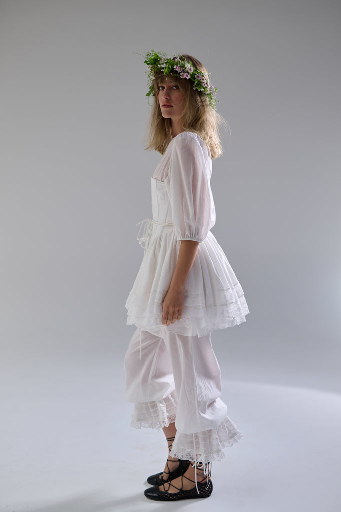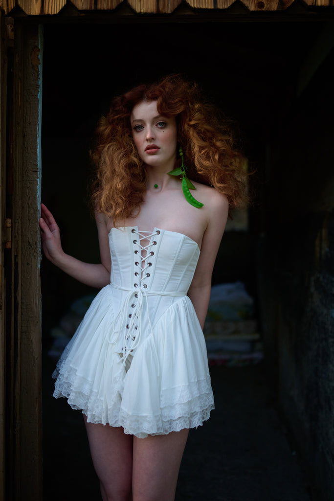 This cotton gauze Basque waist corset transforms you into storybook royalty. The delicate lace trim grazes your thighs, while front lacing with dual draw cords offers adjustable comfort worthy of the most sensitive princess. The attached skirt moves easily as you gather herbs or tend to your cottage retreat, with a discreet center back zipper for easy dressing.