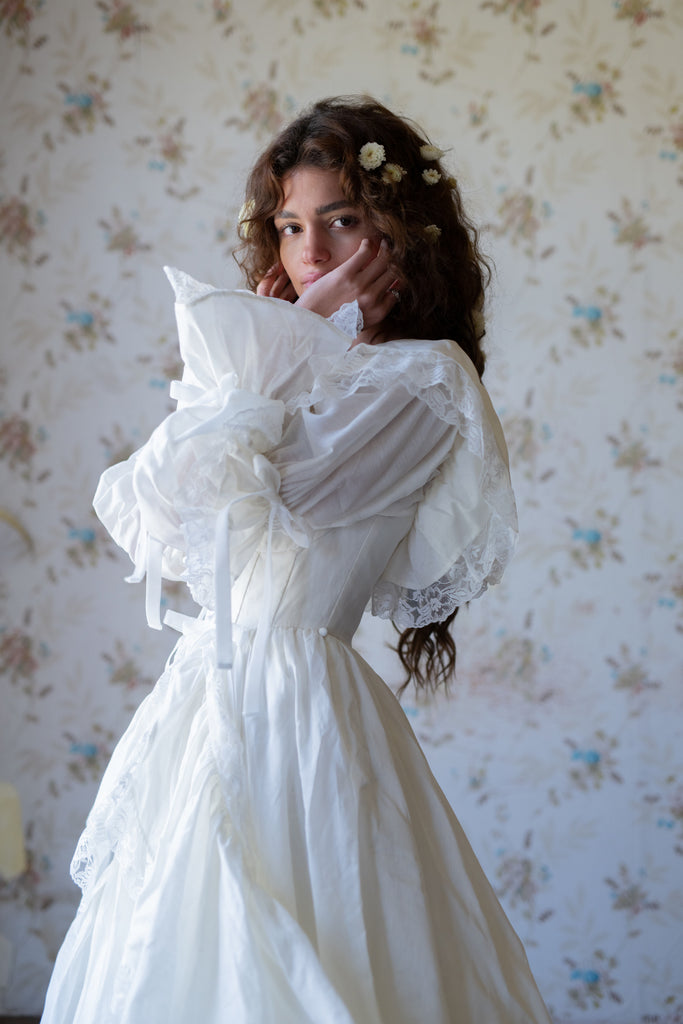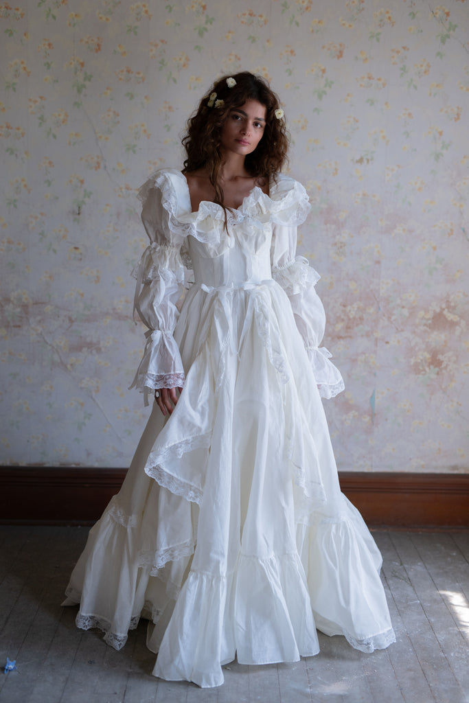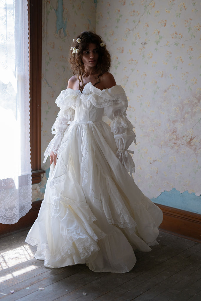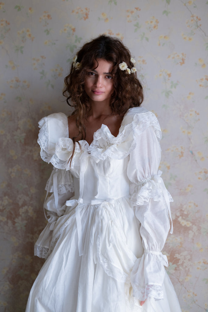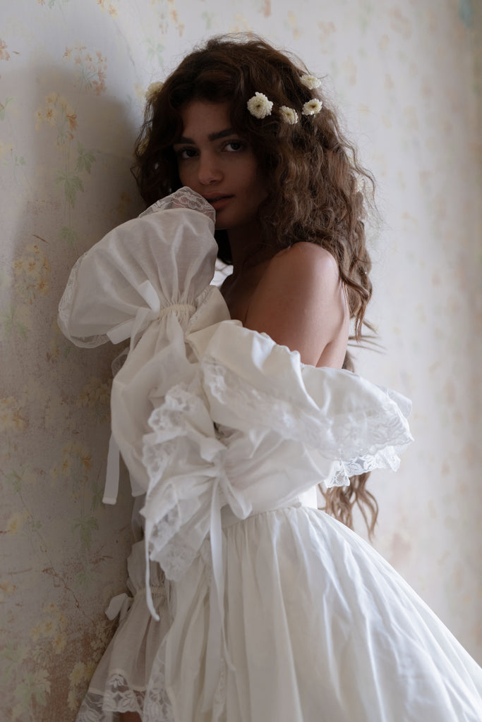 Evocative of an angelic 1960s ceremonial gown, this resplendent white confection radiates the unbridled joy and light of coming-of-age. Layers of billowing organdy drift like clouds over the pure silhouette, while the long sleeves, adorned with ties and lace trim, mirror the cinched details of the skirt. The off-the-shoulder neckline strikes a perfect balance, accentuated by charming bows at the bust, waistline, and sleeves. You won’t sacrifice style for comfort—this gown is fully lined with 100% cotton.