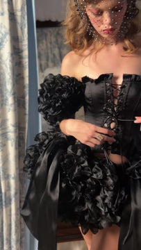 Designed to make you feel eternally ravishing, The Raven Paris Corset is a fully-boned silk satin piece fit for the most discerning Parisian vampire. Two fully adjustable draw cords lace up the center, allowing you to cinch your waist as you please. Tiny ruffle details at the bust add a touch of immortal allure, while garter bows descend below the waist. The corset is adorned with poly organza ruffled puff sleeves that float around your arms like the wings of your vampiric familiar.