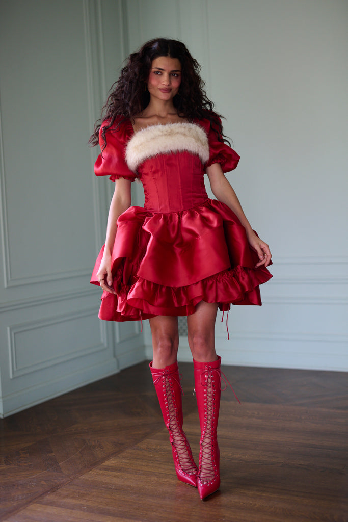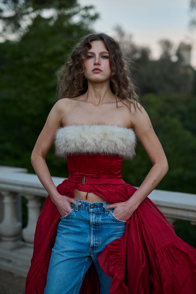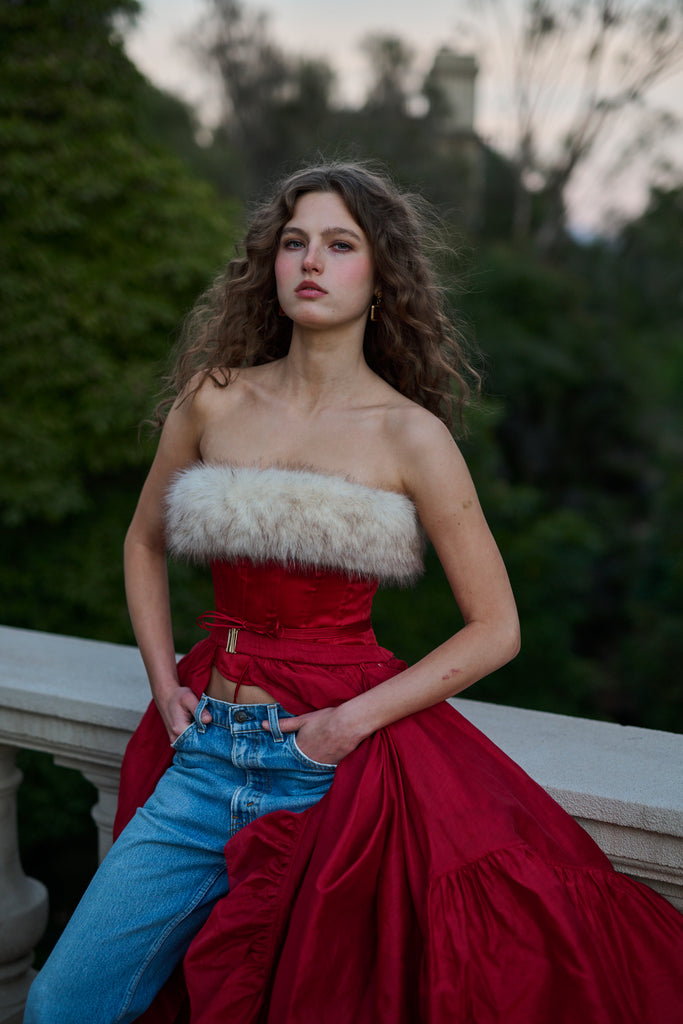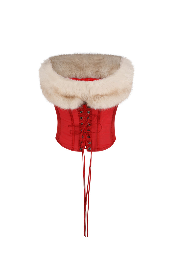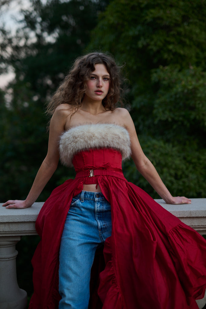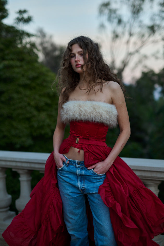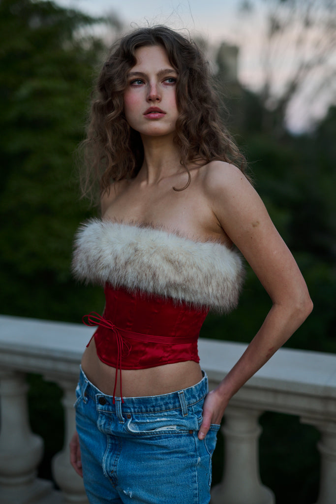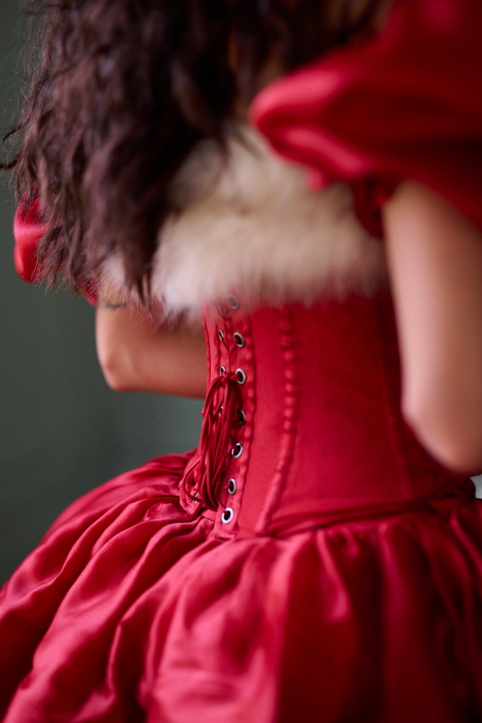 Channel your ultimate Mean Girls holiday fantasy in this fully boned silk satin corset, adorned with luxuriously realistic faux fur trim, featuring sophisticated dark-tipped detail, lush and soft as freshly fallen snow. The magic lies in its versatility - extra-long drawcords allow for perfect cinching or can be wrapped around and be decorated with tiny ornaments like red Christmas baubles, while the power mesh back ensures you'll dance comfortably through every festive soirée. Pair with The Rouge Etoile Dress or wear solo for the quintessential Santa-girl moment.