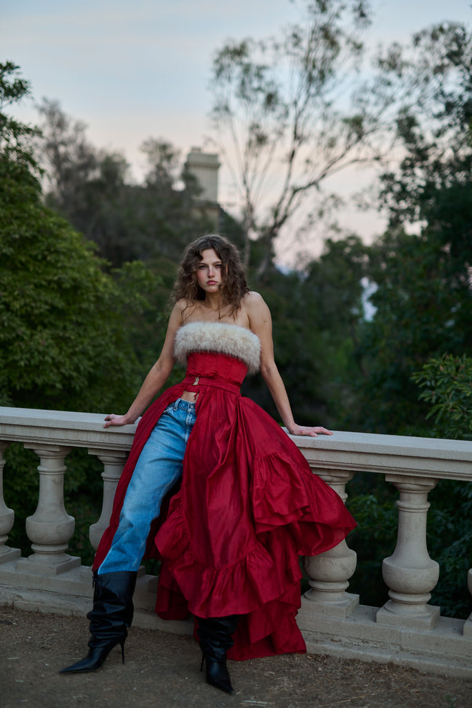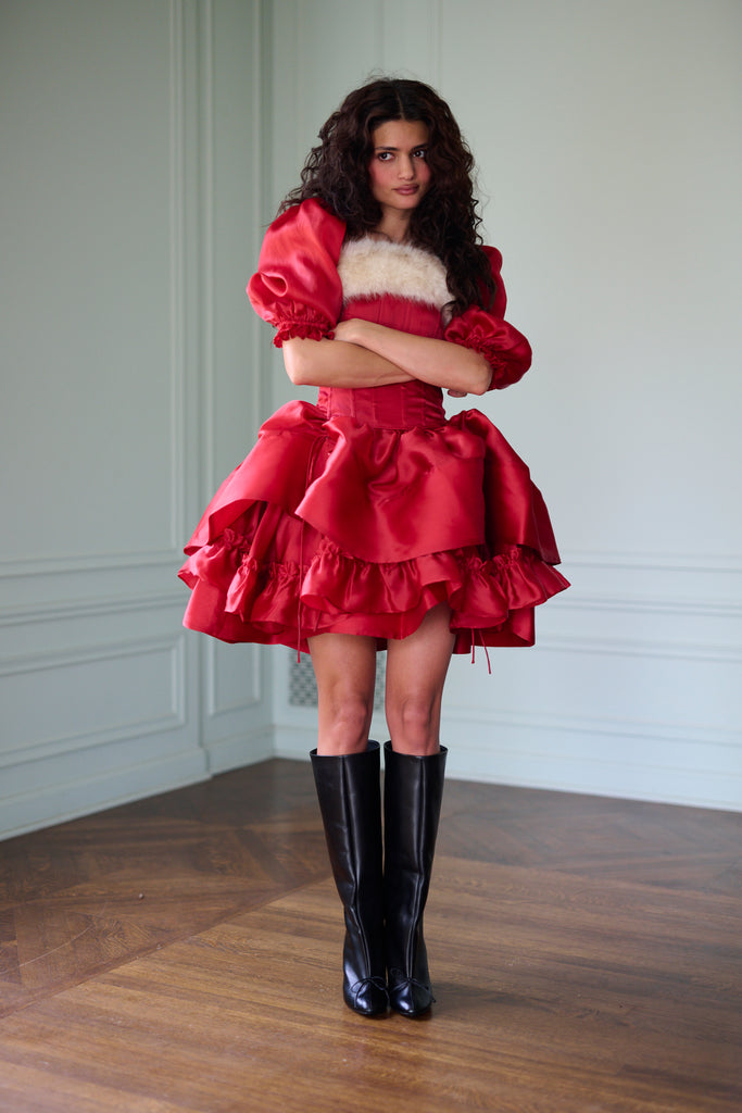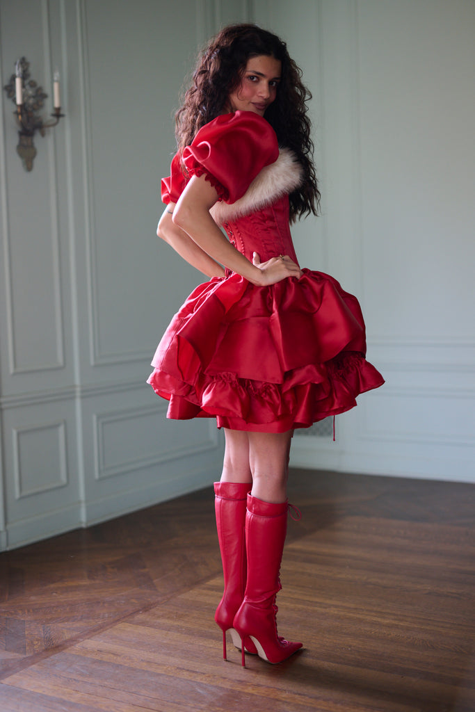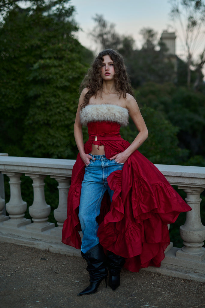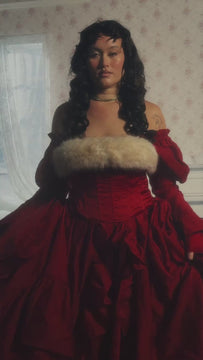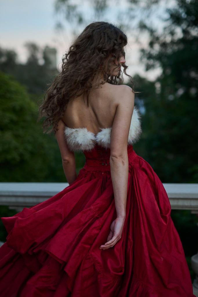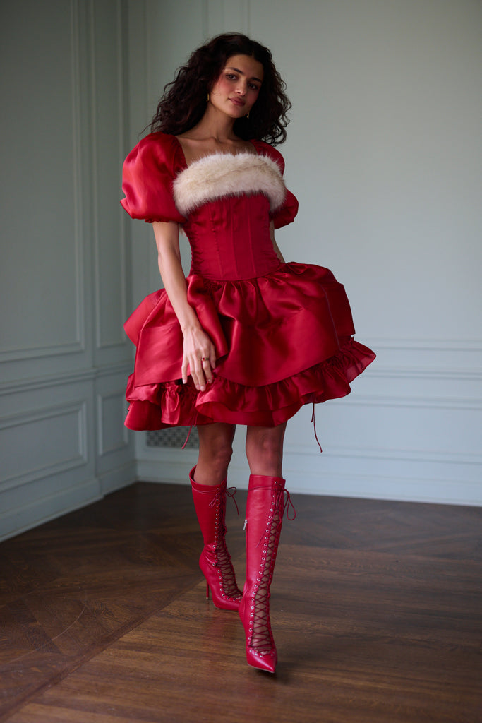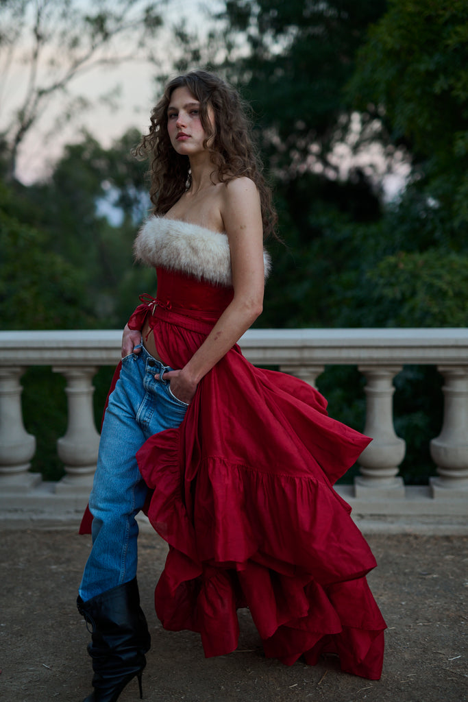 Channel your ultimate Mean Girls holiday fantasy in this fully boned silk satin corset, adorned with luxuriously realistic faux fur trim, featuring sophisticated dark-tipped detail, lush and soft as freshly fallen snow. The magic lies in its versatility - extra-long drawcords allow for perfect cinching or can be wrapped around and be decorated with tiny ornaments like red Christmas baubles, while the power mesh back ensures you'll dance comfortably through every festive soirée. Pair with The Rouge Etoile Dress or wear solo for the quintessential Santa-girl moment.