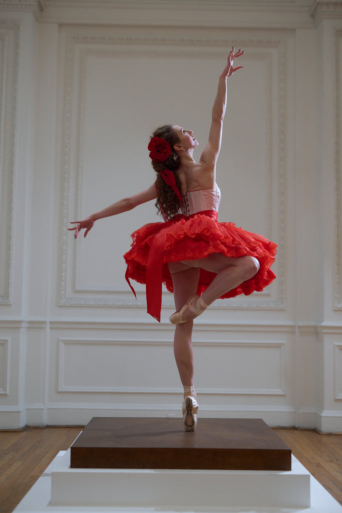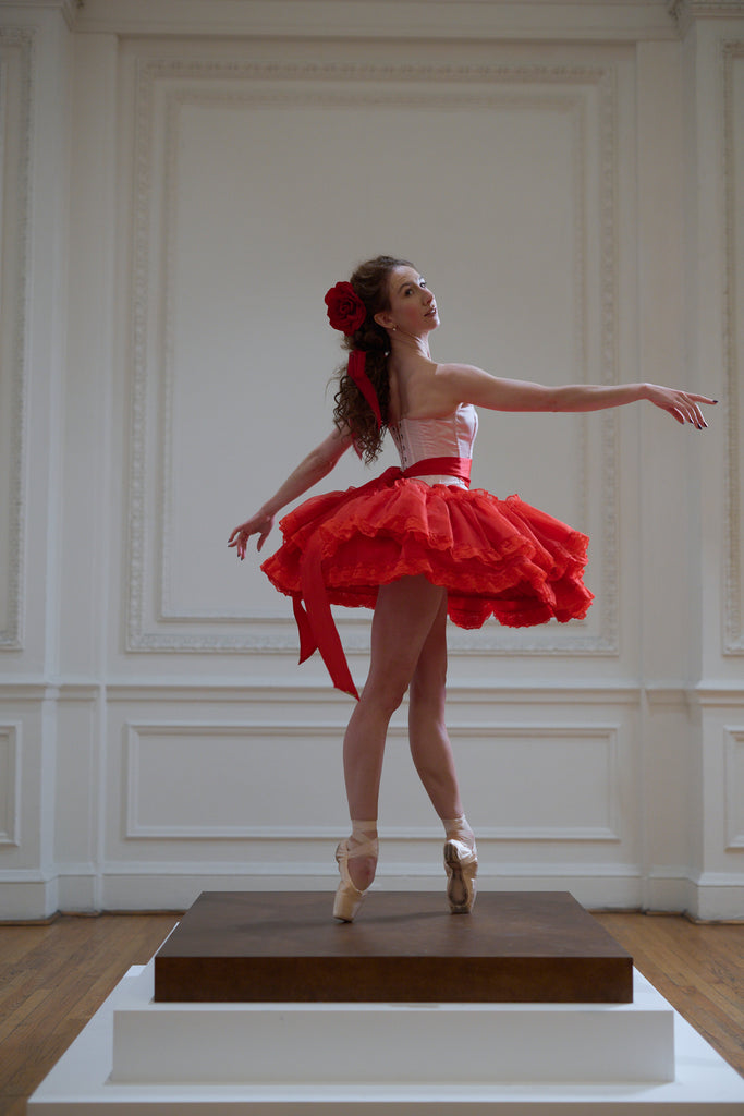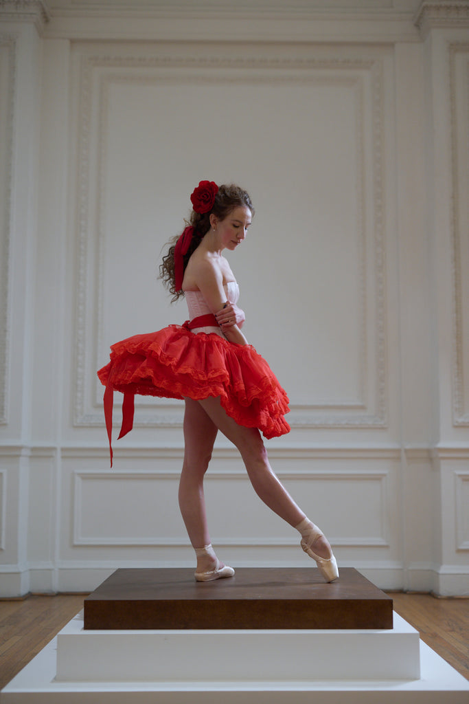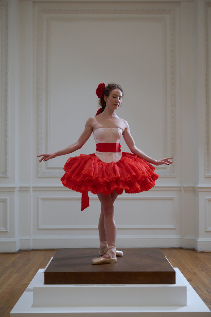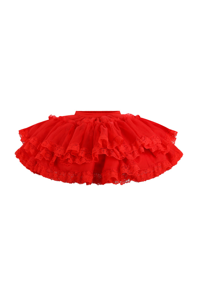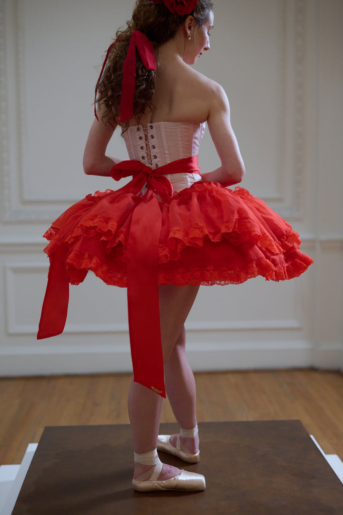 This crimson tutu pays homage to Degas' distinctive signature, capturing those vibrant pops of red that punctuated his art. Just as the artist used these bold accents to draw the eye, our scarlet version transforms the classical ballet staple into a statement costume piece that’s uniquely Selkie. Beautifully structured with boning, this voluminous mini hoop skirt features delicate lace trim that gives it an almost cake-like quality. With its half-stretch waistband and invisible zipper closure, this statement piece creates the perfect foundation for countless dramatic looks—a collector's item you'll never find anywhere else.