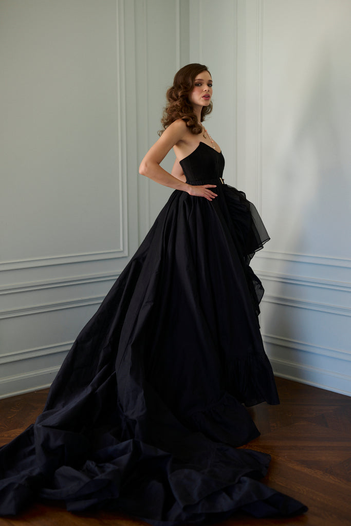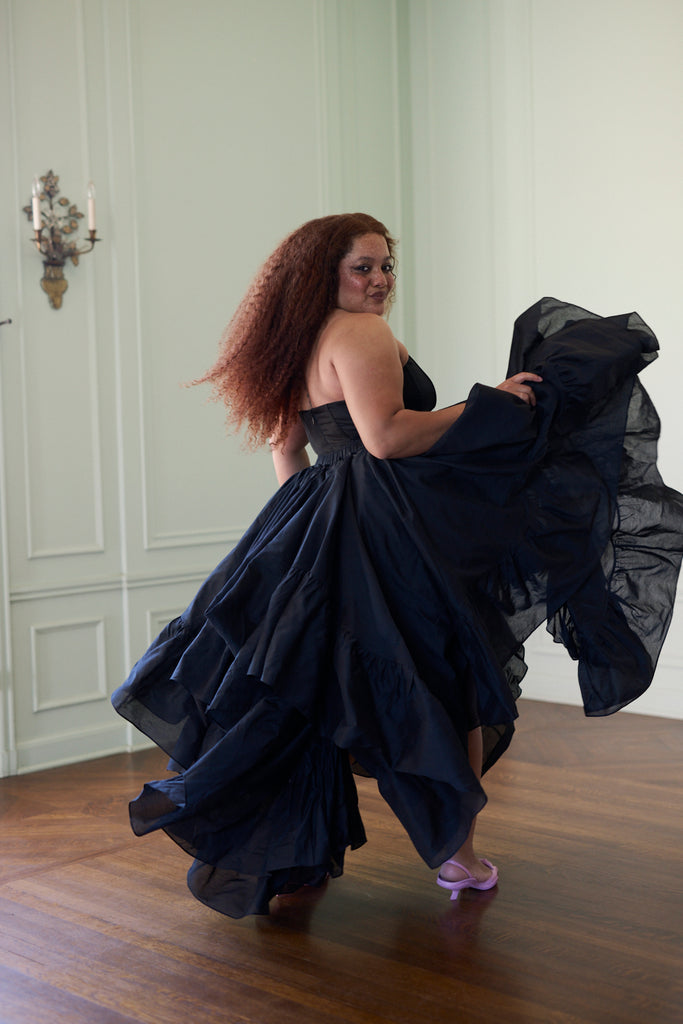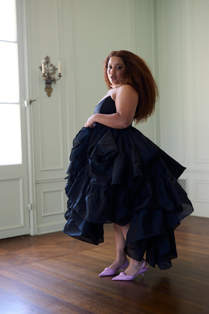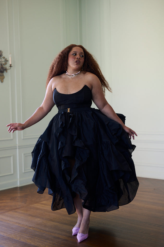The drama of a train and the convenience of removing it—that’s why we love the tournure skirt. This luxury skirt topper fastens easily at your waist, turning any dress into an extravagant gown: a floor-sweeping, open-front skirt, covered in ruffles, gives way to a lengthy train. The raven is rap rapping, and ready to wear.