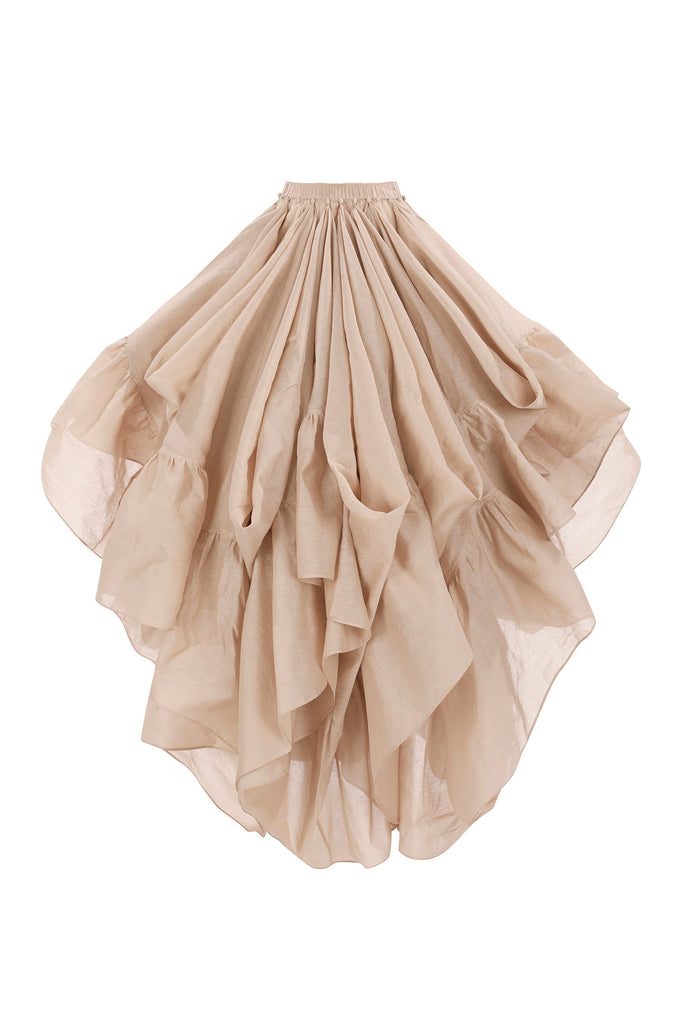The drama of a train and the convenience of removing it—that’s why we love the Tournure skirt. This luxury skirt-topper fastens easily at your waist, turning any dress into an extravagant gown: a floor-sweeping, open-front skirt, covered in ruffles, gives way to a lengthy train. Our new shade is a pale brown that looks luminous on all skin tones, inspired by the soft underbelly of a sparrow. Like a perfectly made cafe au lait, or shavings of milk chocolate, this shade is a welcome treat.