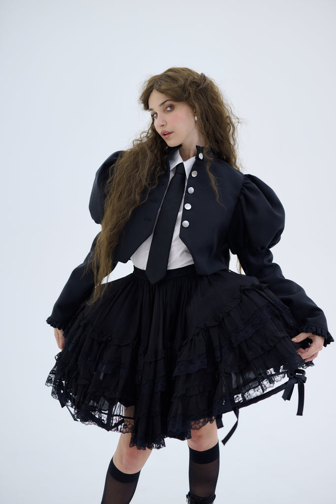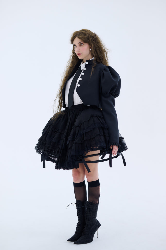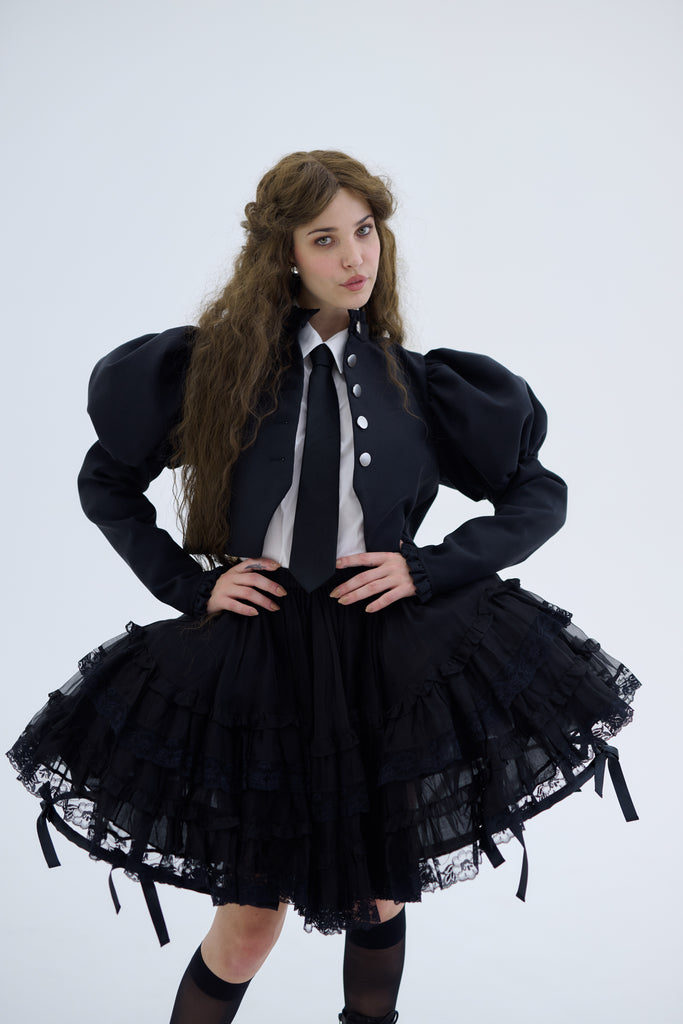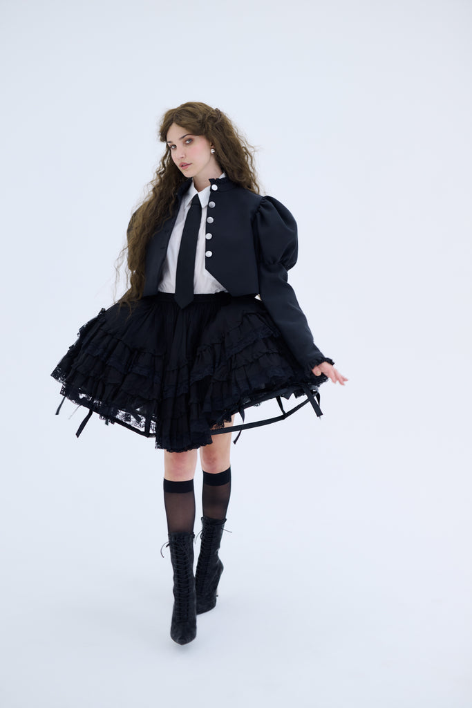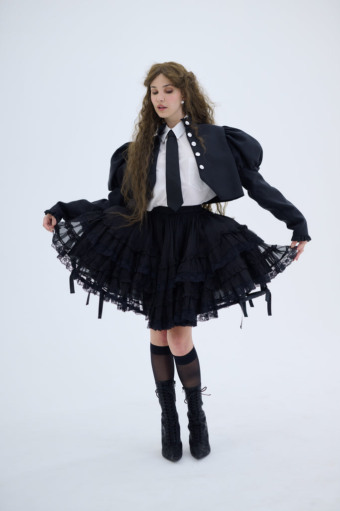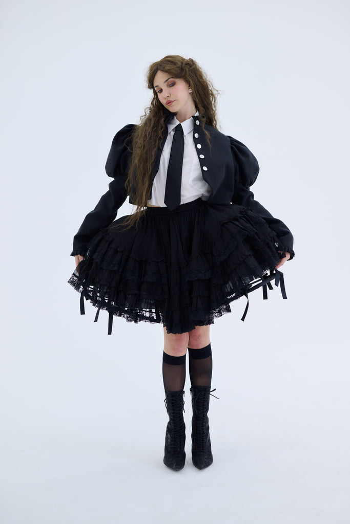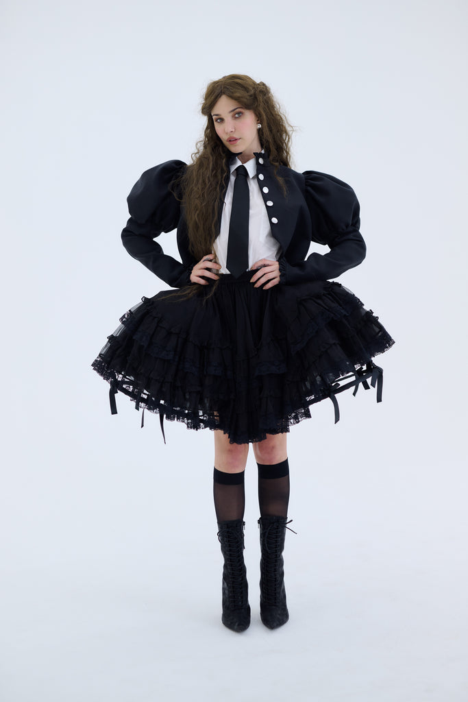 Layers and layers of silk gauze form a voluminous mini petticoat reminiscent of the seductive dark beauty of Tchaikovsky’s Swan Lake. With a comfortable elastic waist, ruffles, and contrast ivory lace detail, this can be worn underneath any skirt or dress for added drama. Or wear it alone, and let it be the drama. The raven is rap rapping, and ready to wear.