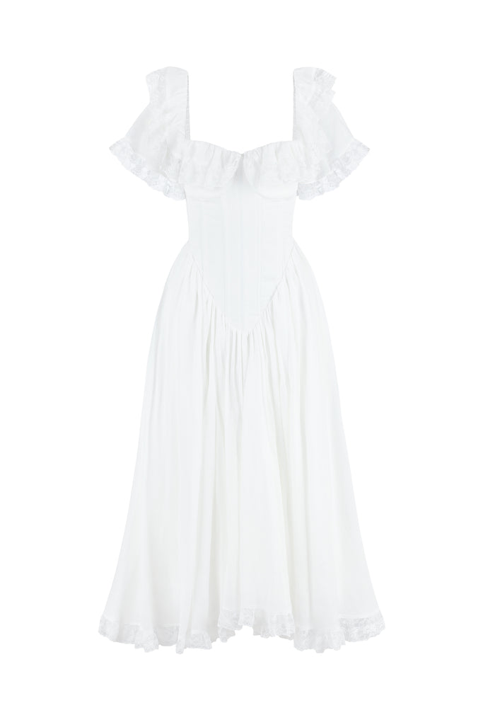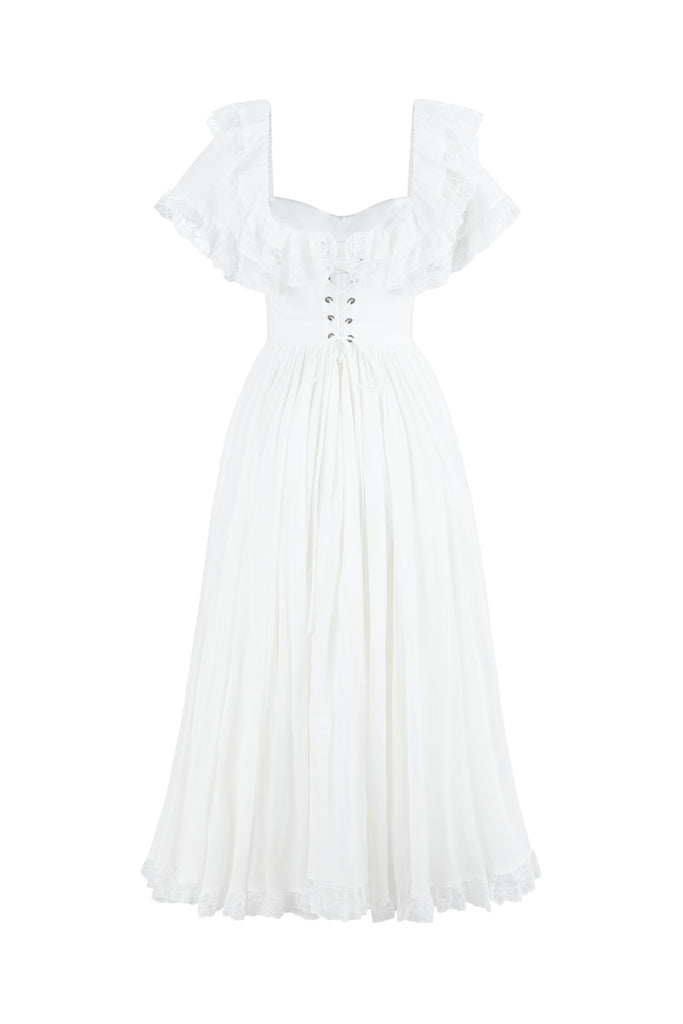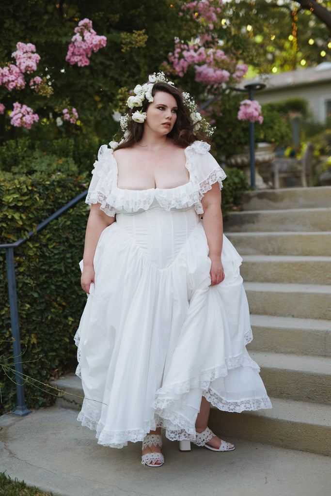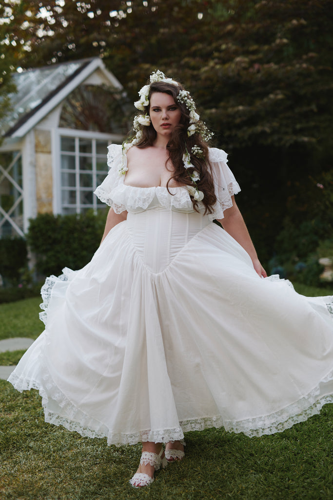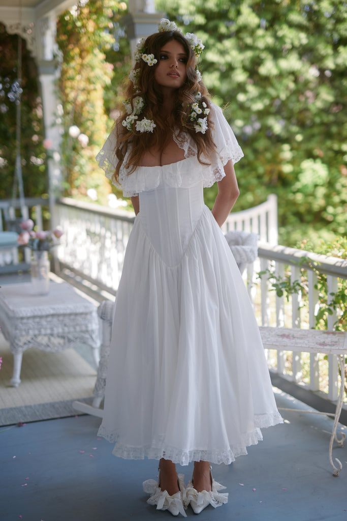 In dreamy white cotton gauze, this Basque waist midi transforms the beloved Cupid top into your perfect bridal dress. Underwire cups and boning at the waist create divine structure while side bustling, corset lacing at the back, and lace trim throughout weave together an enchanting silhouette of pure femininity.