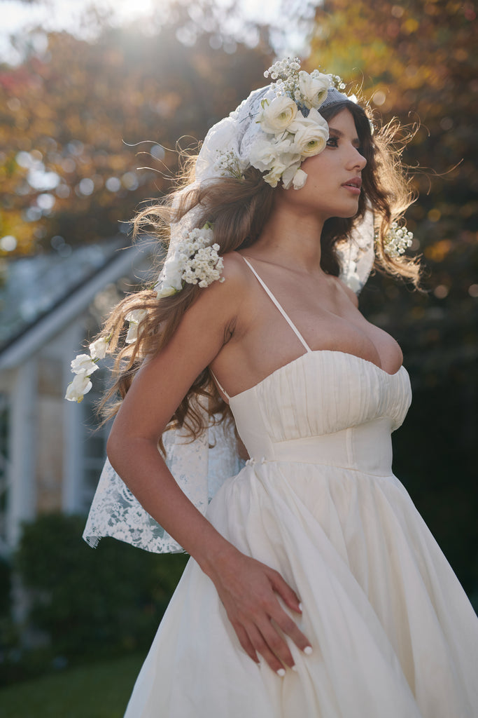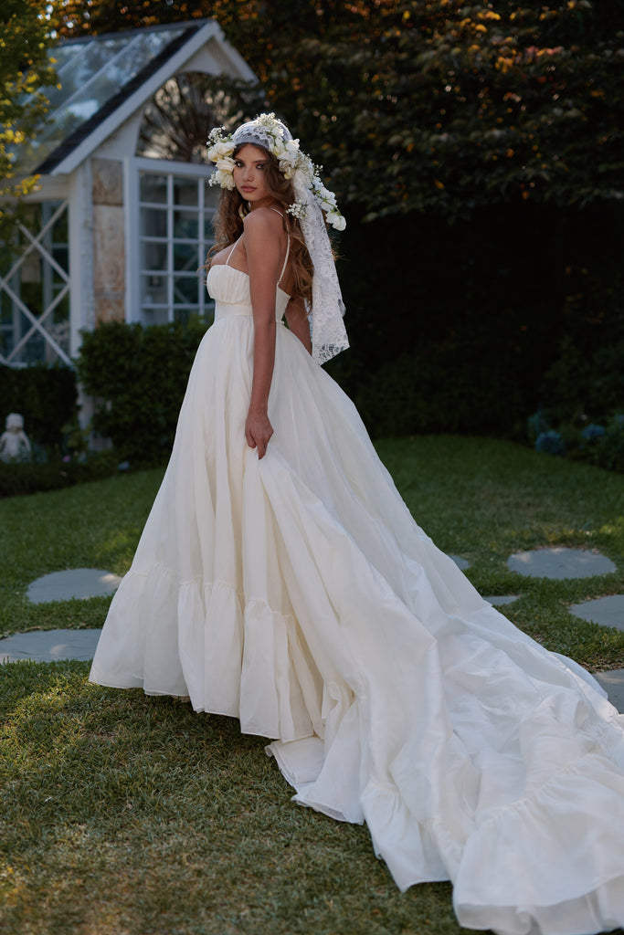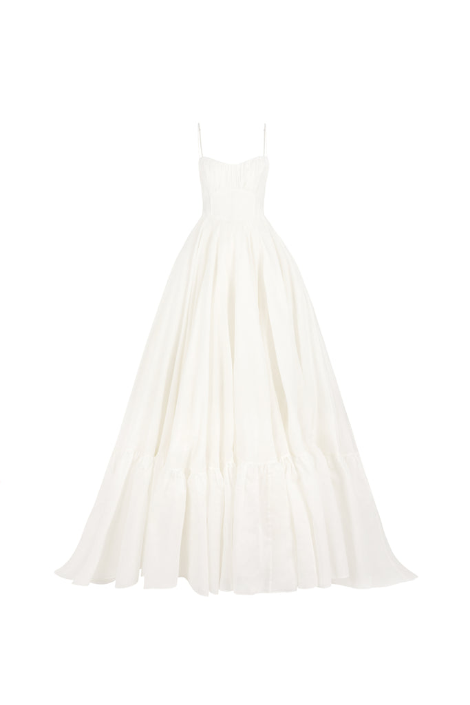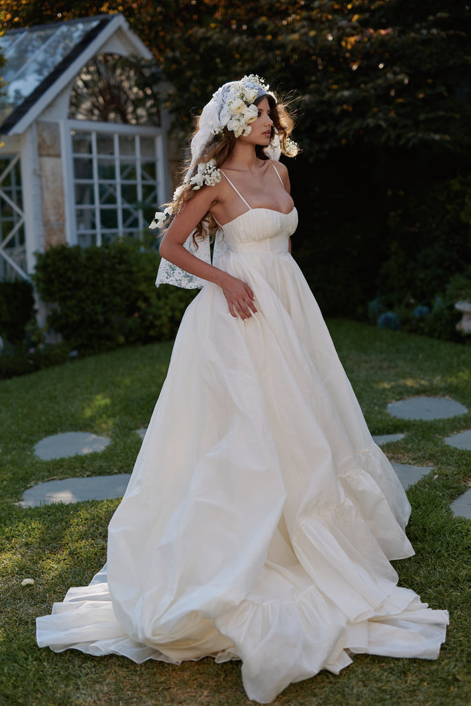 Like a vision of bridal perfection, this ruffle-bottomed, luxurious organdy version of the Roman Holiday Gown is breathtaking. Crafted from a silk-cotton blend, the organdy fabric offers a unique combination of crispness and ethereal lightness. Inspired by timeless wedding elegance, this full-length gown nods to the 60’s with delicate ruched bust and dainty thin straps. Featuring a boned waist that starts just above natural for an impeccable hourglass fit, and a devastatingly dramatic bustling skirt. The skirt cascades into a seriously glamorous train for a breathtaking ceremony entrance, and later transforms into a bouffant effect ideal for champagne toasts and cake-cutting moments. Perfect for a romantic wedding in a picturesque vineyard or dancing in the ballroom of a boutique hotel.