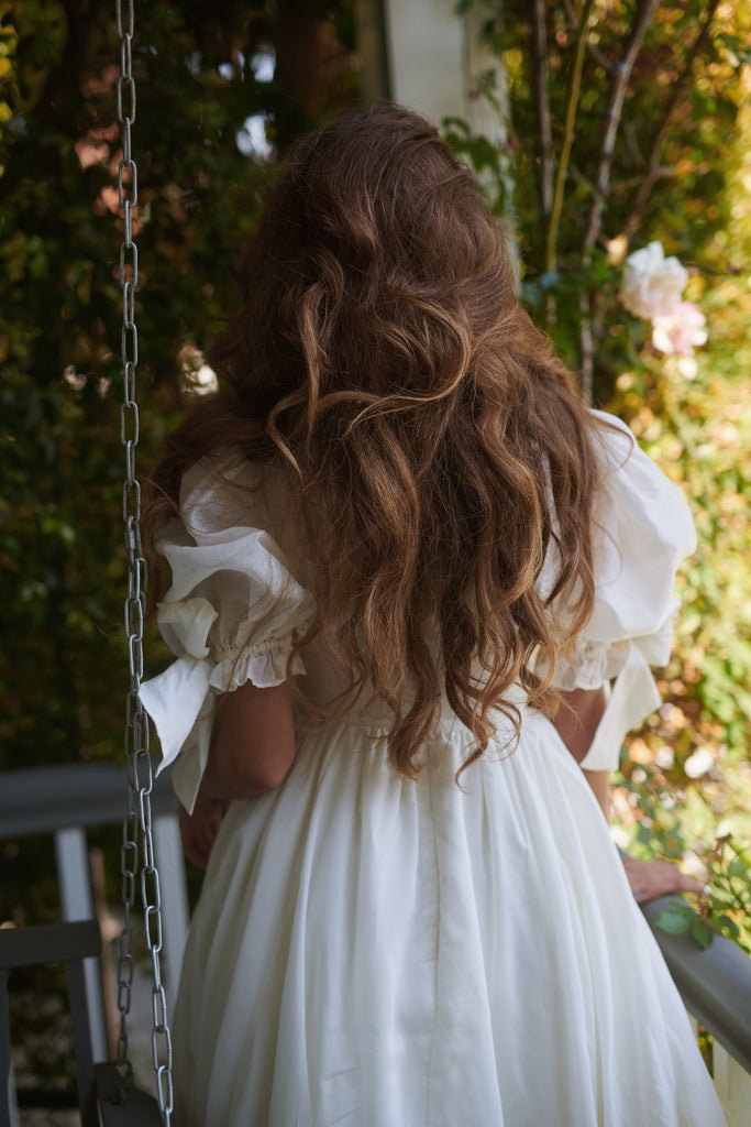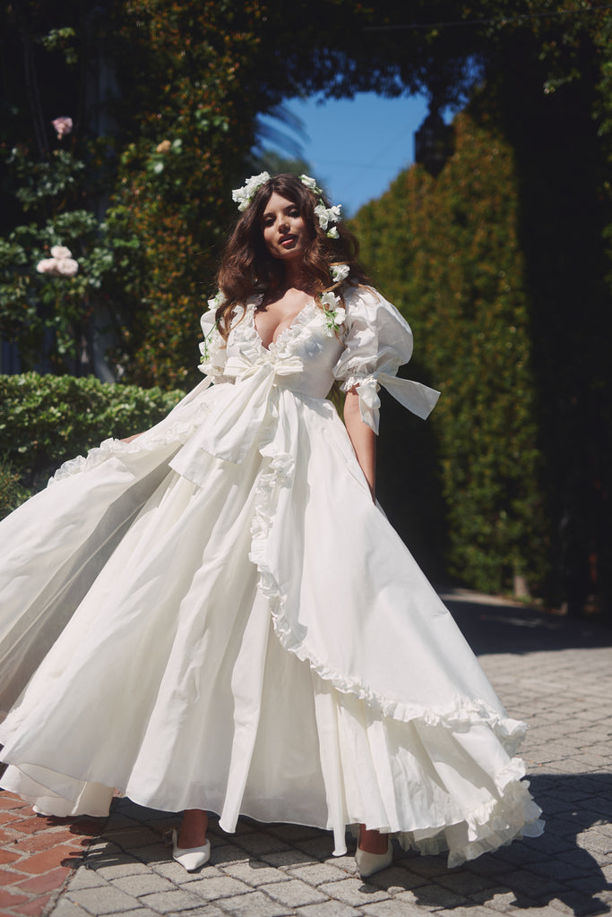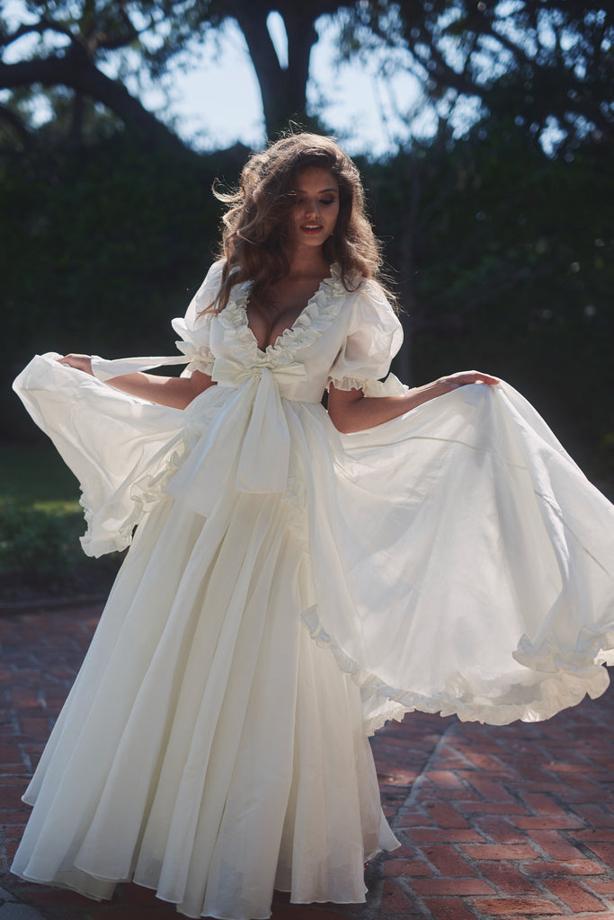 This statement stunner, crafted entirely in ivory organdy, features a dramatic circle skirt, puff sleeves, and whimsical bow accents. The organdy's diaphanous layers create an ethereal silhouette, embodying a unique blend of structure and weightlessness. Designed after Marie Antoinette's famous curtain-style gowns, the skirt opens in the front, allowing the fabric to catch light and movement with every step.