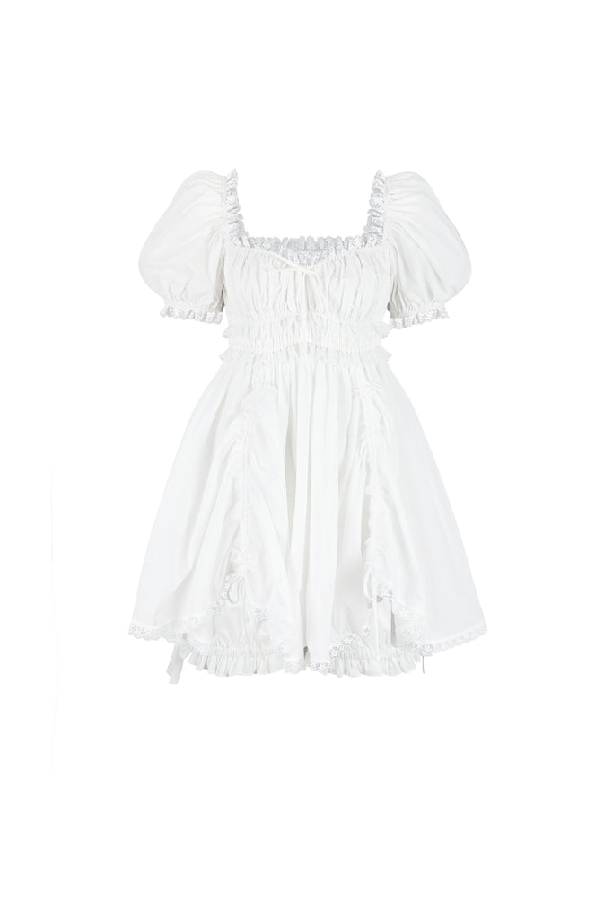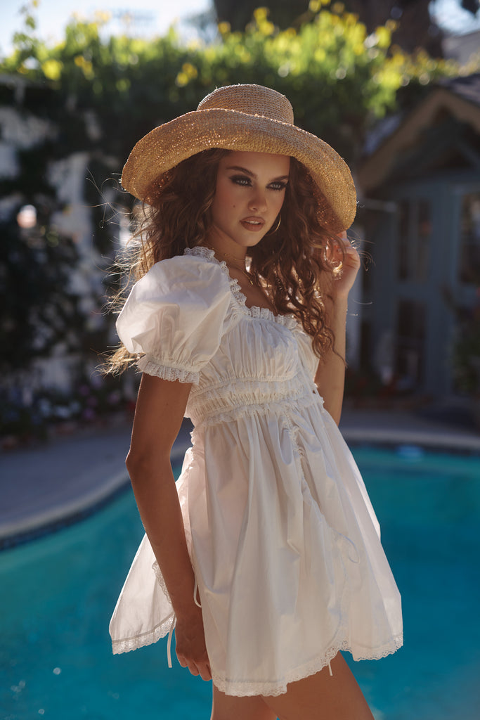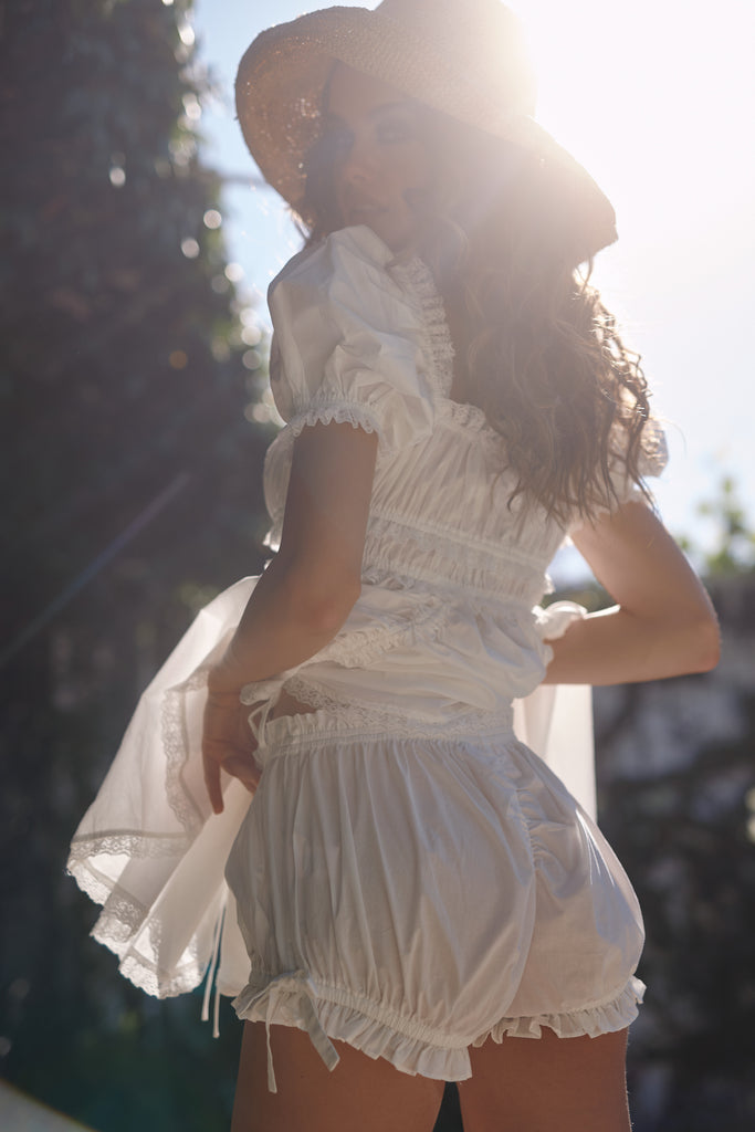 May you embody effortless beauty in the charming details of this soft cotton mini, featuring a ruched bust and a delightfully adjustable drawstring skirt, enhanced by the playful touch of puff sleeves. The mini cotton bloomers complete the look with a tie waist and bow details for authentic all-American girl sweetness. A must-have for summer.