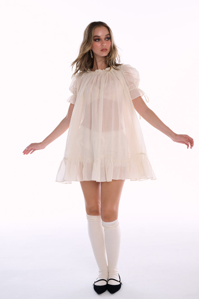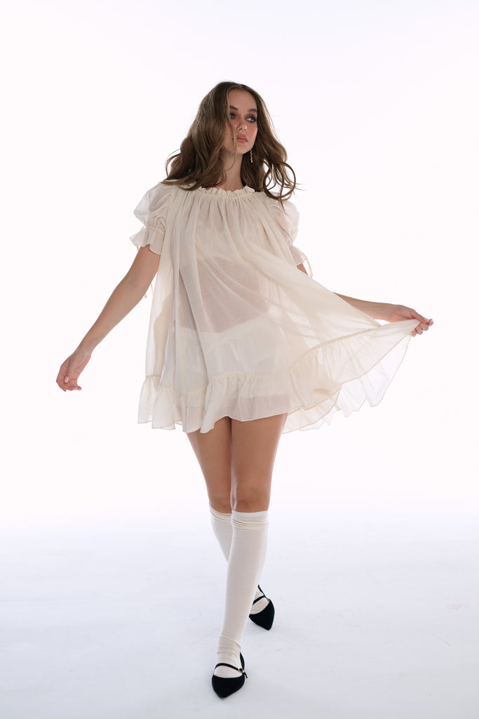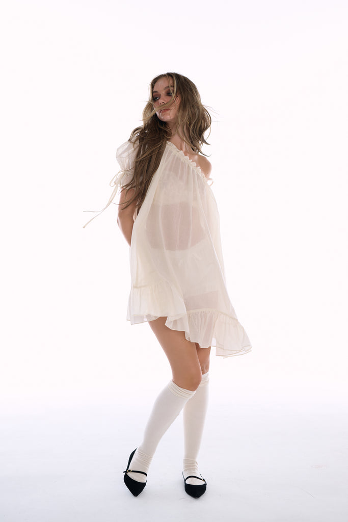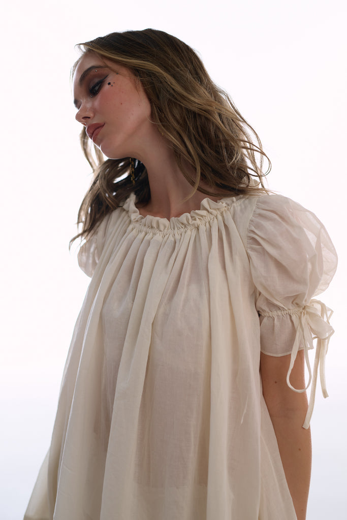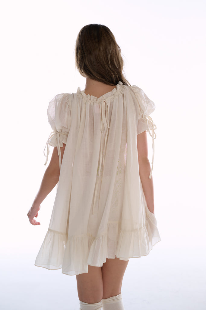Oversized sheer chemise with functional drawstring at neck and sleeves