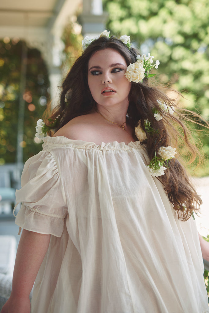 Katie is wearing a size 2X in Selkie. Her measurements are 48” bust, 44” waist, 63” hip.