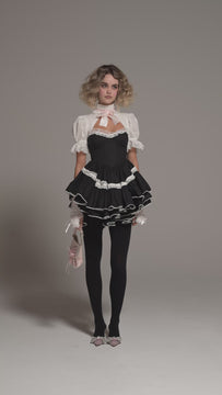 This paper cotton mini is a tuxedo gone deliciously flirtatious. Delicate lace meets a ruffled high neck with satin ribbon. A boned bodice cinches perfectly with corset lacing at the back. For the girl who looks like she stepped out of a 1920s Paris centerfold. Champagne on her lips, glitter on her collarbone.