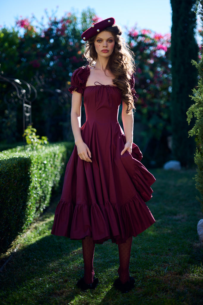 The Bordeaux cotton Foxglove midi dress features a corset back and dramatic leg slit.