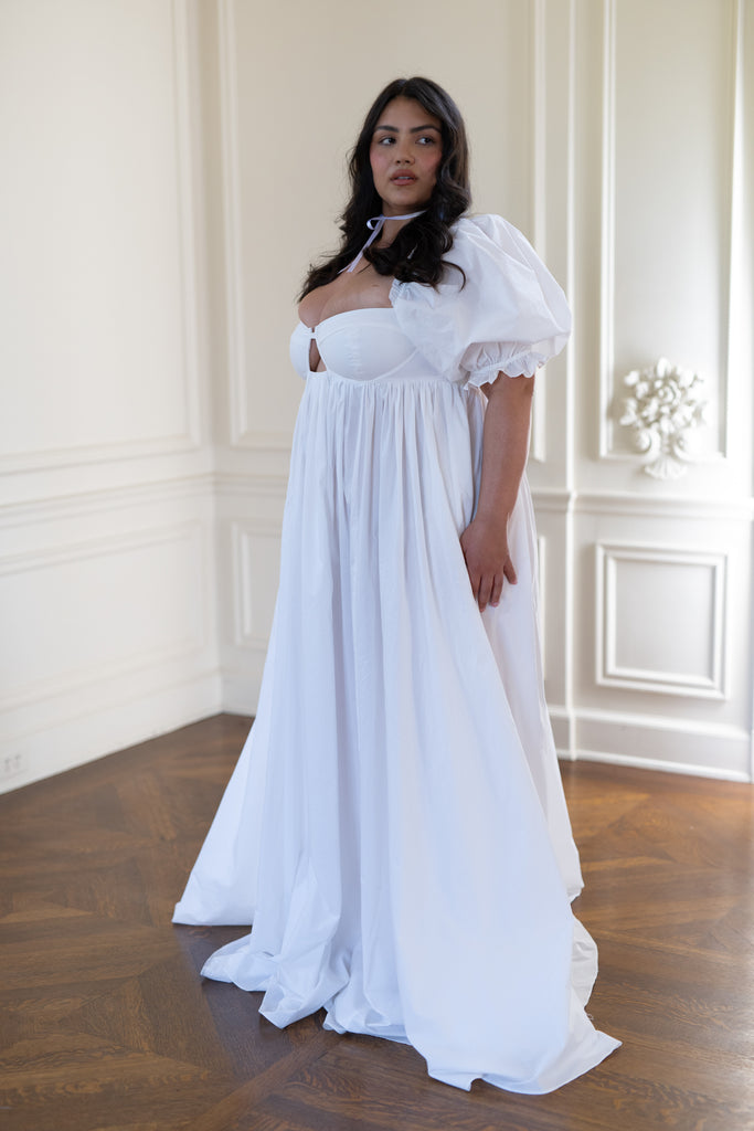 Cotton floor length gown with elastic puff sleeves and peek-a-boo opening at bust