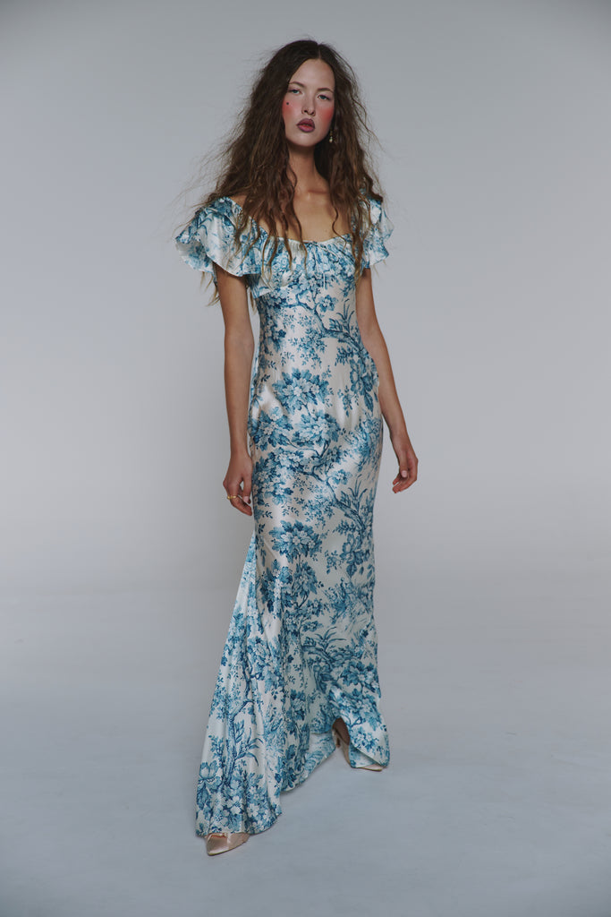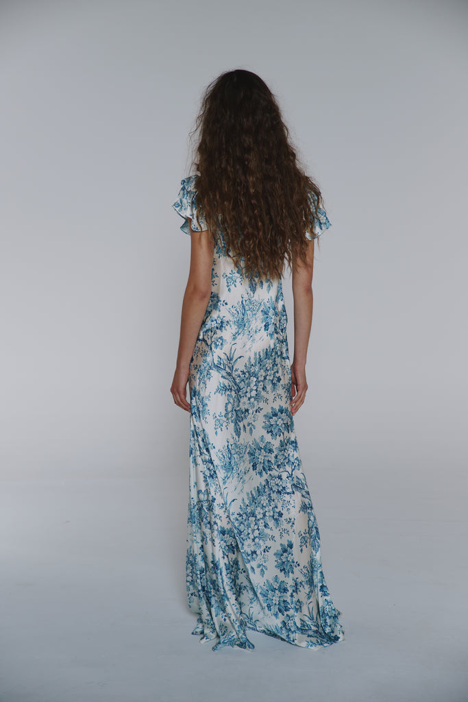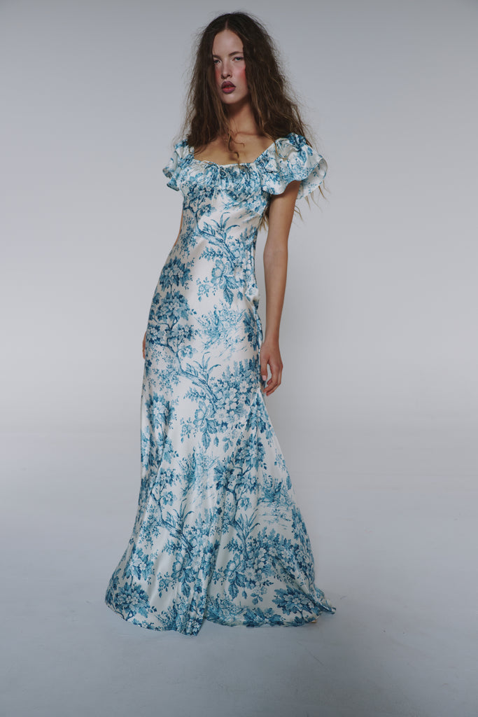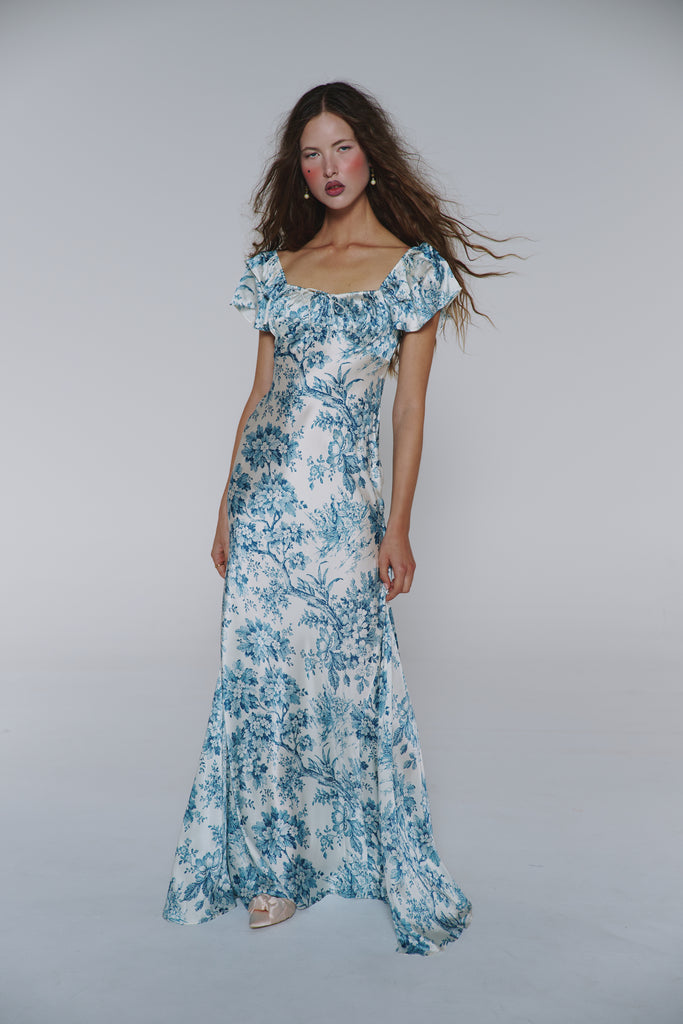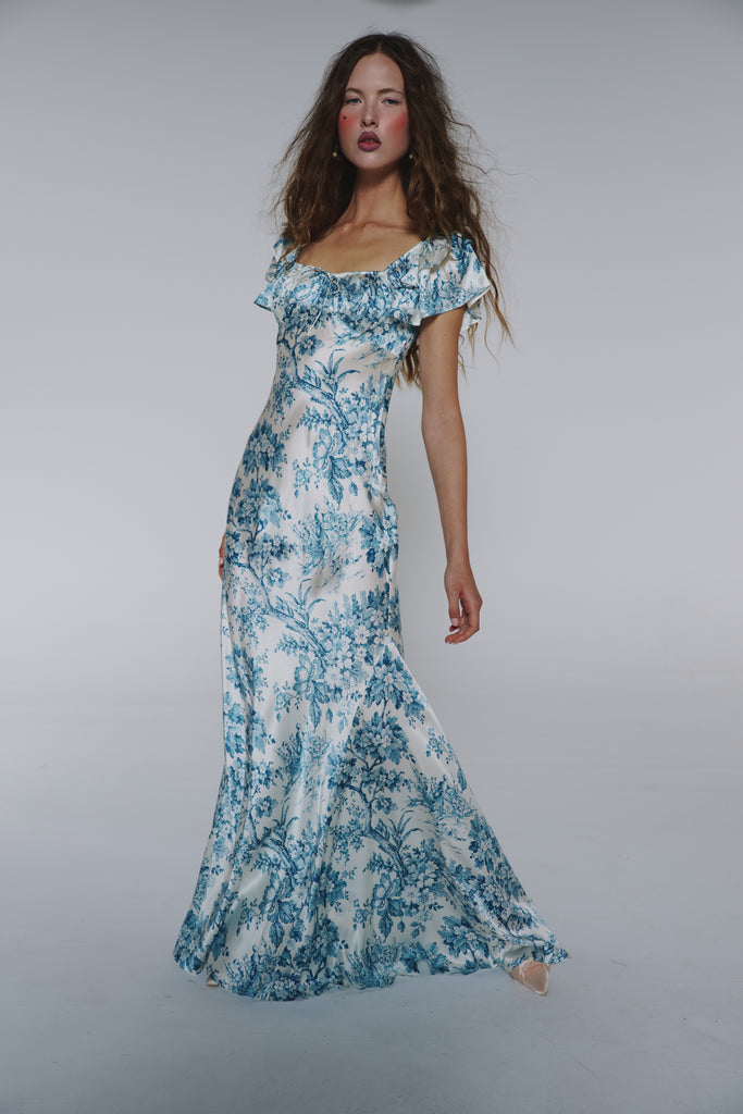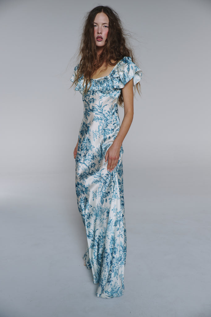 Adorned with intricate blue toile inspired by the opulent world of Mozart's Vienna, this piece showcases flutter sleeves and a tie drawstring bust featuring soft cups and bow detail. Side gussets allow for graceful movement while creating a mermaid silhouette, making this dress perfect for wedding celebrations or romantic evenings that call for something truly divine.