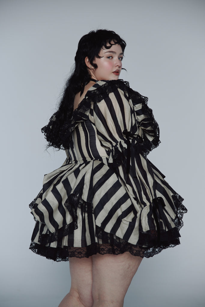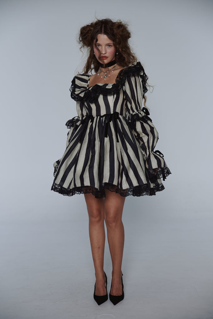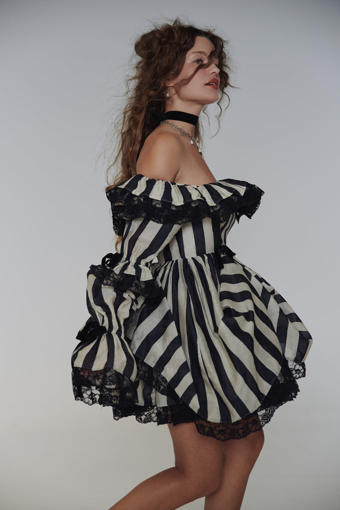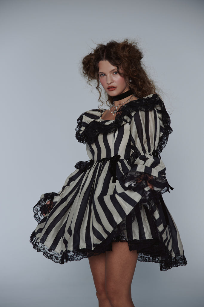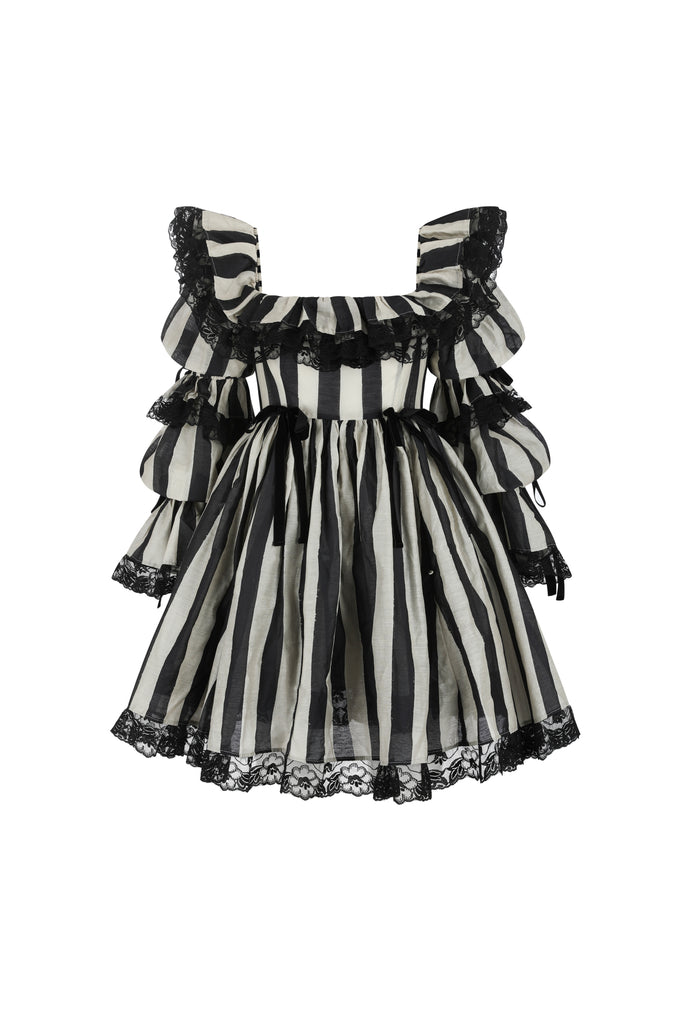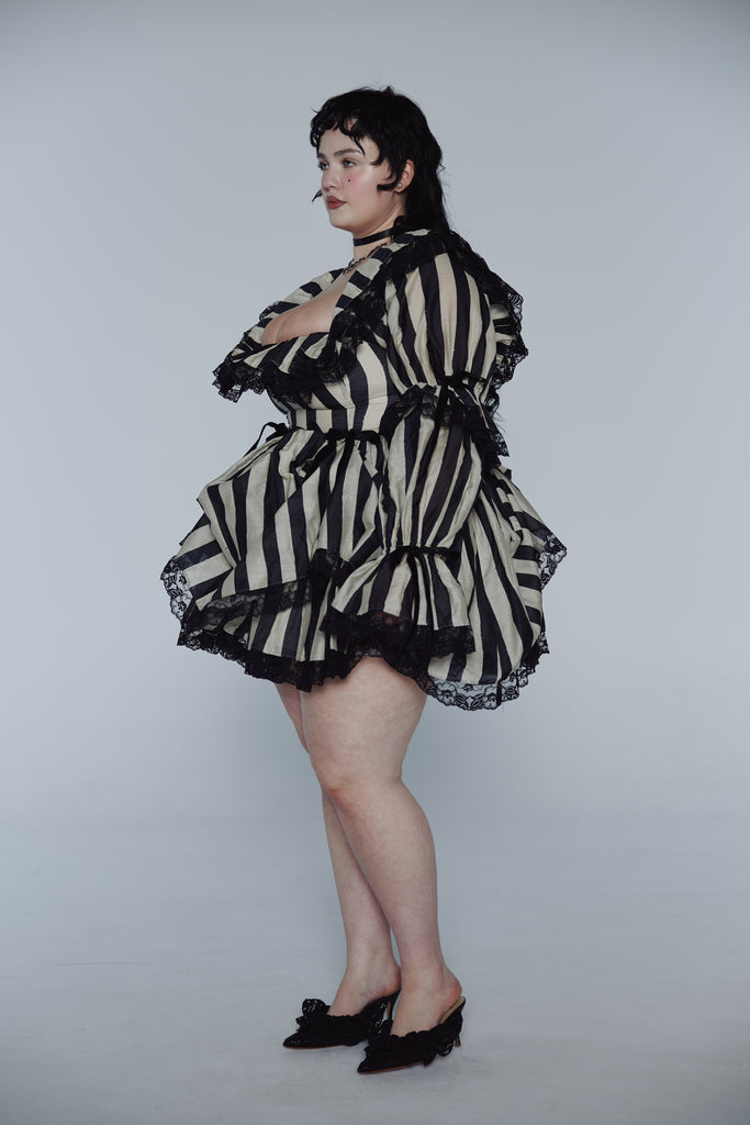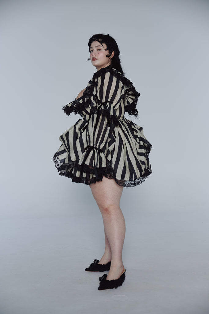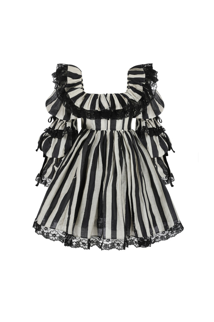Crafted in silk organdy with delicate ruffled lace trim, this mini dress features cinched bubble sleeves and charming bow details at the waist and cuffs. Drawing inspiration from the atmospheric beauty of Sleepy Hollow and the striped gown worn by Virginia Saint George in the 90s TV miniseries "The Buccaneers," this piece captures period romance. The voluminous skirt bustles through elastic loops and fabric-covered buttons for a customizable silhouette.