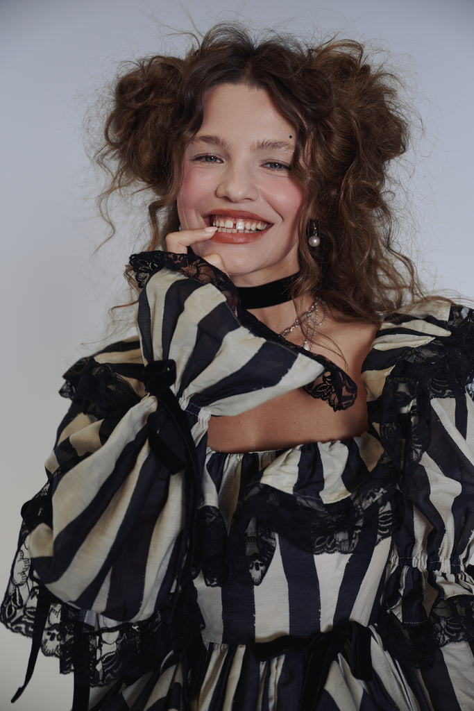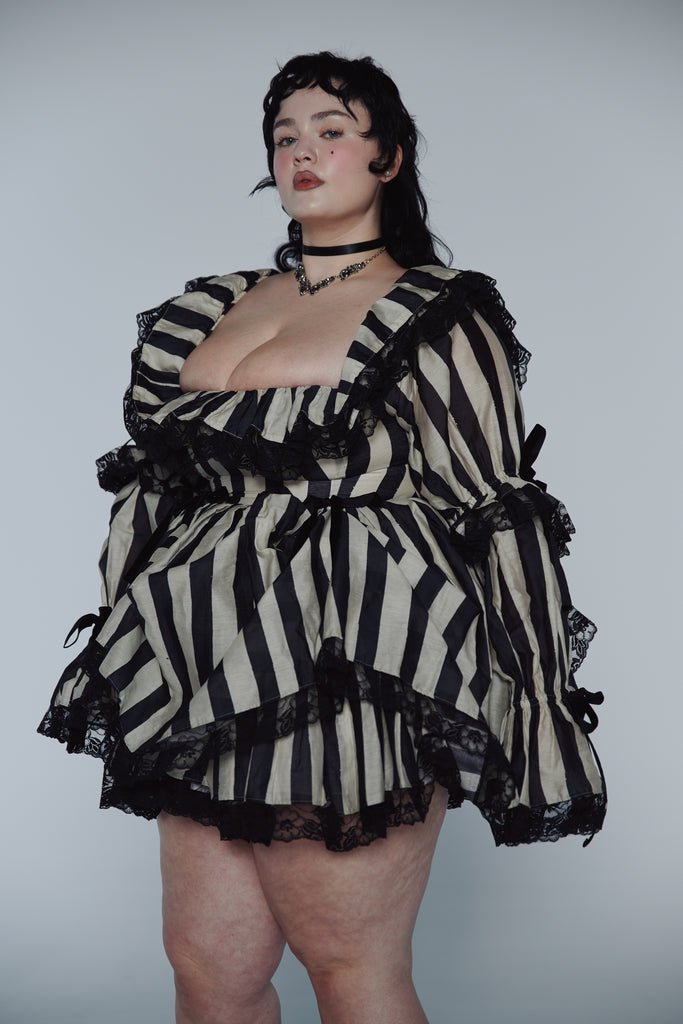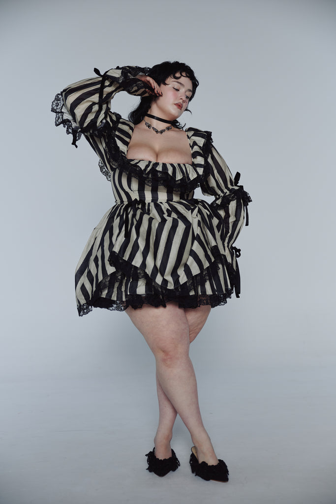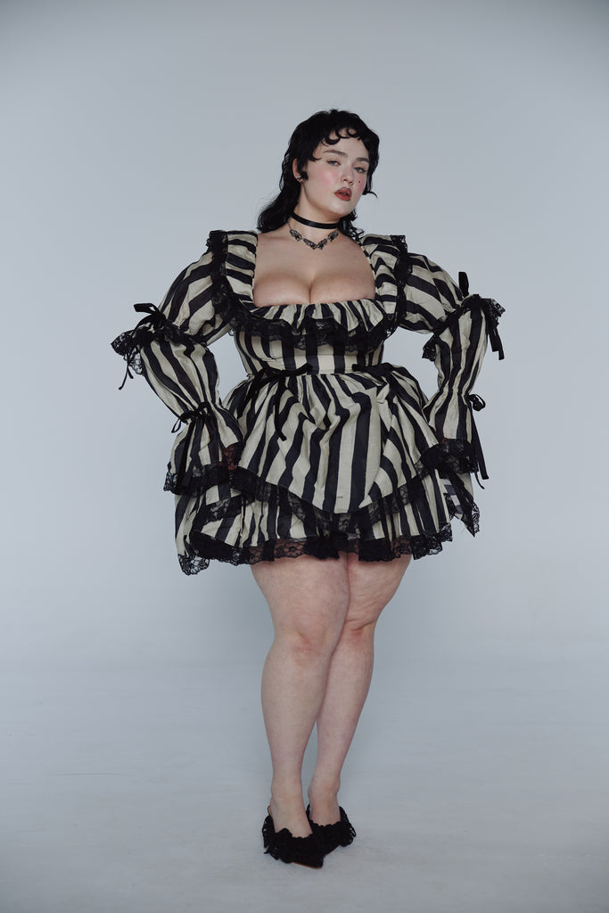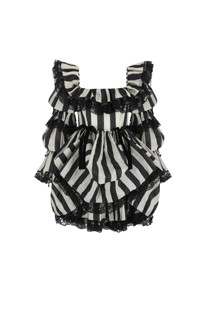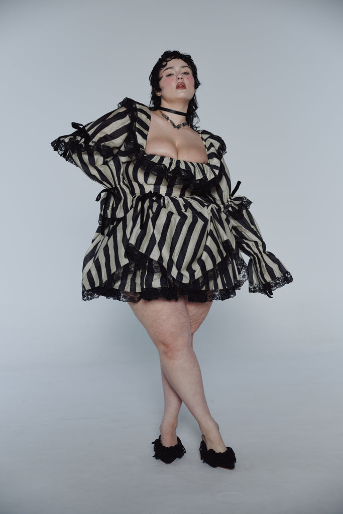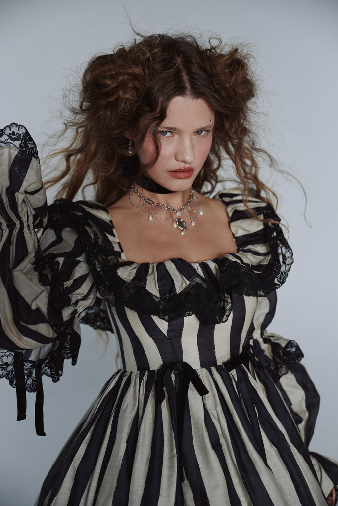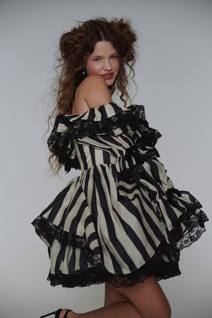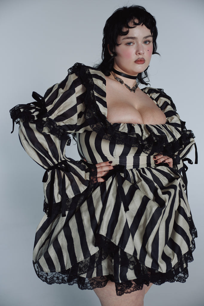 Crafted in silk organdy with delicate ruffled lace trim, this mini dress features cinched bubble sleeves and charming bow details at the waist and cuffs. Drawing inspiration from the atmospheric beauty of Sleepy Hollow and the striped gown worn by Virginia Saint George in the 90s TV miniseries "The Buccaneers," this piece captures period romance. The voluminous skirt bustles through elastic loops and fabric-covered buttons for a customizable silhouette.