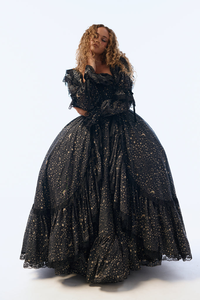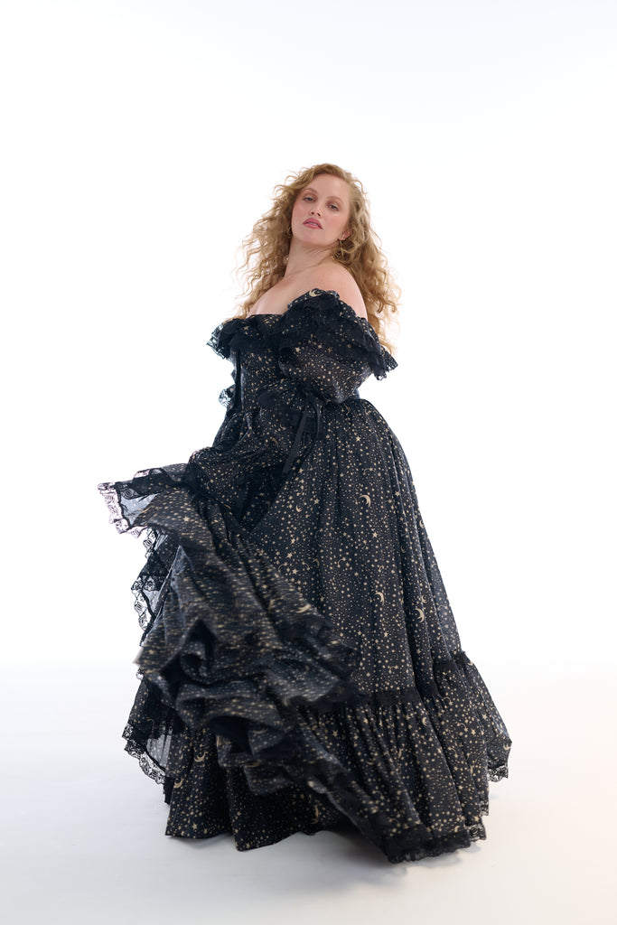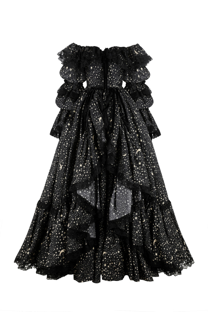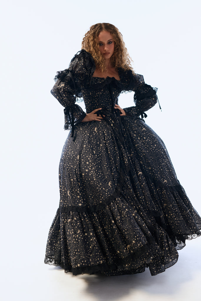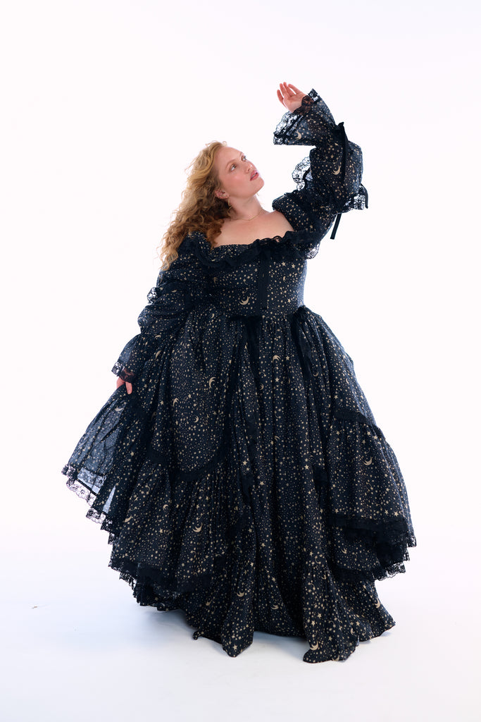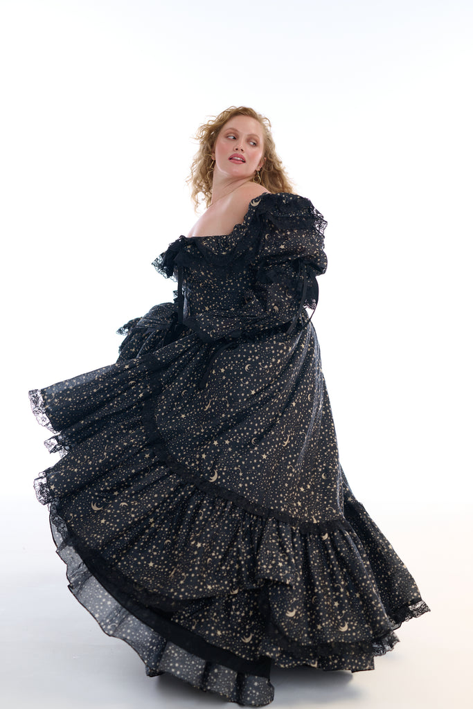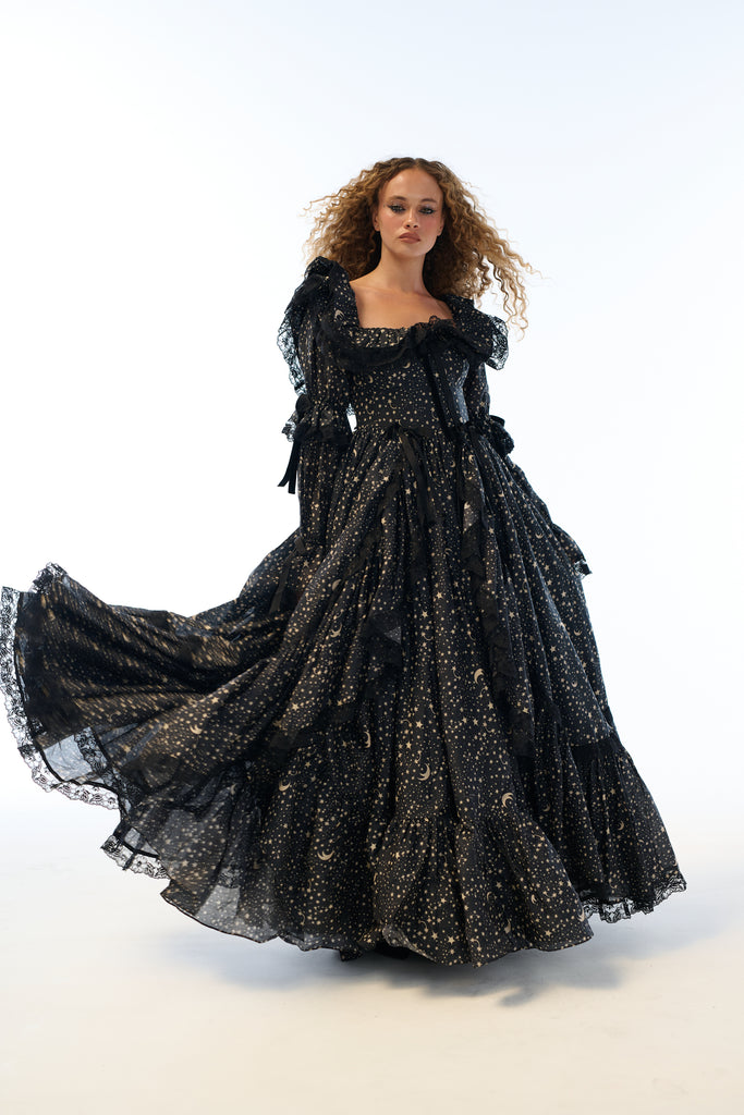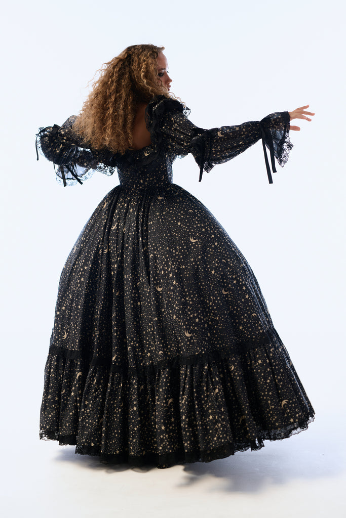 A celestial map of the cosmos adorns this 1960s ceremonial gown. Layers of billowing organdy drift like starlight over the ethereal silhouette, while the long sleeves, adorned with ties and lace trim, mirror the cinched details of the skirt. The versatile off-the-shoulder neckline can be worn up or down based on preference, accentuated by charming bows at the bust, waistline, and sleeves. You won’t sacrifice style for comfort—this gown is fully lined with 100% cotton.