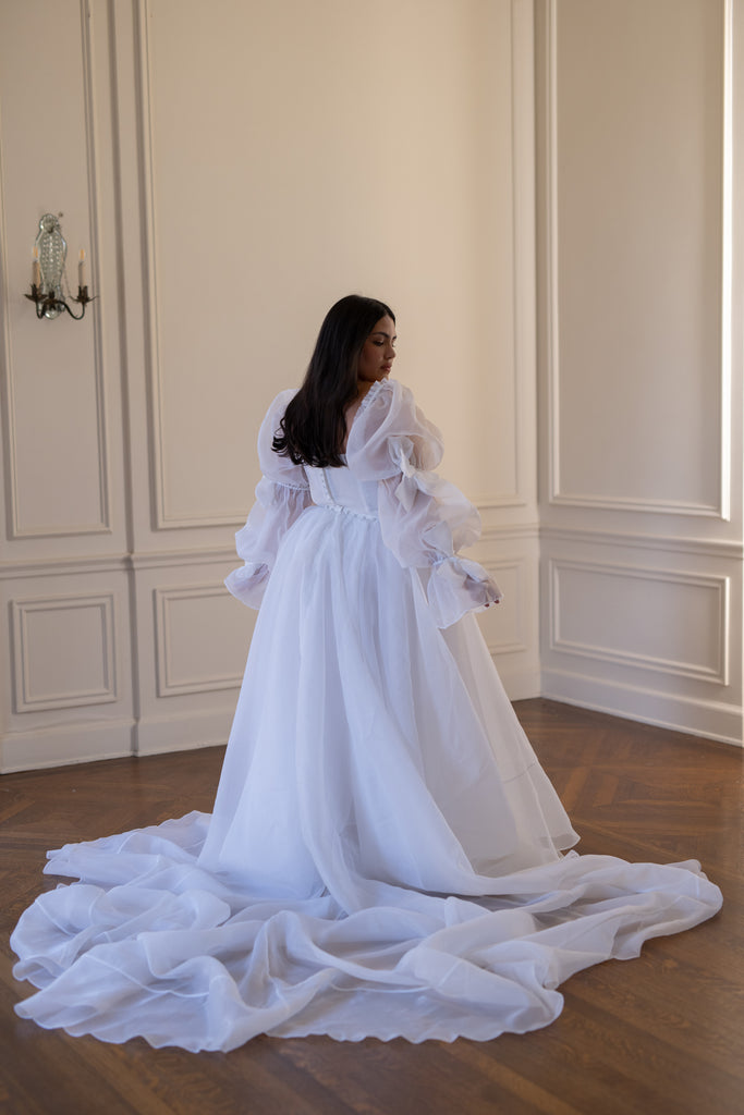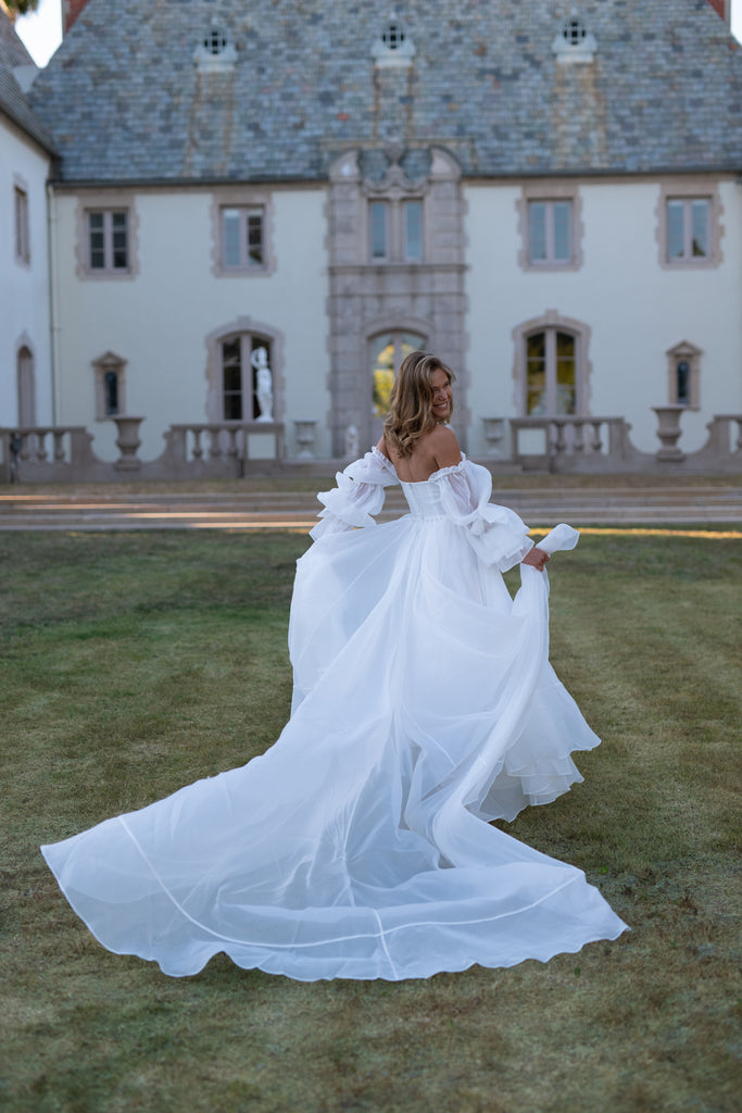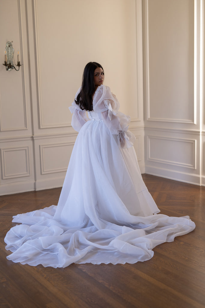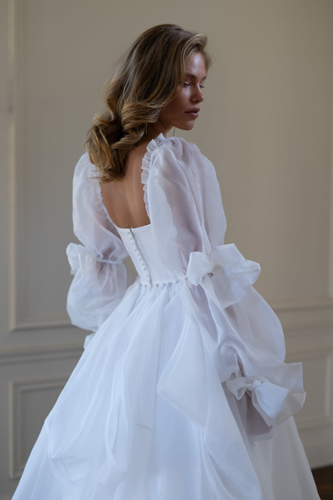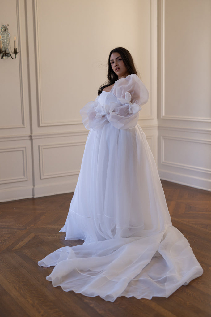 This exquisite organza creation is a masterpiece of bridal elegance. The floor-length gown showcases romantic bubble sleeves adorned with bow cinch details, adding a touch of timeless charm to the ethereal silhouette. The opulent train, a magnificently lavish cascade of fabric, can be artfully bustled with hidden elastic loops and fabric-covered buttons, offering versatility for your wedding celebration. Fully lined for comfort, this gown is a dream come true for the starry-eyed bride.