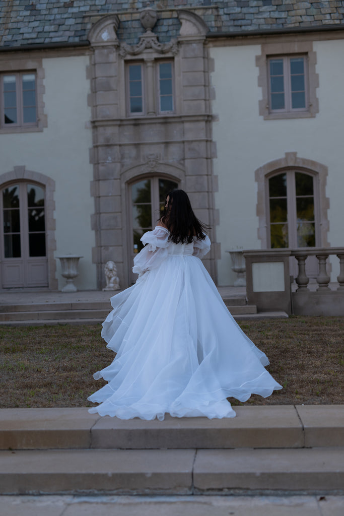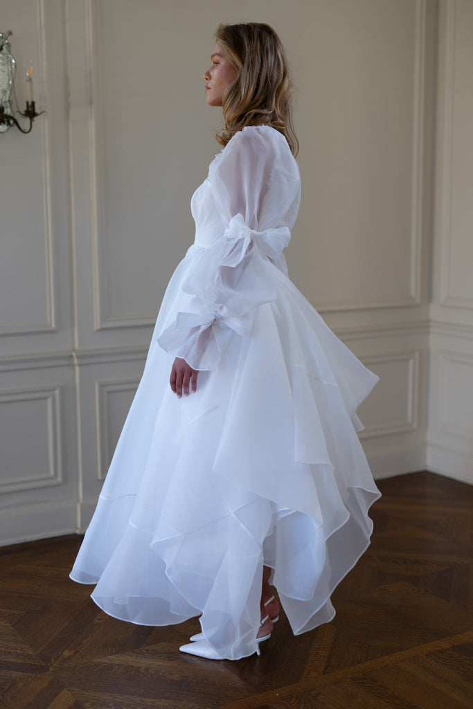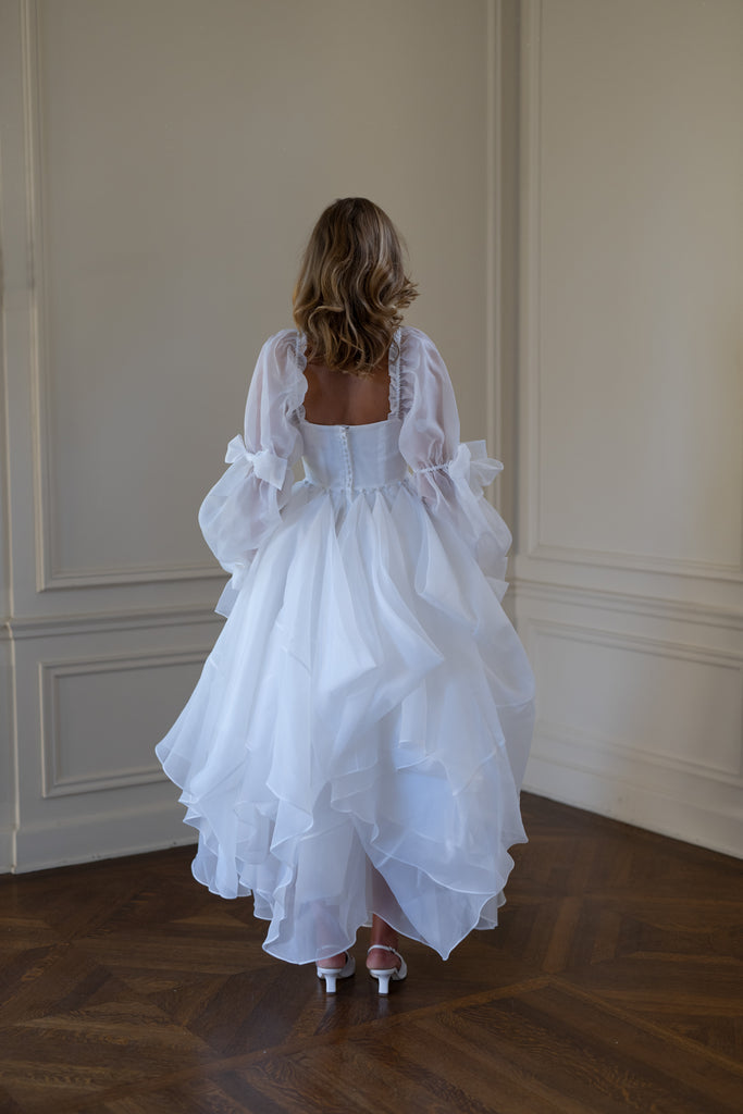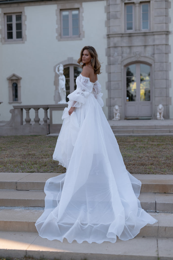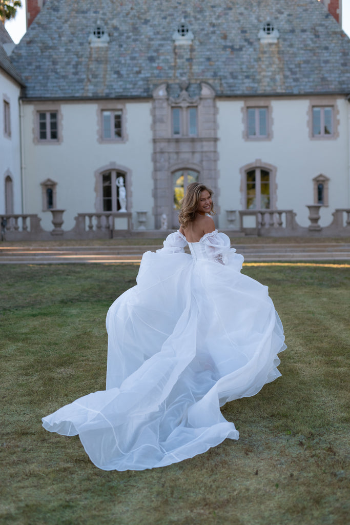This exquisite organza creation is a masterpiece of bridal elegance. The floor-length gown showcases romantic bubble sleeves adorned with bow cinch details, adding a touch of timeless charm to the ethereal silhouette. The opulent train, a magnificently lavish cascade of fabric, can be artfully bustled with hidden elastic loops and fabric-covered buttons, offering versatility for your wedding celebration. Fully lined for comfort, this gown is a dream come true for the starry-eyed bride.