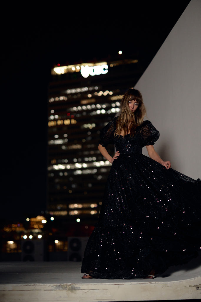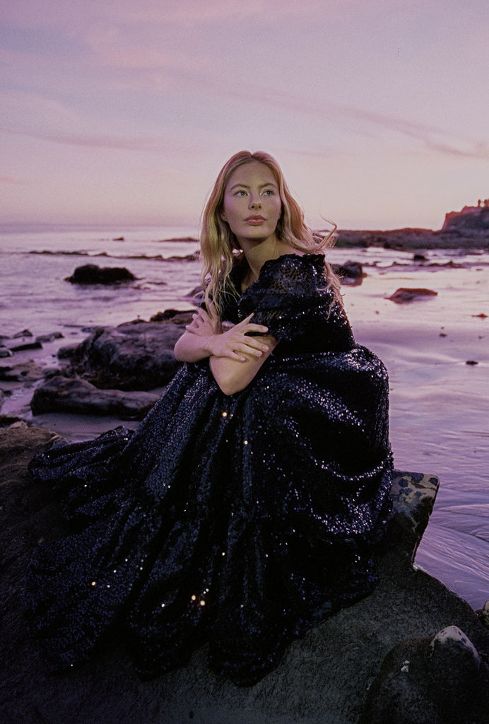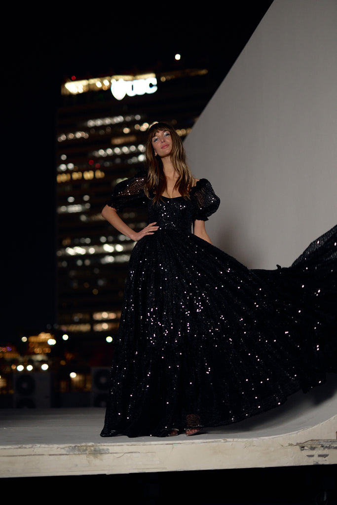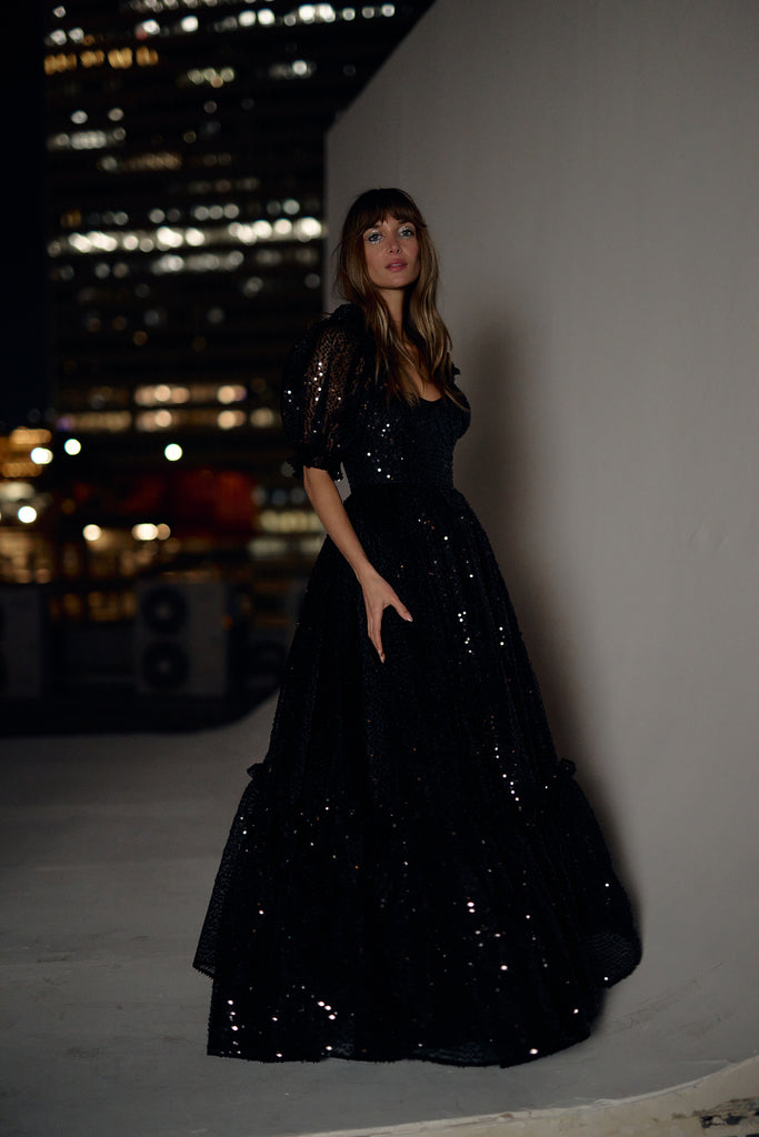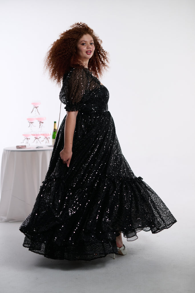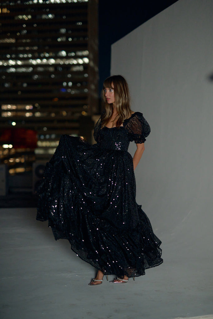 Our classic Ritz gown is upping the ante in Onyx Sequins, just in time for New Year's Eve. This dreamy princess statement piece, with its high waist, underwire bust, and corset-style top, has the perfect amount of give to look and feel great while toasting to a new beginning. Onyx Sequins is deep and rich, like the midnight sky, its dark black expanse enhanced by the captivating sparkle of sequins.