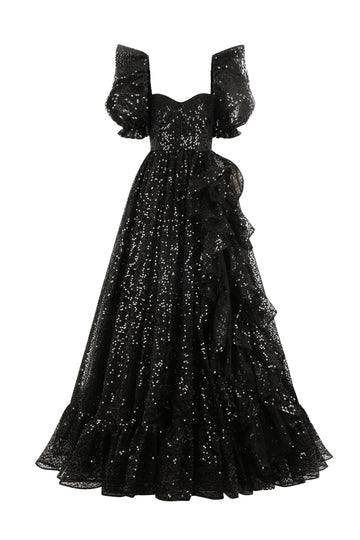 Float through black-tie affairs, dripping in sequins that shimmer like vials of your ex's tears. The structured organza glistens like black diamonds, with layers of volume and a dramatic ruffled slit designed for delicious mischief. Statement shoulder ruffles and underwire cups complete this ultimate party-girl silhouette.