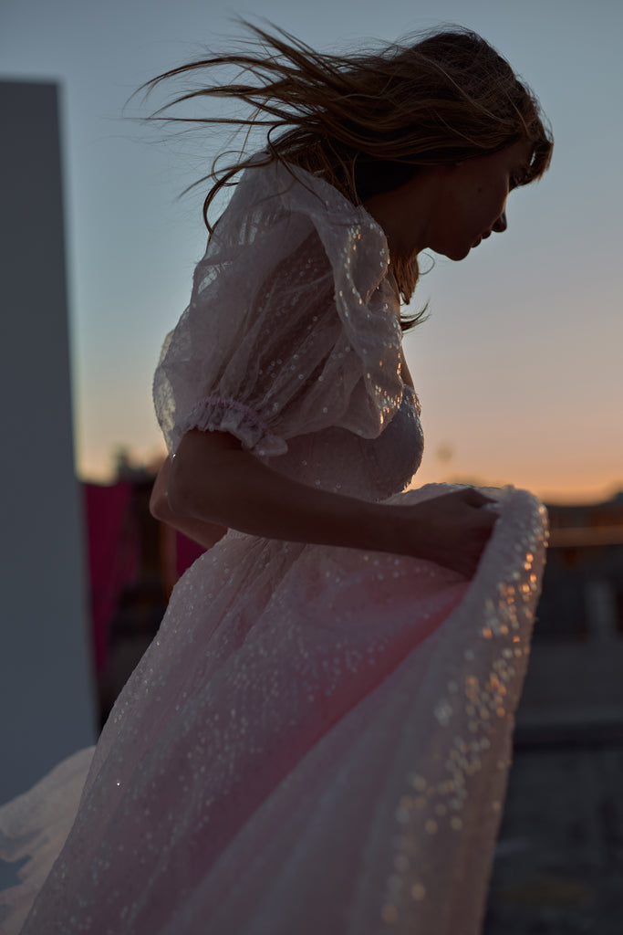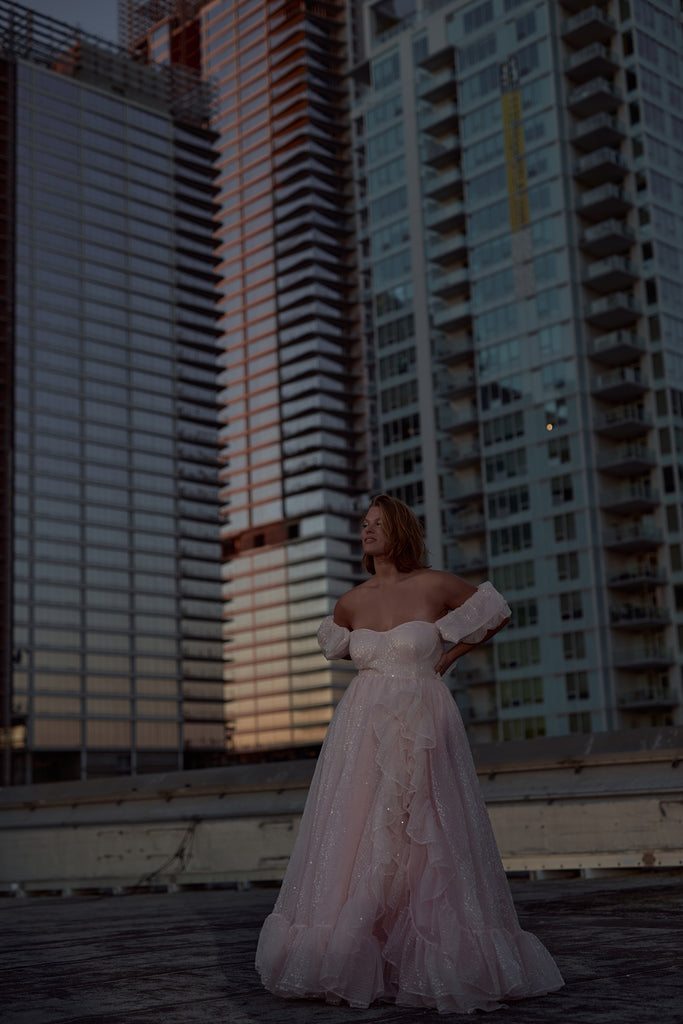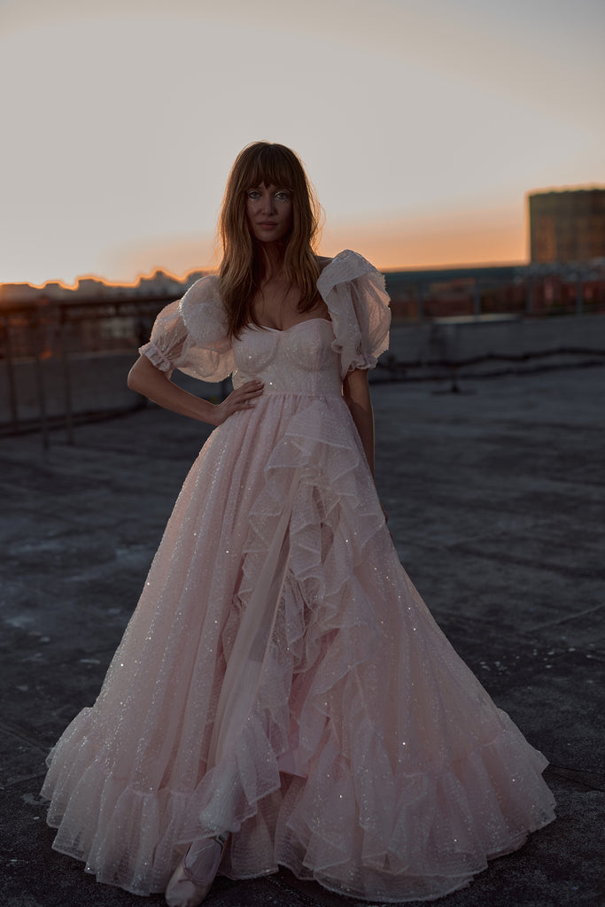 While ringing in the New Year, you are the drama. At least you will be when you show everyone up by wearing this nostalgic piece of rose-hued heaven. Layers of voluminous skirt feature a giant ruffled slit, while special shoulder ruffles accentuate the sleeves, and underwire cups accentuate the silhouette. Hook and eye closure for slit adjustability. Fully lined with cotton. Sparkling evokes the rosy glow of a Winter sunset. Pink and glistening, like delicately sweetened sugar plums.