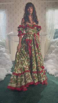 Adorned with classic holly and berries, this silk organdy gown brings Victorian Christmas elegance to your most important moments. Full cups with underwire provide beautiful structure, while Selkie's signature puff sleeves feature velvet bow details that echo vintage tree ornaments. Dramatic contrast lace throughout and a pleated ruffle hem create unforgettable presence. Perfect for Christmas Eve services, holiday galas, or being the most photographed guest at every seasonal celebration.