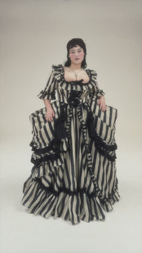 Drawing from the atmospheric beauty of Sleepy Hollow and inspired by the striped gown worn by Virginia Saint George in the 90s TV miniseries "The Buccaneers," this silk organdy Antoinette gown captures the romantic drama of period costume design. Pleated ruffle details cascade throughout the flowing silhouette, while decorative bows add romantic flourishes at key points. Mid-length sleeves feature dramatic bubble cuffs that create sculptural volume, and structured waist boning ensures a refined fit. The bustle construction adds graceful movement and dreamy volume, completing this wearable work of art.