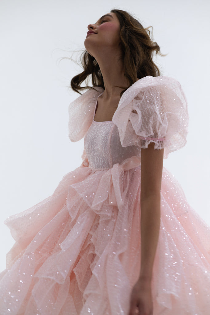Like a Vegas performer straight out of a neon-lit fantasy, this ball of fun, sequined stunner dares you to bask in all the admiring gazes. With a fitted, shimmering empire waist pouring into layers of dramatically voluminous organza skirt, it dances unabashedly like "Showgirls'" Nomi Malone. An adjustable corset back sculpts an hourglass silhouette before the asymmetric skirt reveals a provocatively ruffled slit. Topped with bows at the front and back waistline and puff sleeves kissed in flirty shoulder ruffles, this decadent showstopper is tailored for a sinfully good time on the Strip.