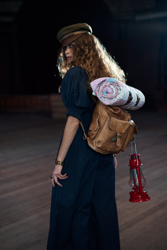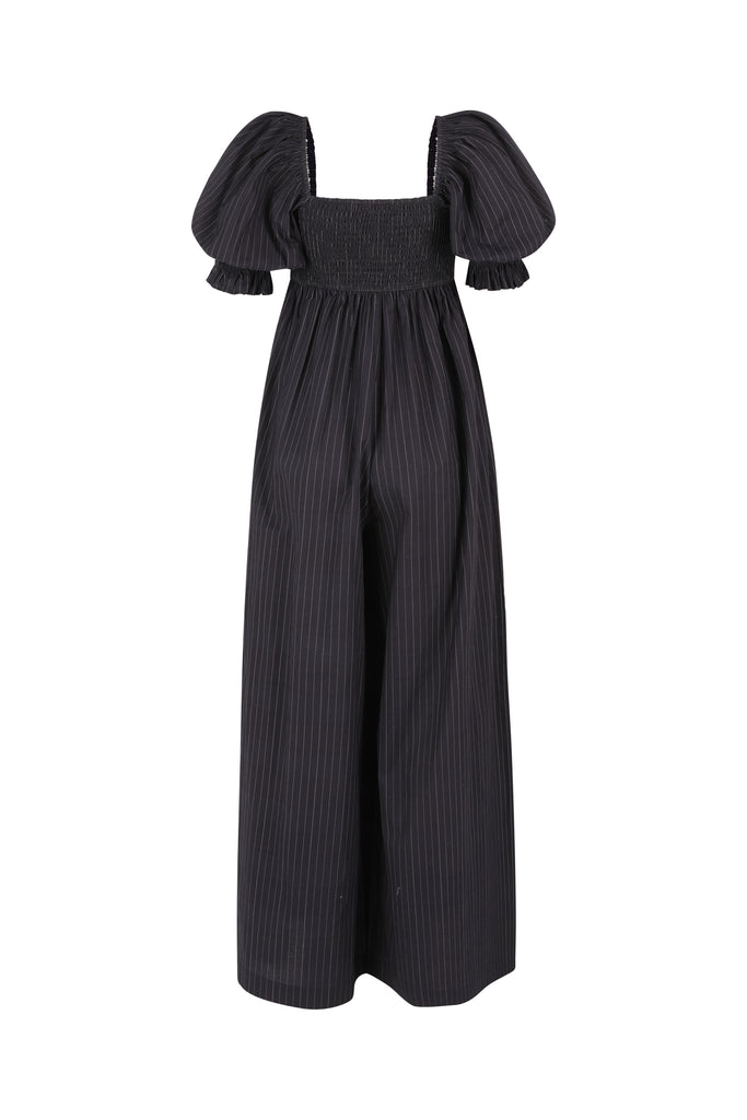 The Pinstripe Hamptons Jumpsuit reimagines men’s suiting with a feminine twist. A charming square neckline frames your décolletage, complemented by billowing puff sleeves and a sweeping wide-leg design, perfect for graceful movement. The smocked back panel provides an adjustable, flattering fit, transforming sleek pinstripes once reserved for the baseball field and boardroom into something altogether feminine.