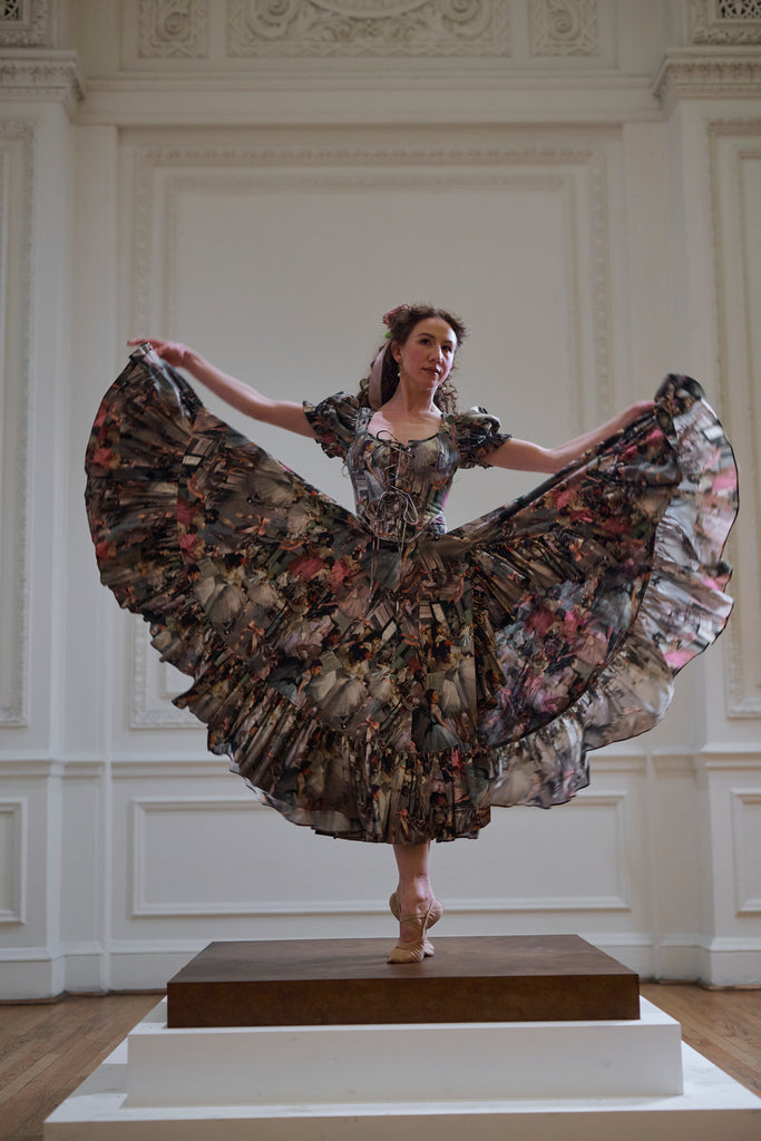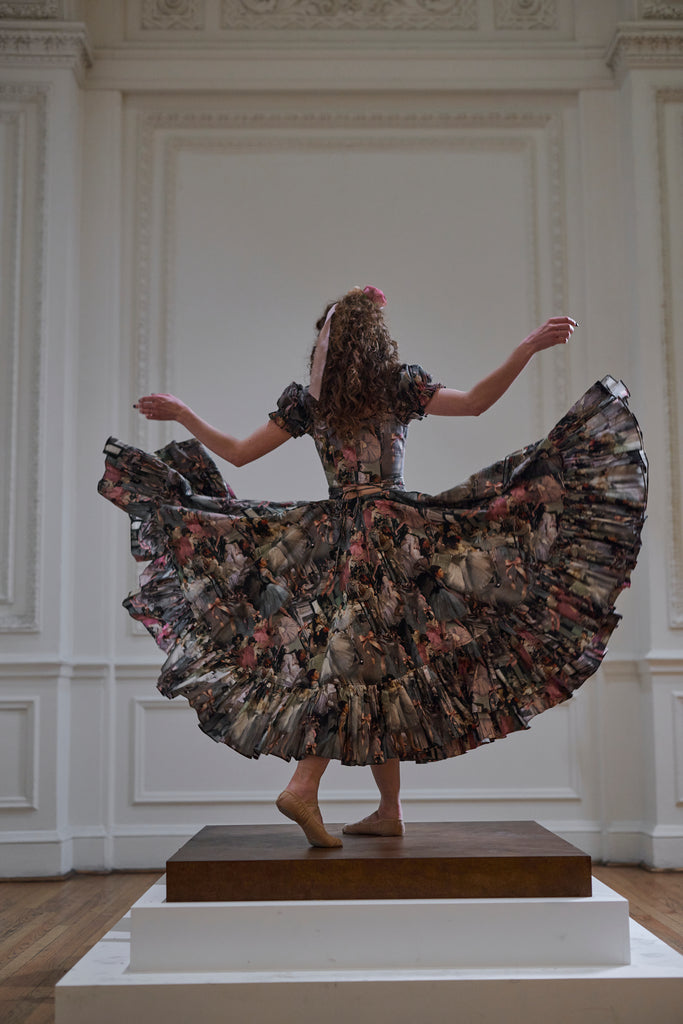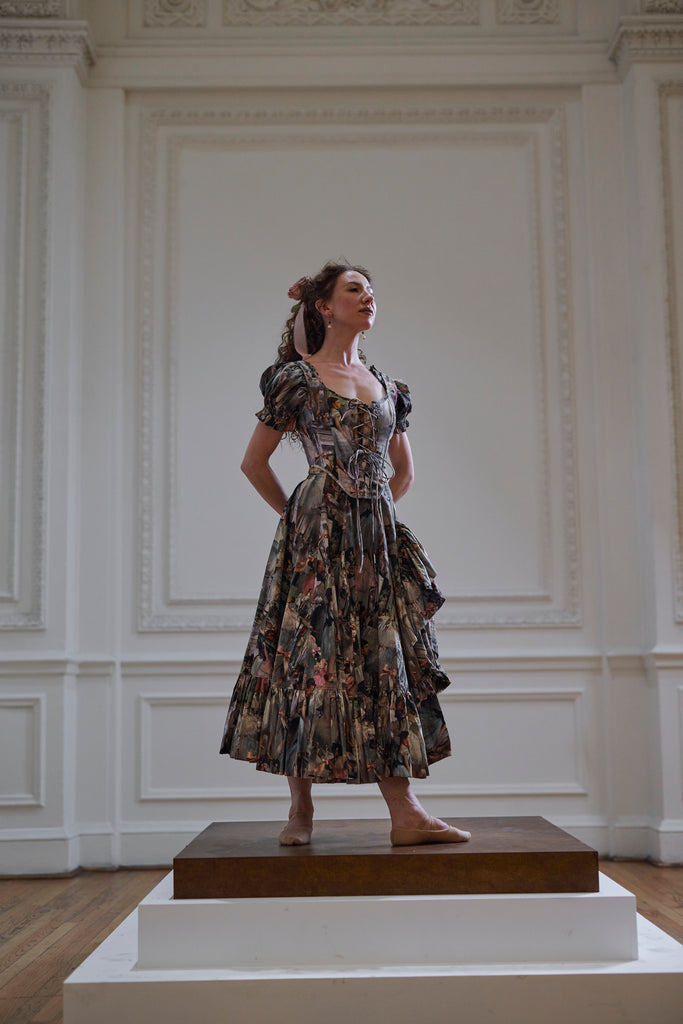 Our cotton Foxglove midi dress showcases a custom print honoring Degas' "The Dance Class," which captured the raw beauty of ballerinas in their natural state—stretching, resting, and preparing—rather than in polished performance. The romantic design features puff sleeves and a tie bust, while the ruffled slit creates a silhouette that moves with dancer-like grace as you twirl about your day.