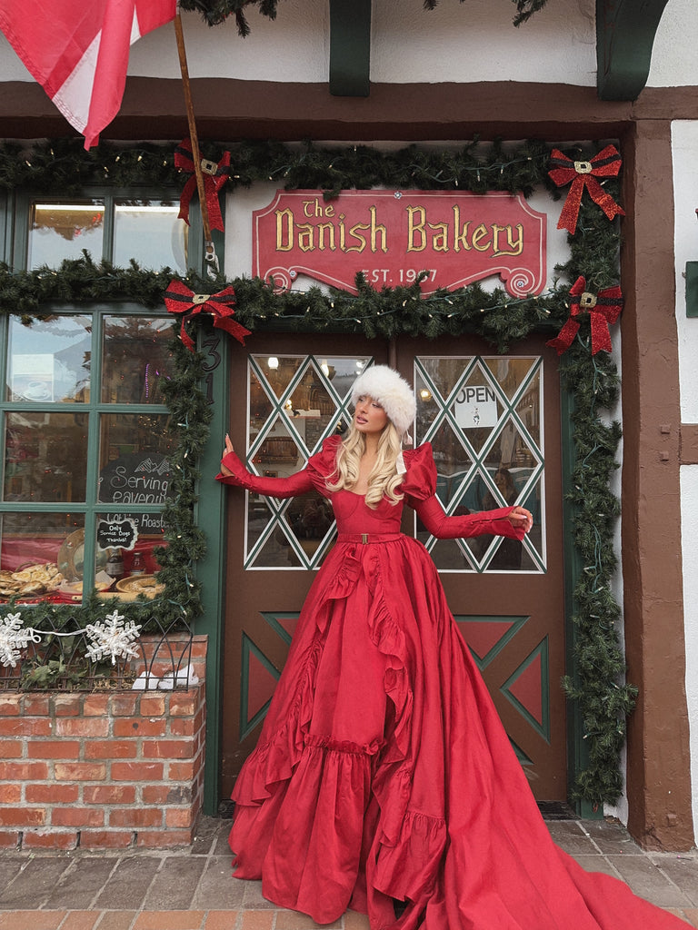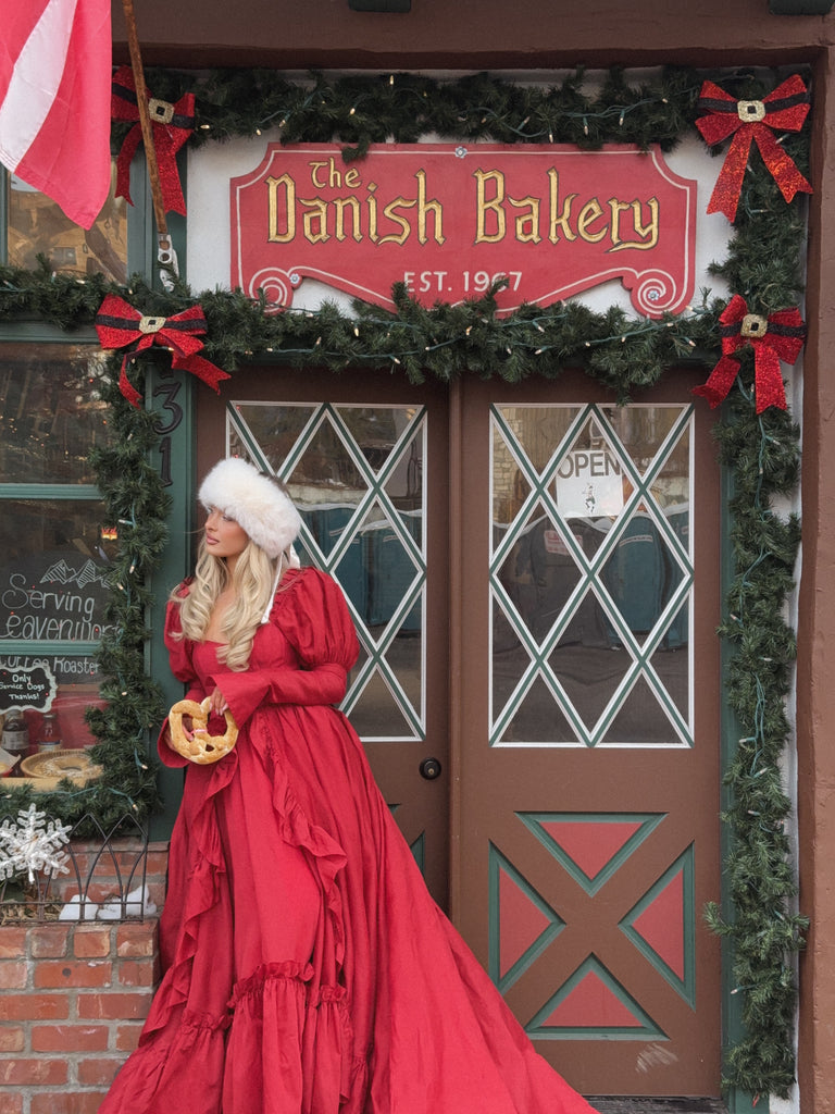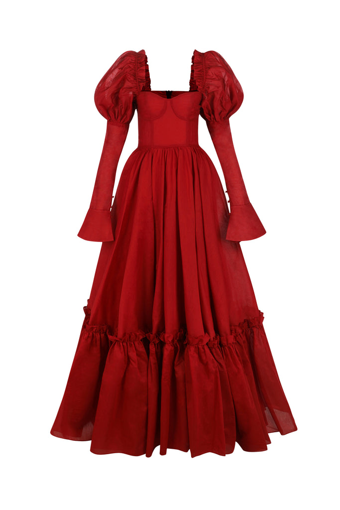 Wreathed in holiday splendor, the Astronomer's Gown returns in rich rouge after selling out in our previous star print. The structured bodice and sweeping length evoke yuletide romance, while Selkie's signature mutton sleeves taper to long, buttoned cuffs. When paired with our matching Tournure skirt, it creates an unforgettable Little Women moment. A cornerstone of our holiday collection, this beautiful gown is an investment piece you can keep in your family for generations.