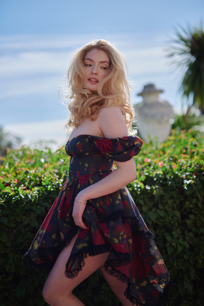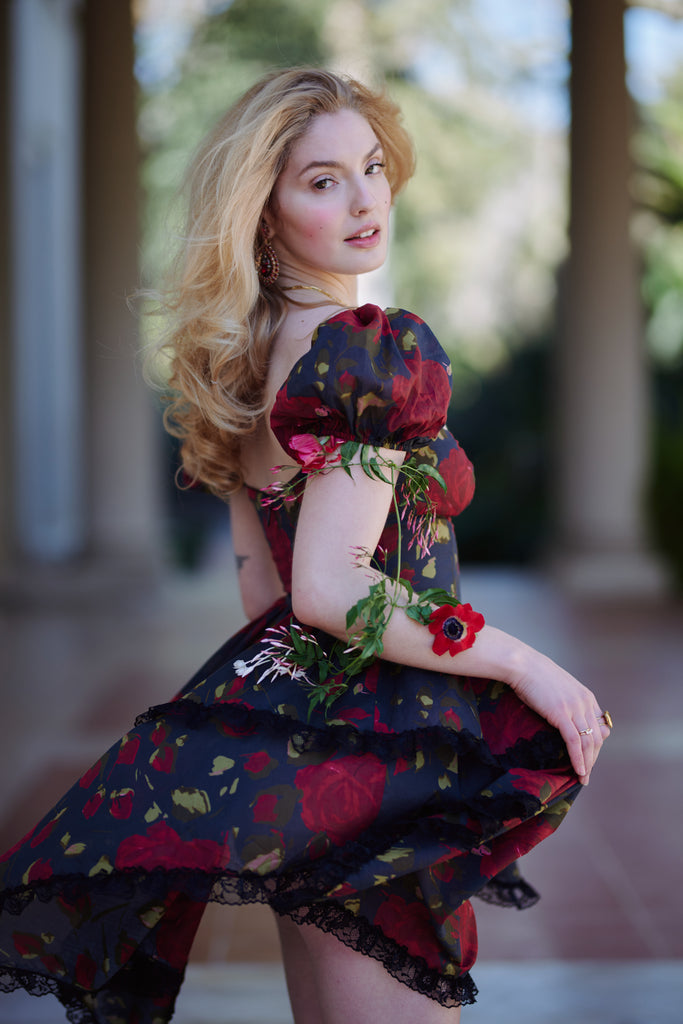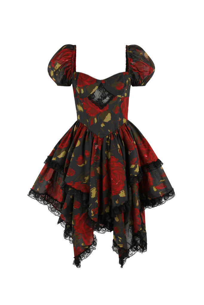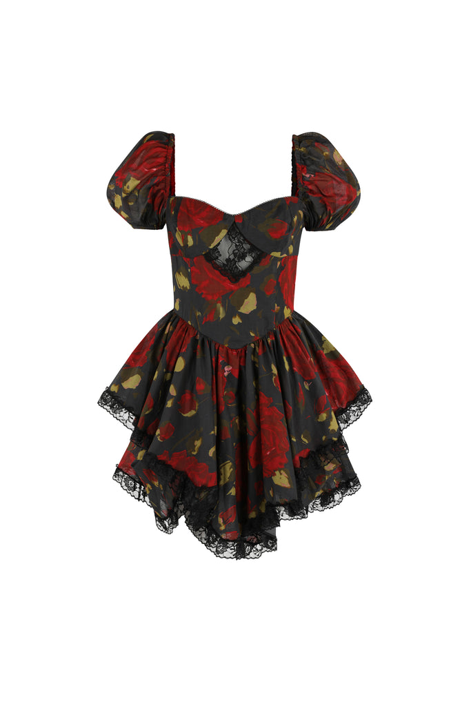 This sheer cotton gauze mini dress blooms in our Eden print, a darkly romantic 90s rose pattern from Selkie founder Kimberley Gordon's cherished coming-of-age memories. This handkerchief-style piece features dreamy elastic puff sleeves and a sheer lace detail at the bust. The petticoat bustles into a mini skirt for added volume, perfect for looking stunning while running into your lover’s arms.