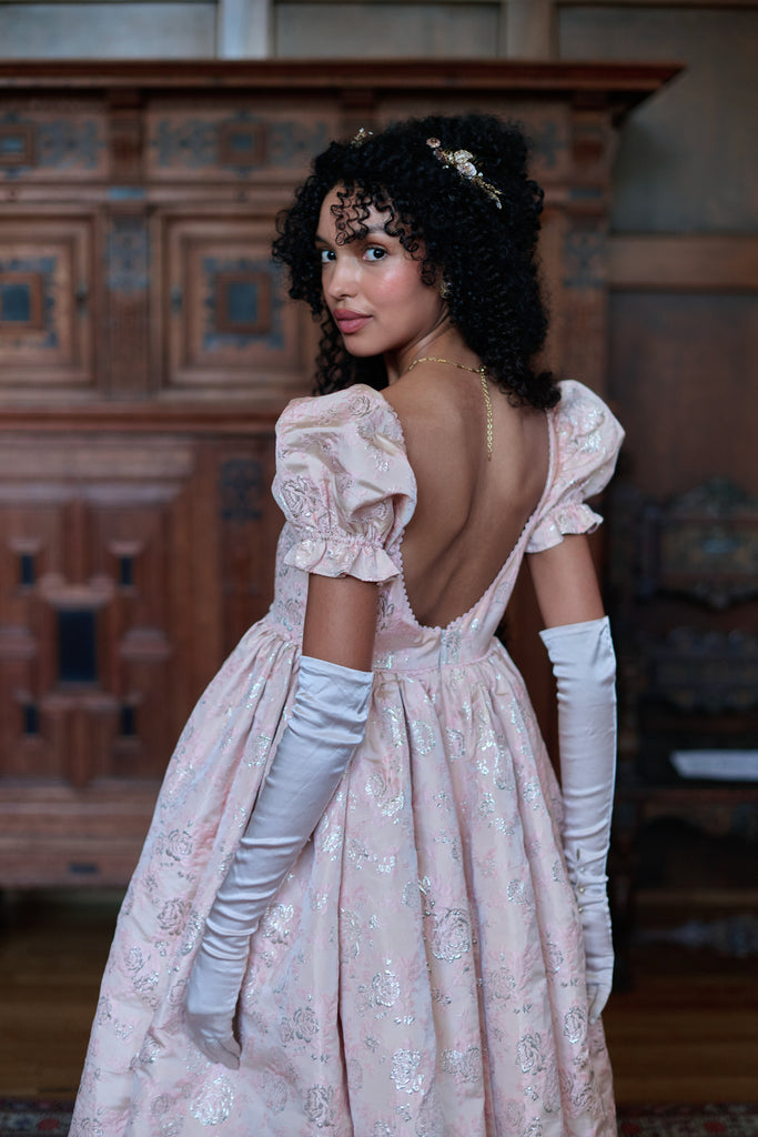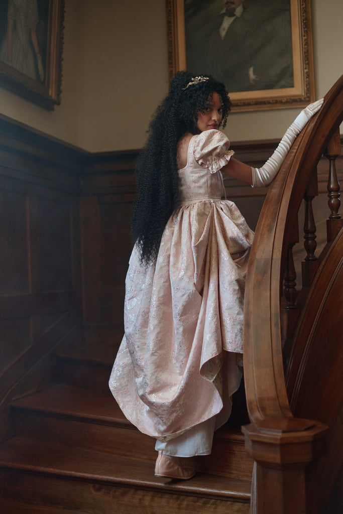 Sweep into the ballroom in this floor-length empire waist dress, showcasing an exquisite rose gold brocade woven with lustrous gold threads. The gown features two layers of gossamer-fine organdy petticoats that can be bustled three different ways for dramatic effect. Subtle contrast trim frames and highlights the neckline, making you the talk of the social season.