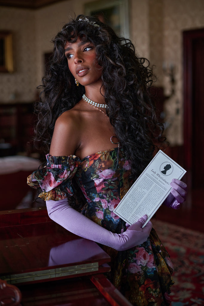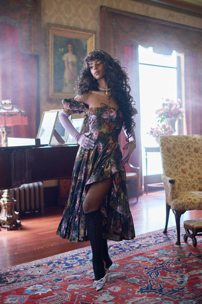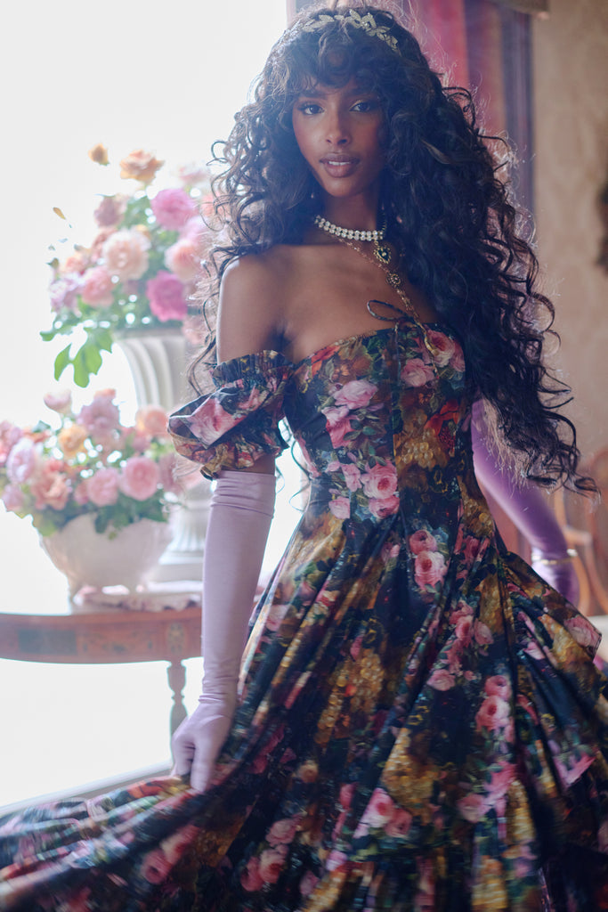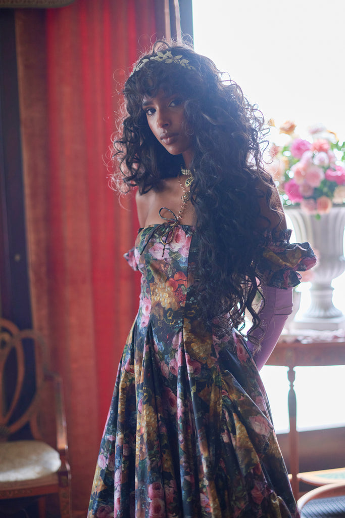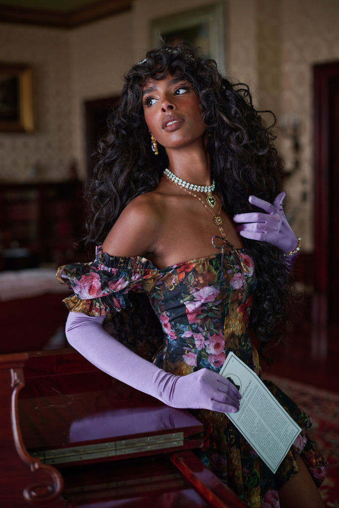 The Genevieve Foxglove Dress, crafted from soft cotton, features puff sleeves and a feminine tie bust, showcasing a dramatic tableau of lush, vibrant blooms against a midnight-black canvas. Perfect for an evening soirée in a candlelit ballroom, its ruffled slit allows for graceful movement as you waltz with potential suitors or engage in witty repartee over glasses of sparkling champagne.