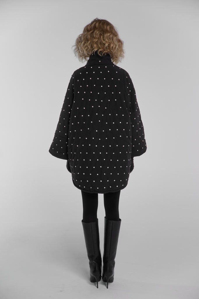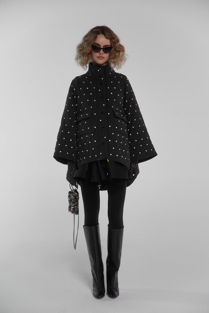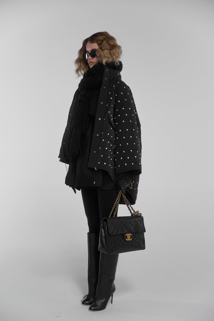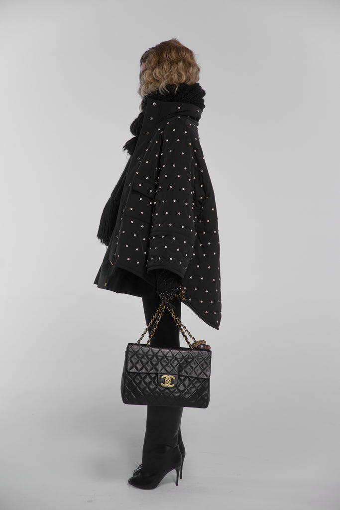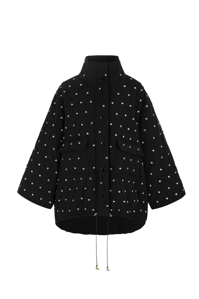 The coat you throw on before dashing across cobblestones into the cold Parisian night. Oversized quilted puffer with rhinestone detailing, high neck collar, and drawstring cuffs that cinch against the frost. Large pockets for compact mirrors, rouge pots, and whatever else you’ll need at 4AM. Metal snap closures make quick exits easy, whether you're headed to Zelli's or the Grand Hotel.