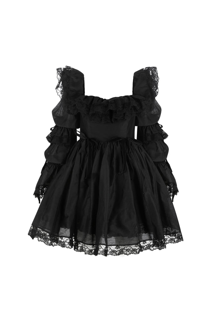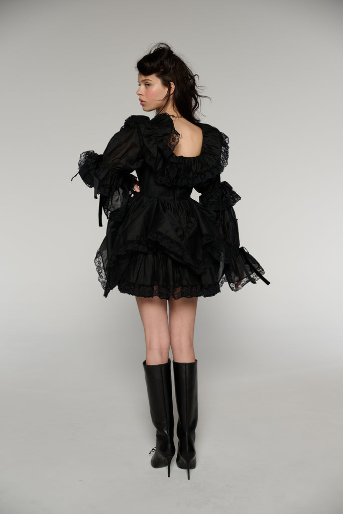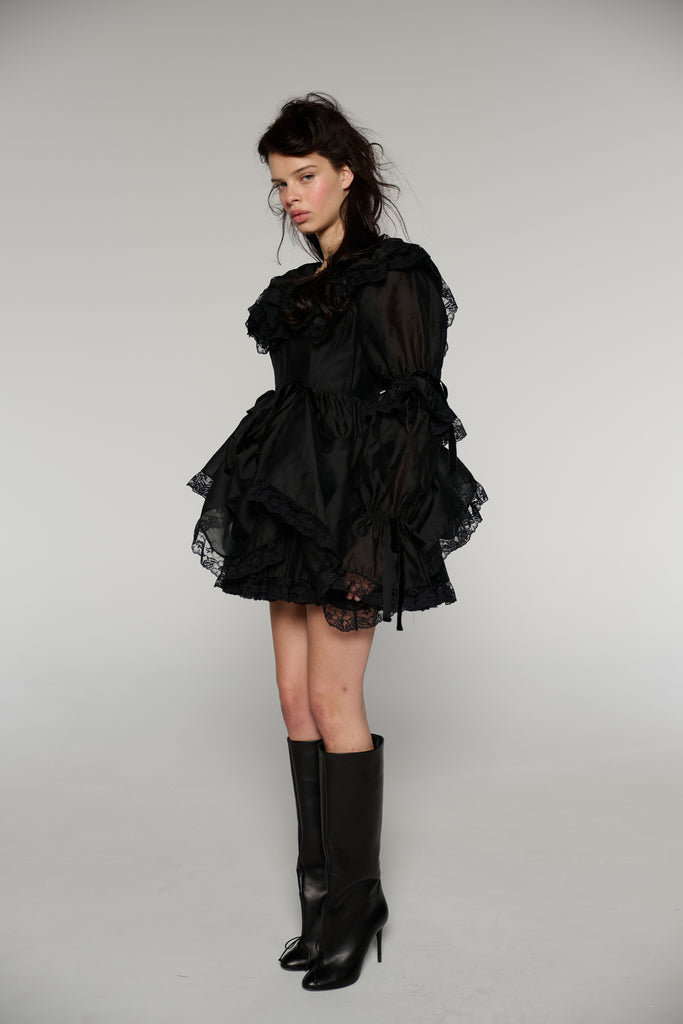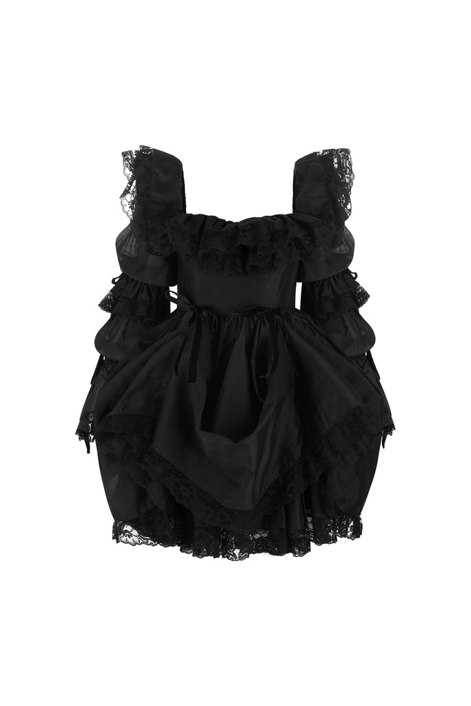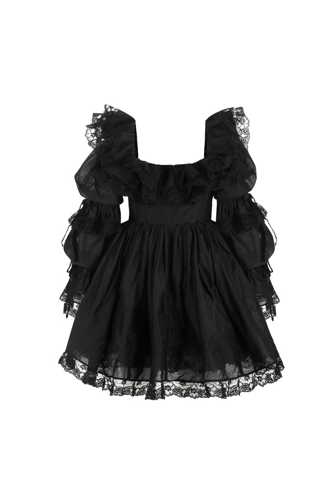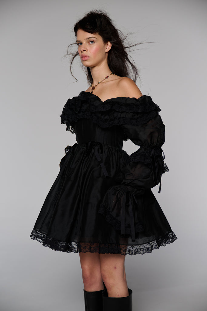 Crafted in silk organdy with delicate ruffled lace trim, this mini dress features cinched bubble sleeves and charming bow details at the waist and cuffs. The voluminous skirt bustles through elastic loops and fabric-covered buttons for a customizable silhouette.