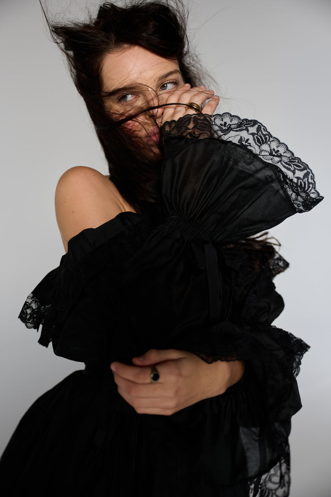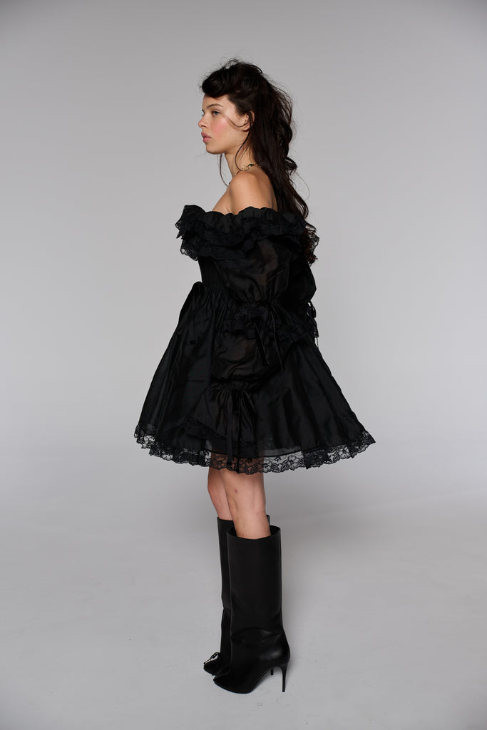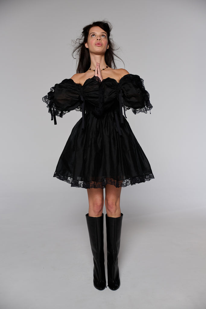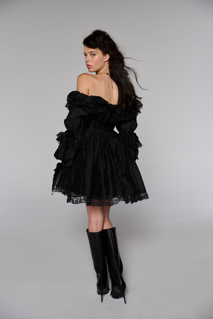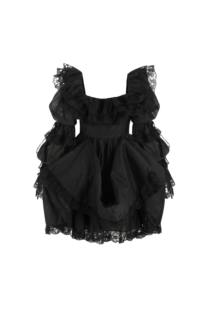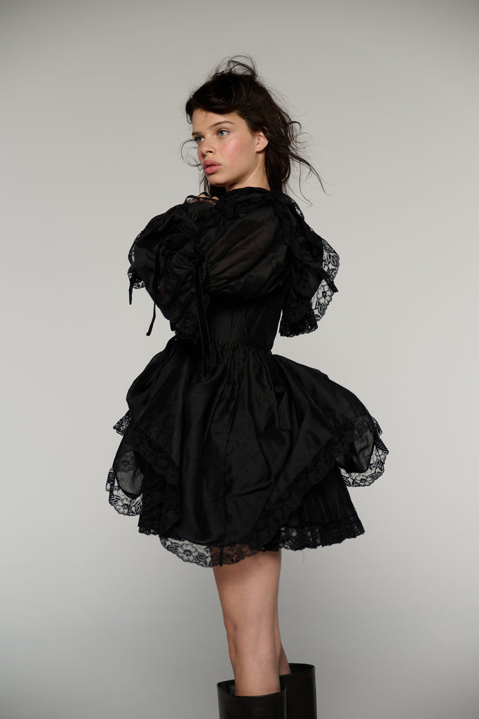 Crafted in silk organdy with delicate ruffled lace trim, this mini dress features cinched bubble sleeves and charming bow details at the waist and cuffs. The voluminous skirt bustles through elastic loops and fabric-covered buttons for a customizable silhouette.