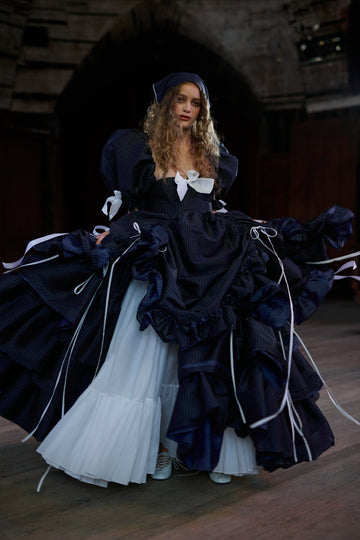 Dive into a Hans Christian Andersen dreamscape with this magnificent pinafore gown, a true treasure for Selkie collectors. Inspired by the little mermaid's first royal banquet on land, this extravagant creation features enormous ruffled sleeves and a stunning white cotton petticoat peeking beneath a bustled ballgown skirt. Signature Selkie bows adorn the bust and sleeves, while pinstripes hint at repurposed men's suiting transformed into something exquisitely feminine. With poly organdy full cups, waist boning, and adjustable drawstring bustles, you'll maintain poise whether using a fork for the first time or twirling through a fairytale ball.