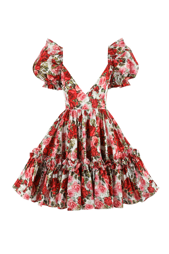 Since you might wake up in the same outfit, you might as well make it a stunner. Our Girls Night dress captures the magic of perpetual bloom, featuring Selkie founder Kimberley Gordon's signature rose print inspired by Alice's painted garden. Short and sexy meets cottage-core-obsessed. Featuring ruffled puff sleeves and a voluminous mini skirt with a ruffle hem. Its dramatic V-neck and even lower back will make you feel as tempting as a chocolate-dipped strawberry. Wear it braless for some risky business or pair it with red and pink undergarments for a pretty little reveal. Grab your girls and a matching purse. Can you add whipped cream to this martini, please?