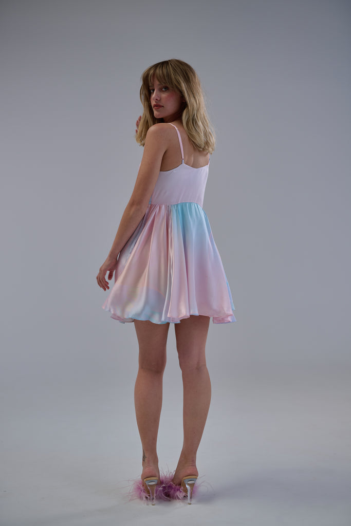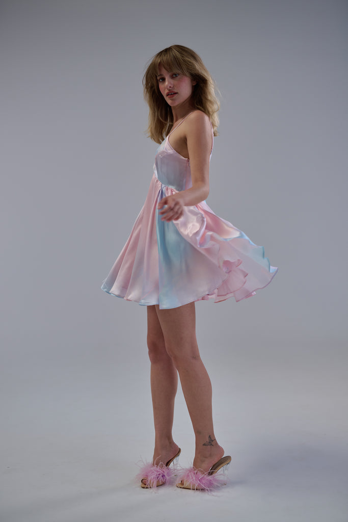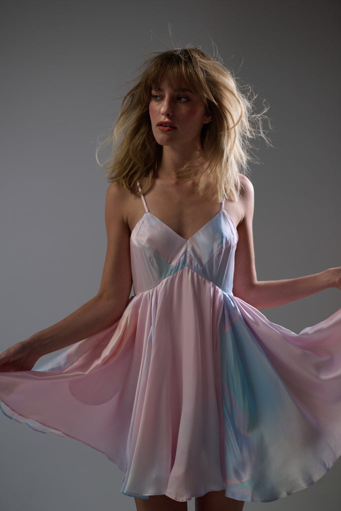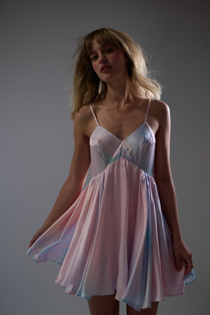 This vintage silk mini slip dress features the Shine print, which draws inspiration from the internal rainbow spectrum visible when closing your eyes. Thin adjustable straps ensure the perfect fit, while the double-lined construction provides both comfort and regal elegance. A dreamy silhouette for those who sense beauty in the subtlest details of the natural world.