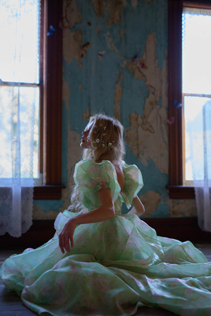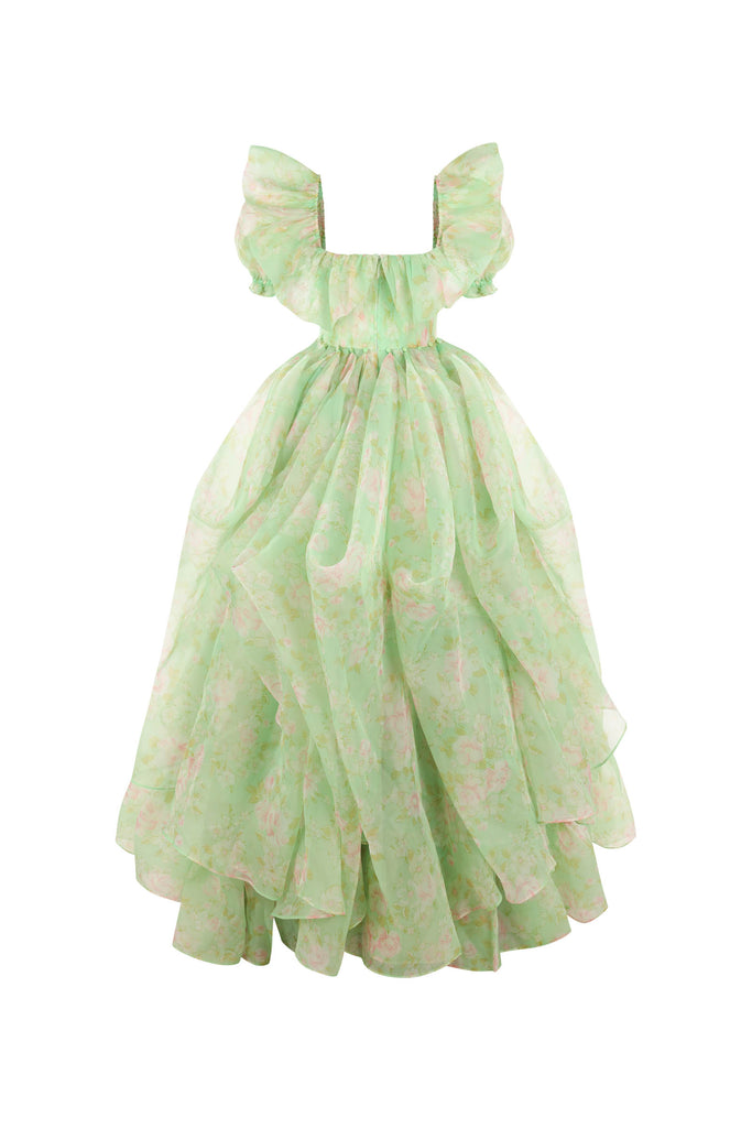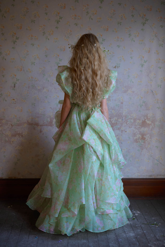 This is a gown fit for a rather *provocative* queen, featuring a liberally drawn ruffled leg slit, and layers and layers of voluminous skirt. Against an acid green backdrop, vivid blush and pearl blooms burst forth in a mesmerizing, hallucinogenic floral display, while the shoulder ruffles at the sleeve and underwire cups highlight the bust. The devastatingly dramatic bustling skirt—which can be worn bustled up for a bouffant effect or down for a seriously glamorous train—is the standout feature of this unforgettable gown.