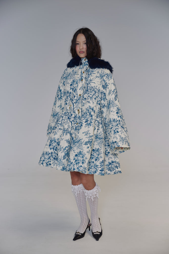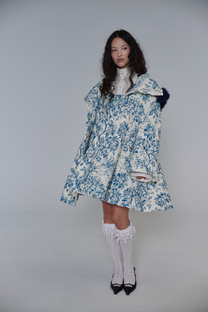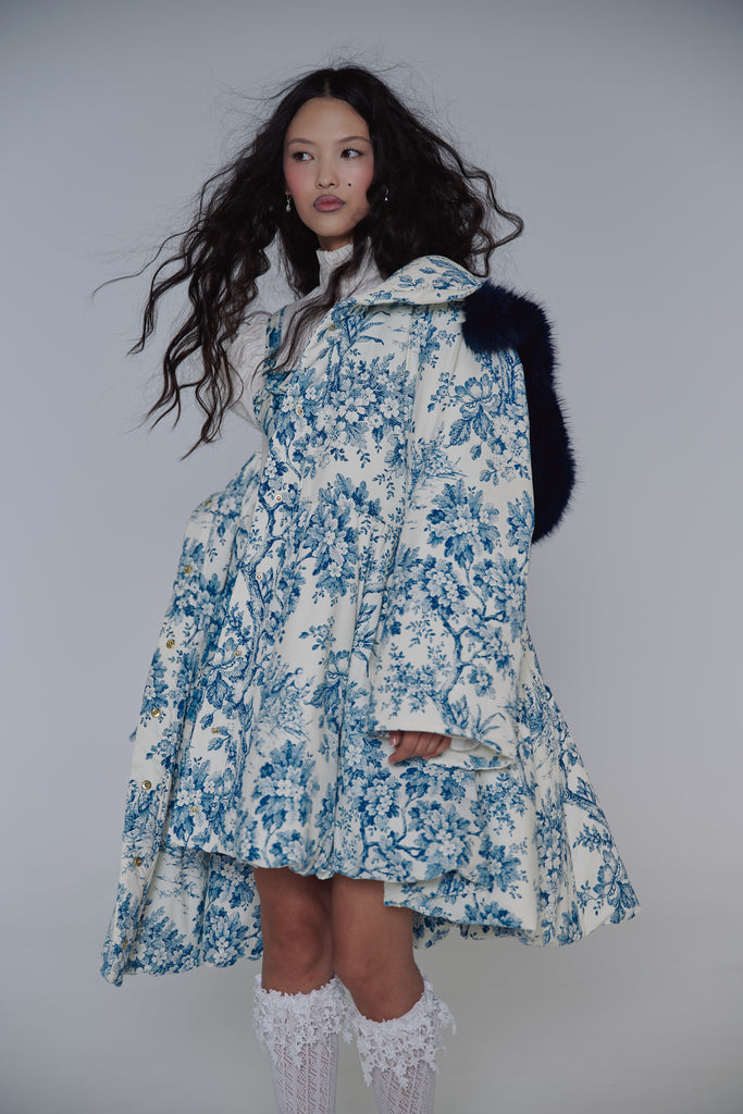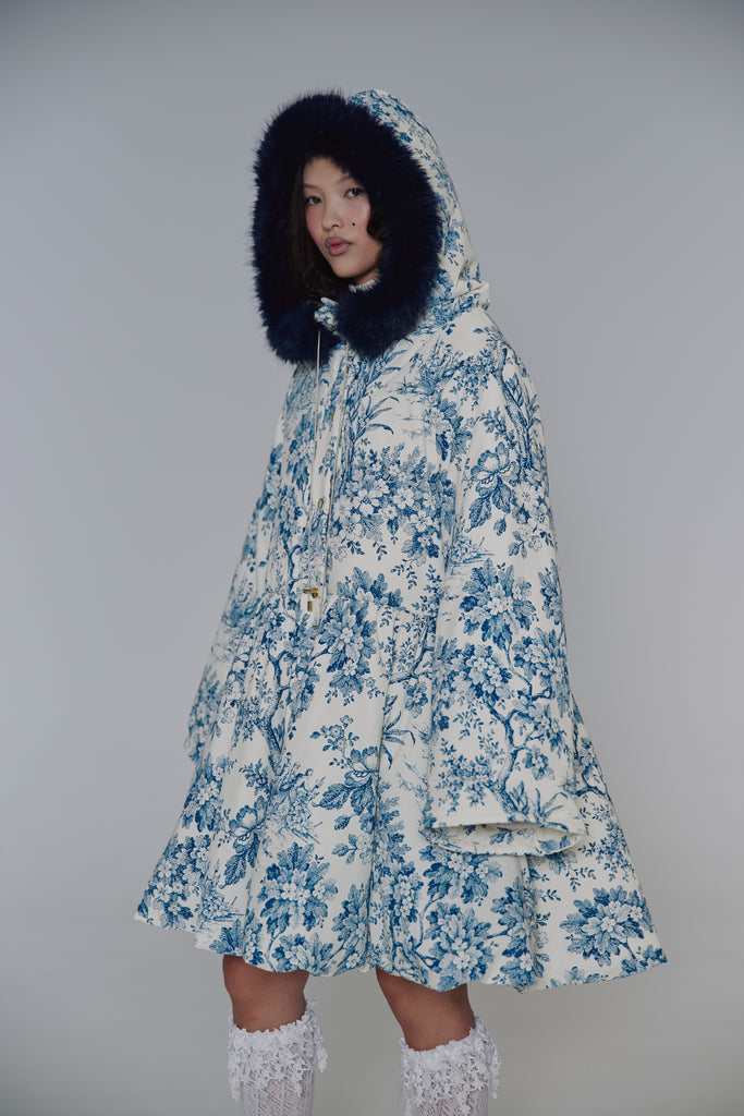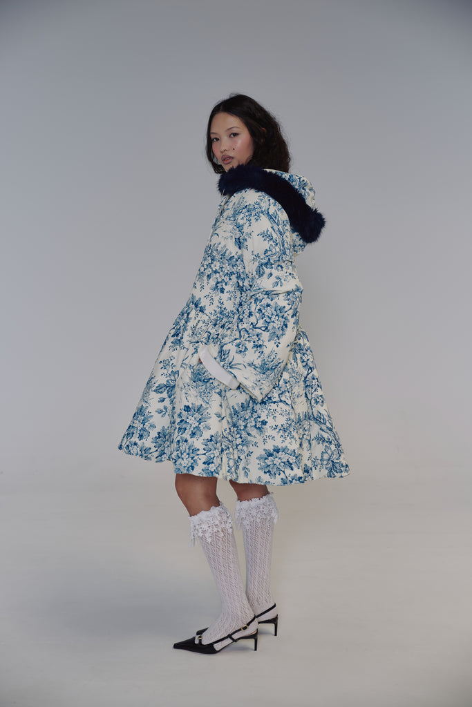 This oversized quilted puffer is adorned with intricate blue toile pastoral scenes that echo the refined artistry of Mozart's Vienna. The generous hood features luxurious faux fur trim, while the quilted construction provides warmth. Cinched at the waist with pleats cascading over the hips, this coat captures the theatrical grandeur of Amadeus's world, where music and artistry flourished in opulent court salons.