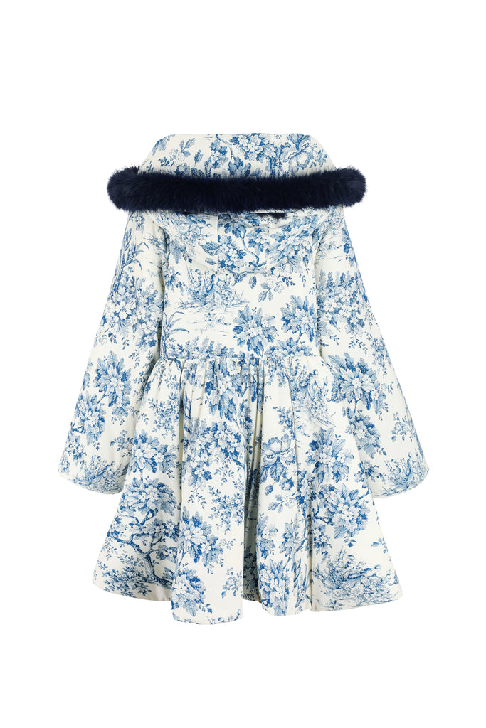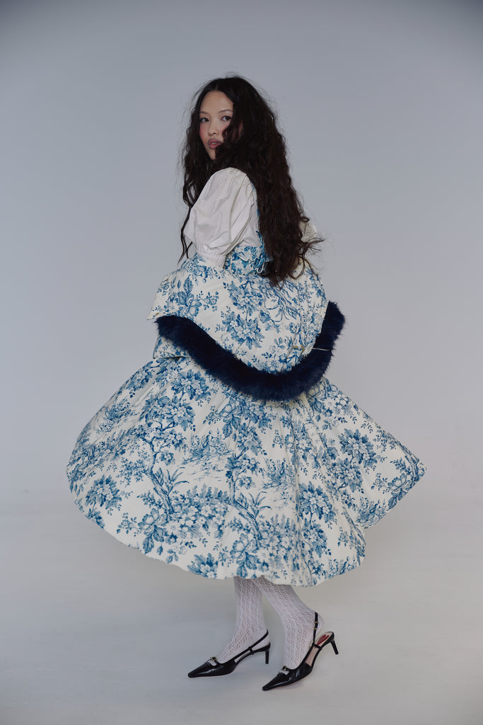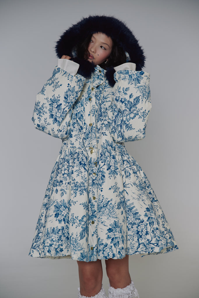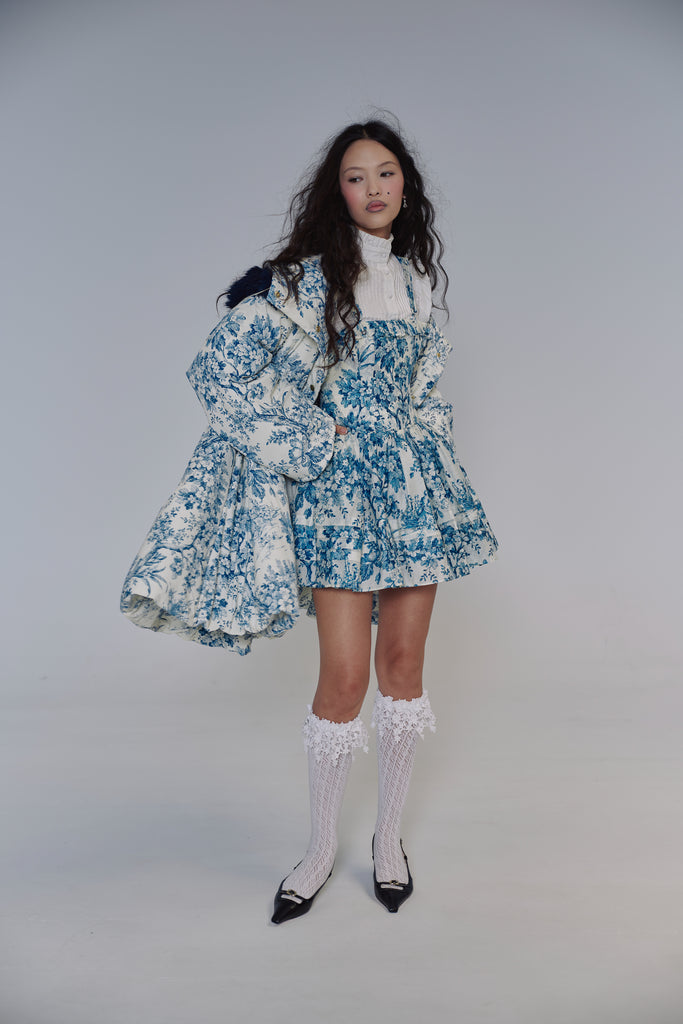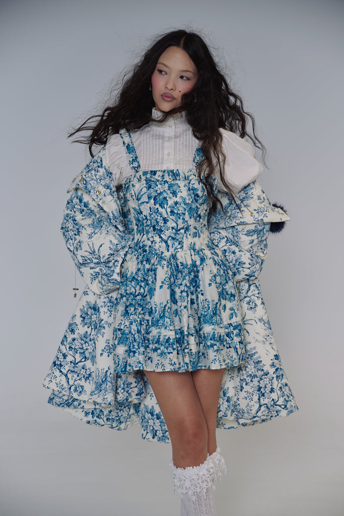 This oversized quilted puffer is adorned with intricate blue toile pastoral scenes that echo the refined artistry of Mozart's Vienna. The generous hood features luxurious faux fur trim, while the quilted construction provides warmth. Cinched at the waist with pleats cascading over the hips, this coat captures the theatrical grandeur of Amadeus's world, where music and artistry flourished in opulent court salons.