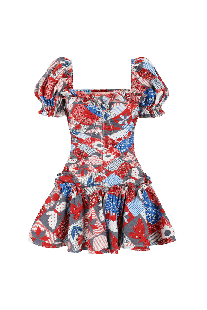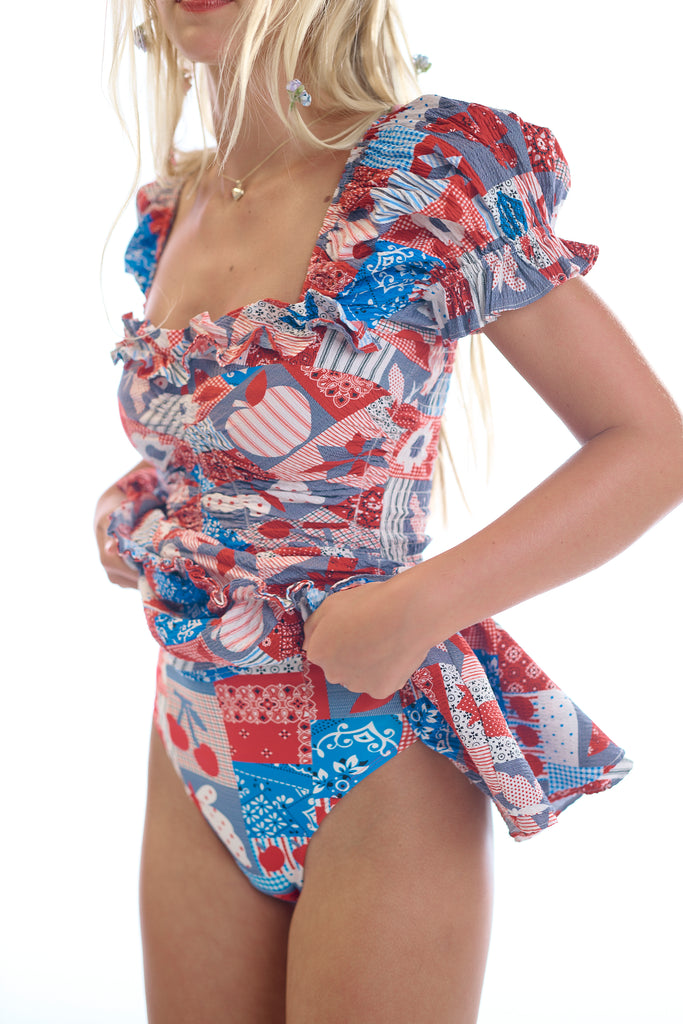 Cancel your bikini wax and channel the bathing beauties of the 1940s and 50s in the Shortcake Suit, a seersucker cotton mini swimmable tankini that effortlessly blends modesty and charm, accompanied by stretchy bikini bottoms. The American Pie print features vintage patchwork discovered on beautiful old 70s handkerchiefs by Selkie founder Kimberley Gordon, capturing the nostalgic essence of another era. The puff sleeves and drop waist create a vintage silhouette, while the ruffle skirt, smocked back, and whipped cream ruffles at the bust make you look wholesome and sweet as dessert.