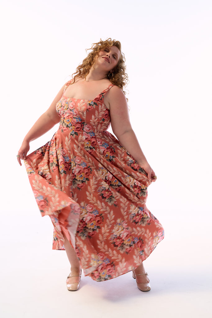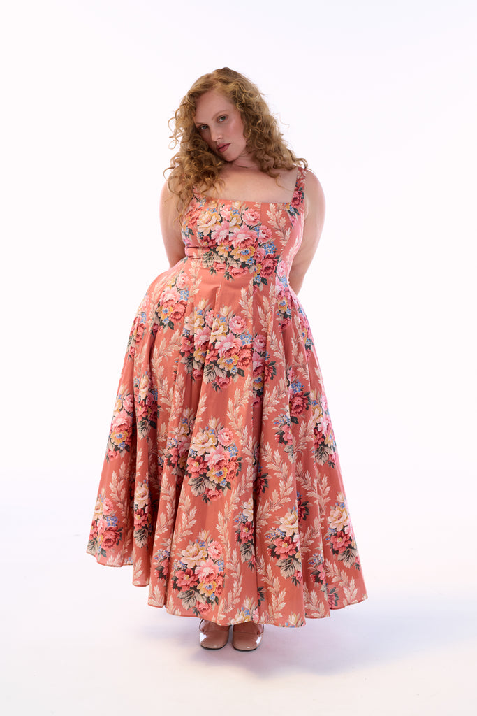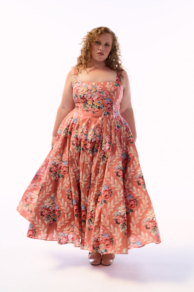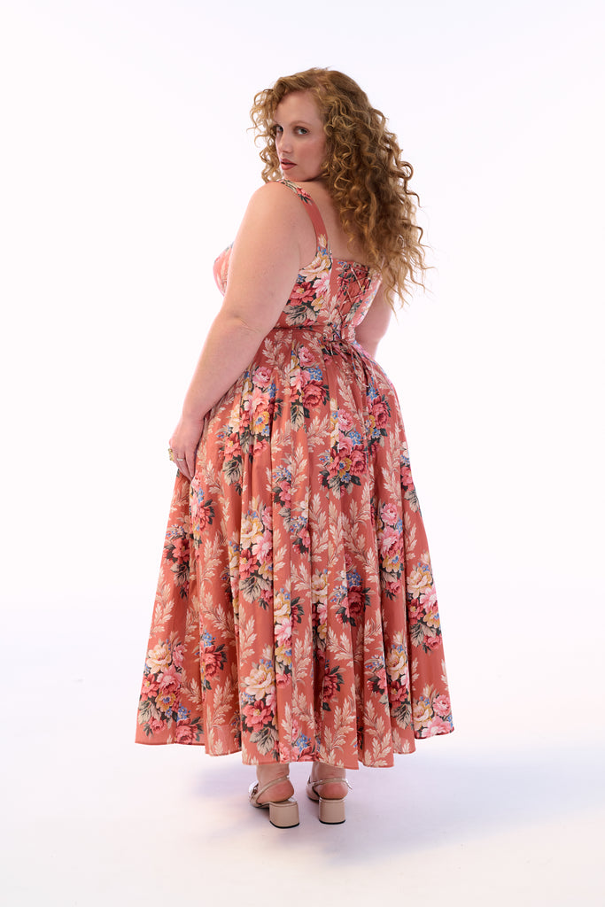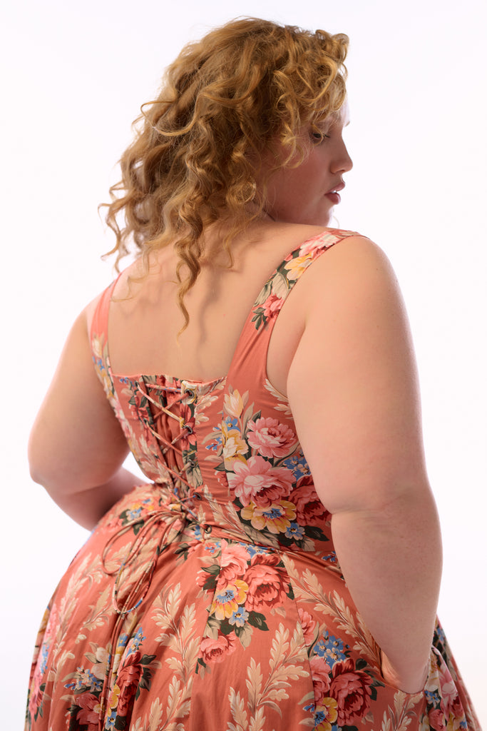 Adorned with an autumnal floral in rich seasonal colors that evoke the beauty of changing leaves, this sleeveless paper cotton midi dress features corset back lacing with a modesty panel, hidden pockets, and curve-skimming princess seams to shape a soft, feminine silhouette.